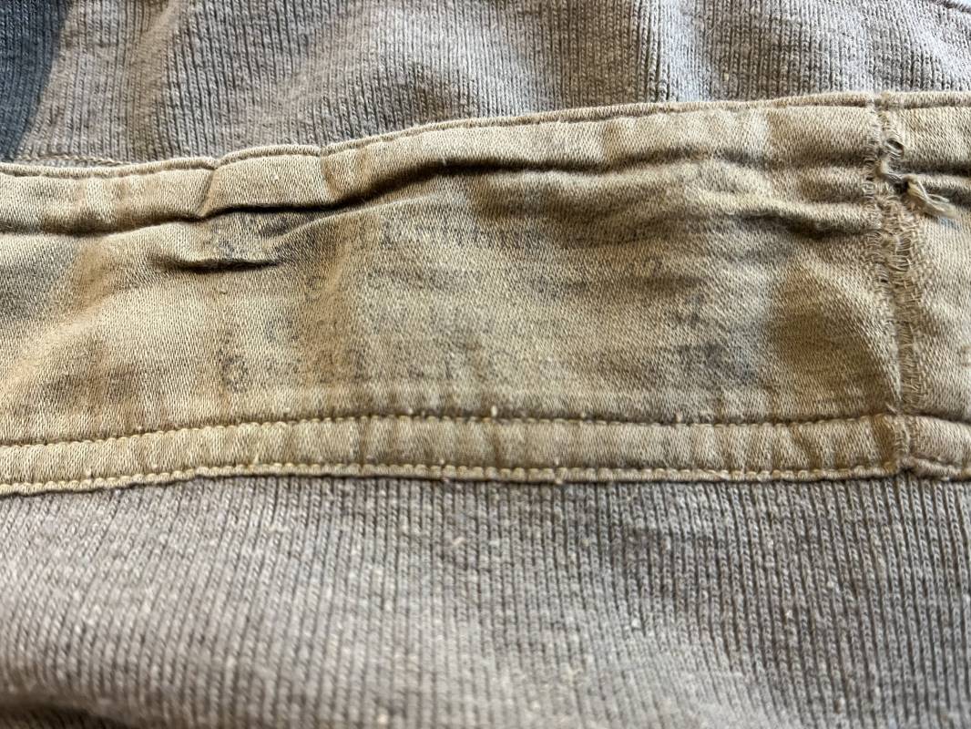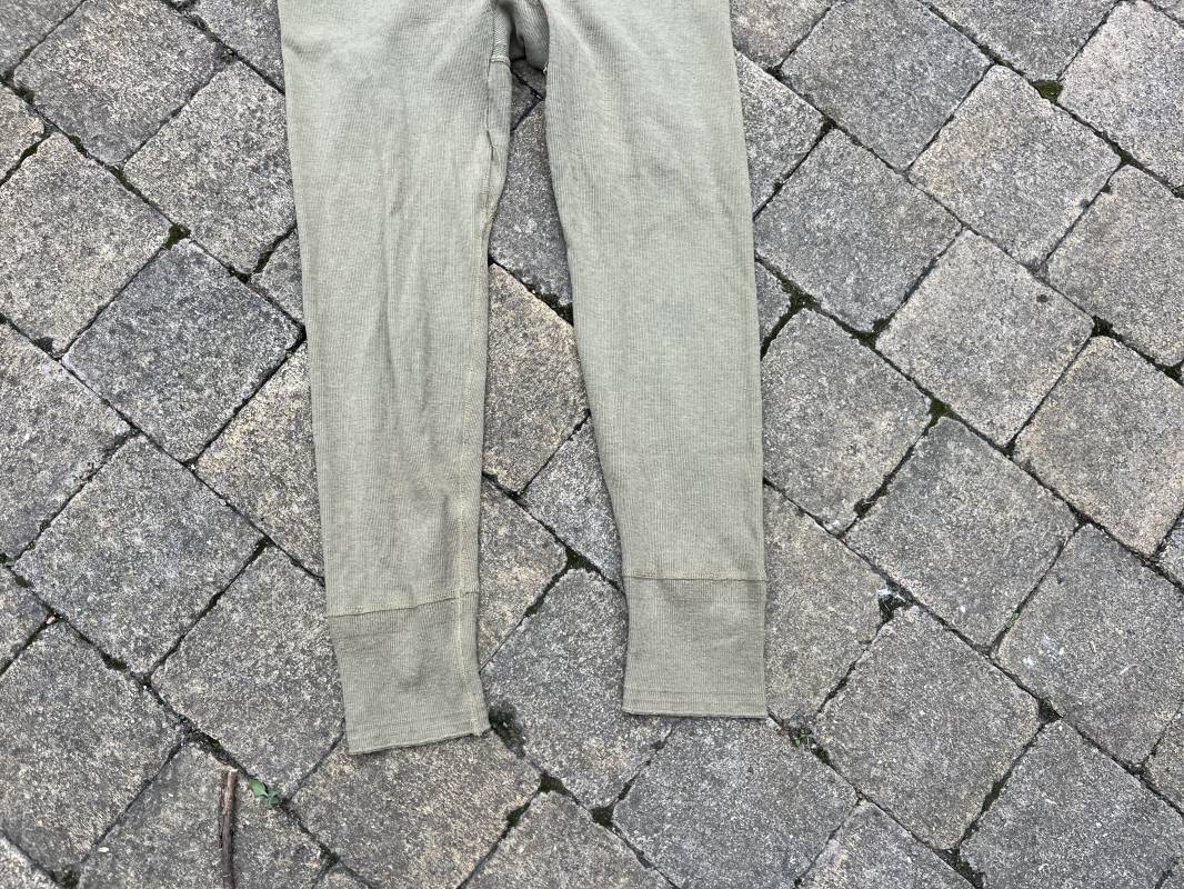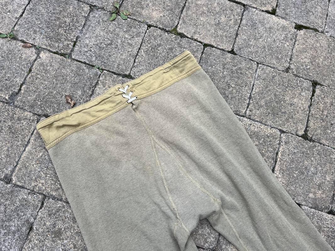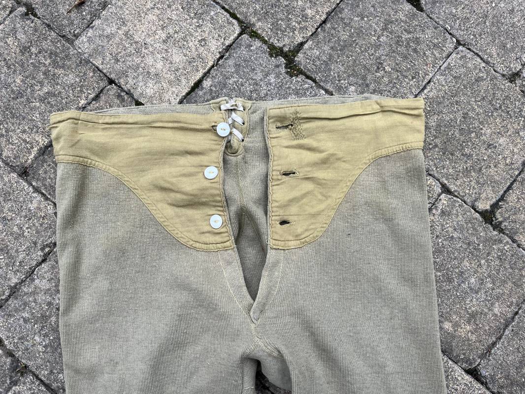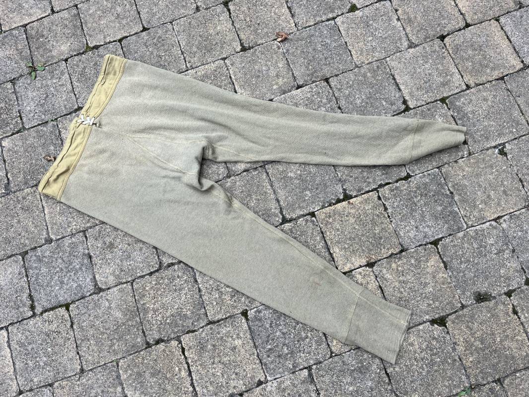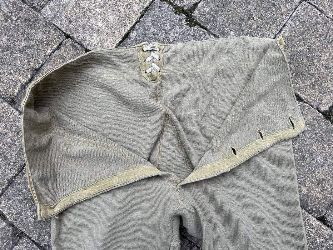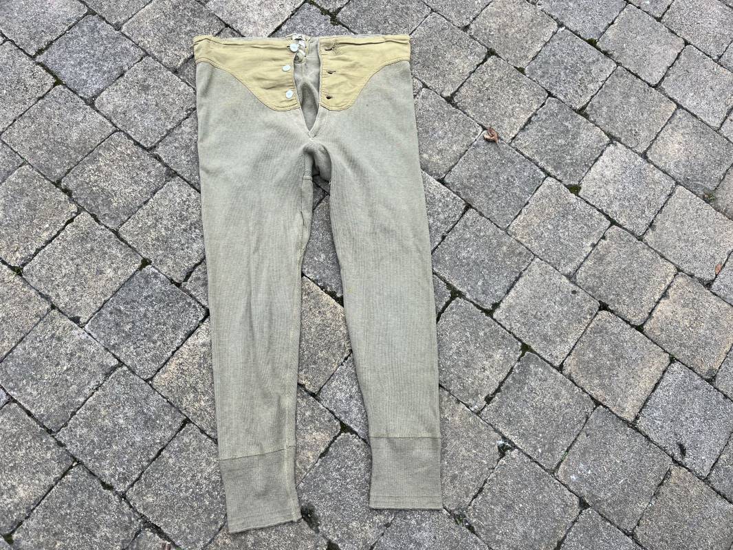 Calecon long d hiver en coton olive drab . Fermeture sur le devant par trois boutons , lacet de reglage au dos , Marquage encre noire fabricant daté Septembre 1942 Porté en bel état Taille 40 Longueur 90 cm . Ref 21304
