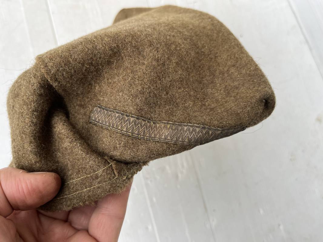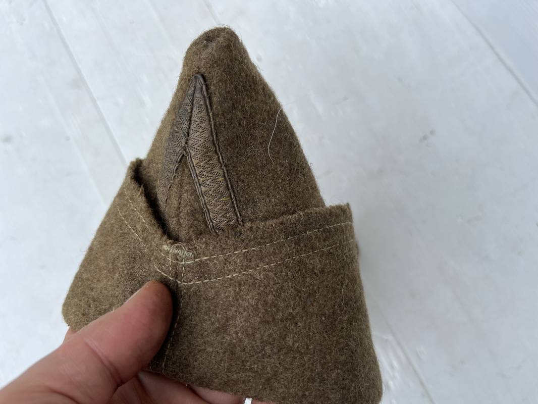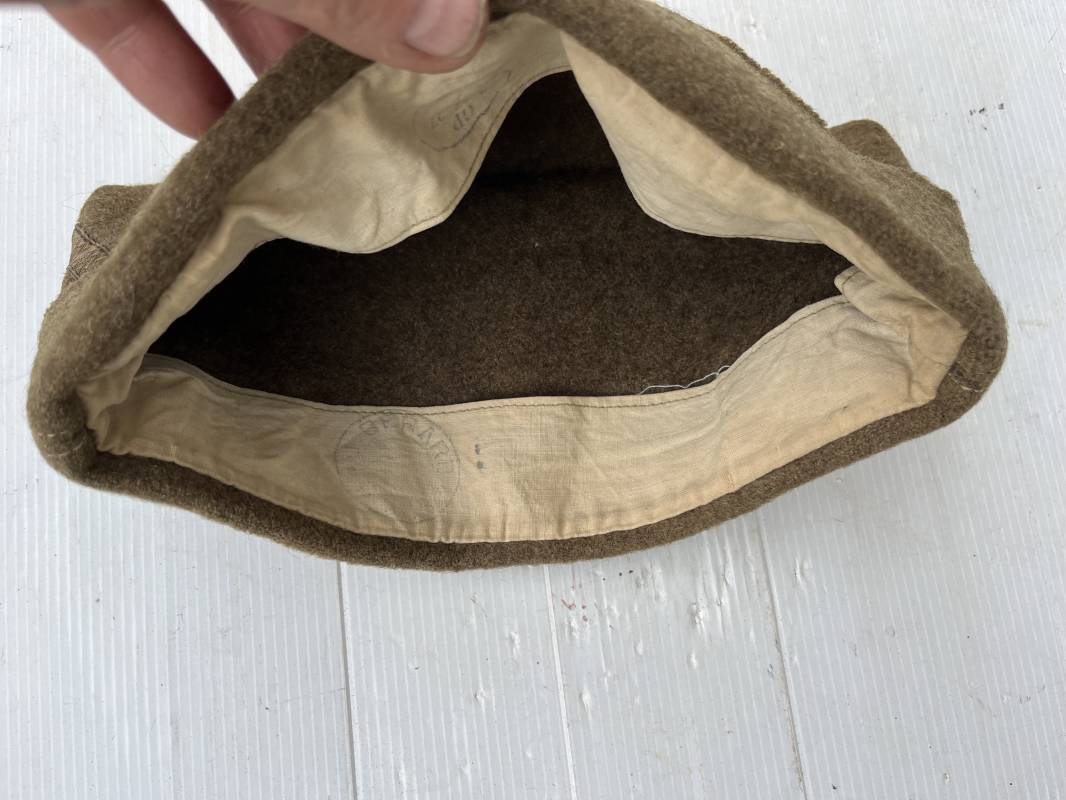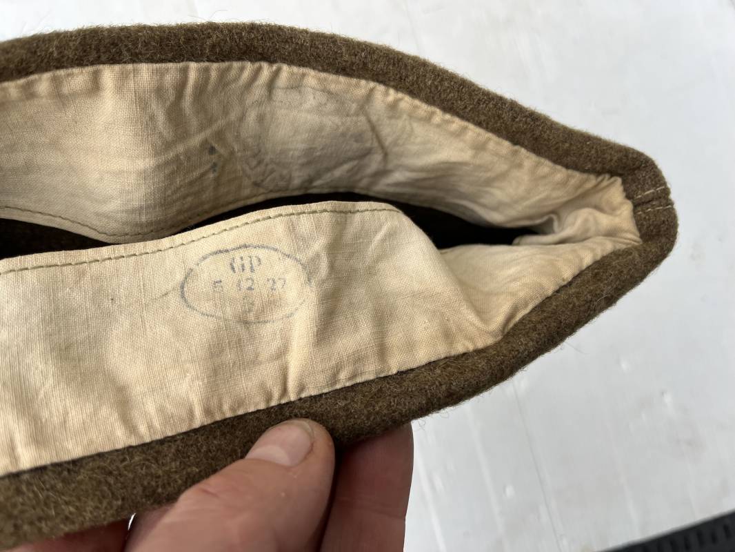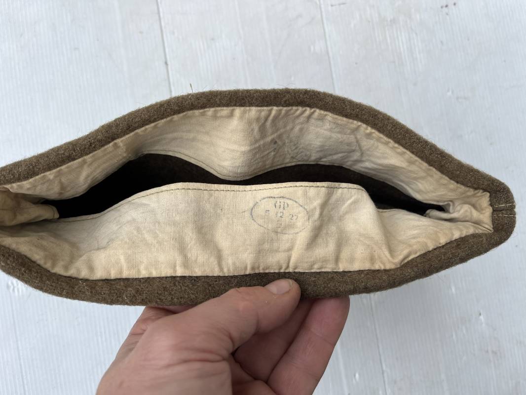 Trés beau calot troupe de dotation modèle 1918 en drap kaki. Modèle toute arme. Galon doré de sous officier cousu sur le devant ( lézarde) Grade de Sergent Pendant Durée Légale . Rabat en drap, bandeau intérieur de coiffe en coton blanc . Taille 58 Tampon rond fabricant Bérard Paris Tampon oval de réception daté 1927 . Calot légèrement porté en bel état . Coiffure typique du poilu en 1939/40. Ref 21735