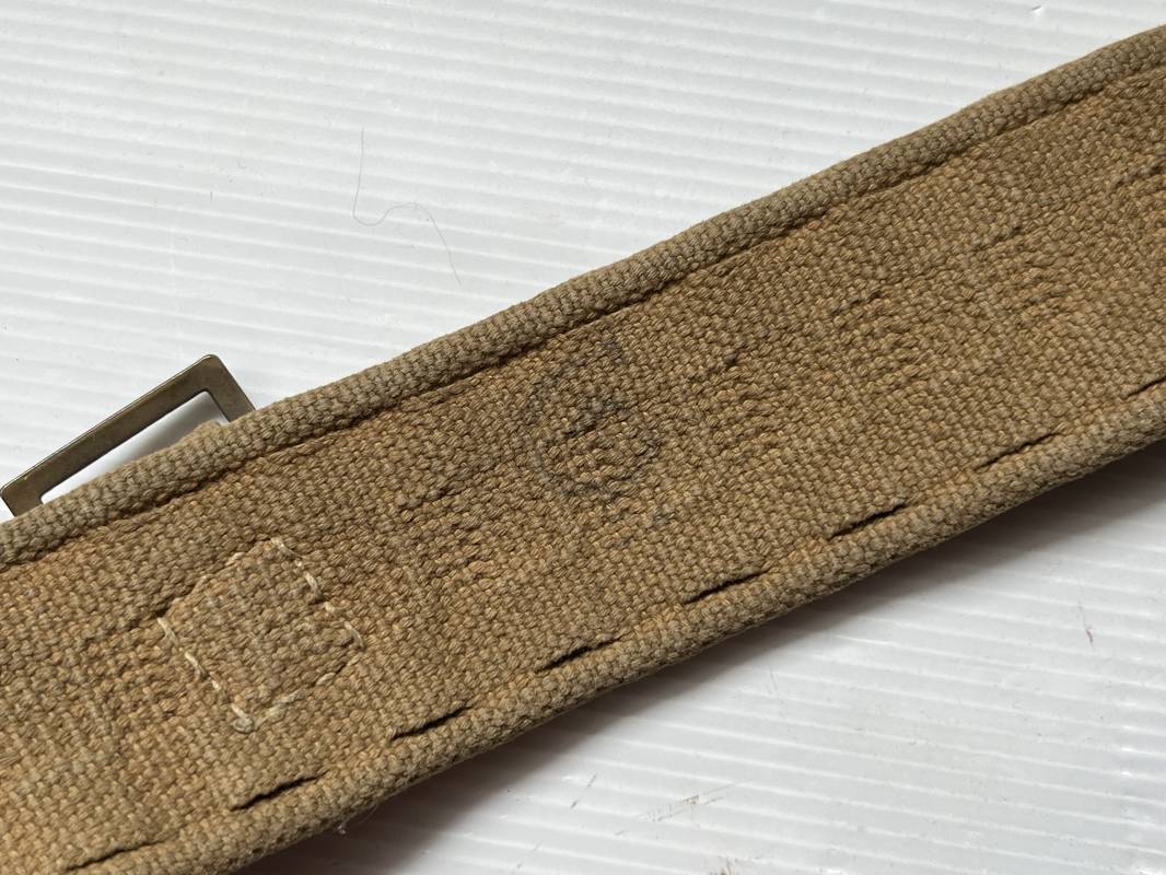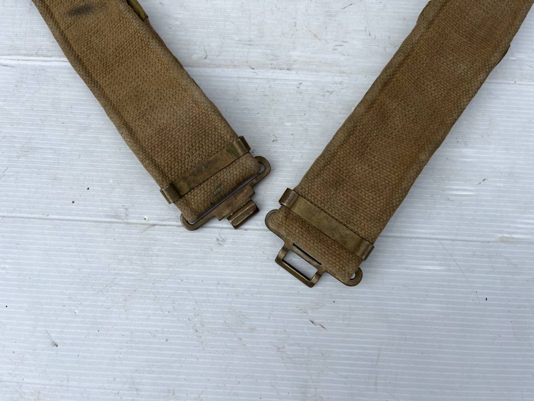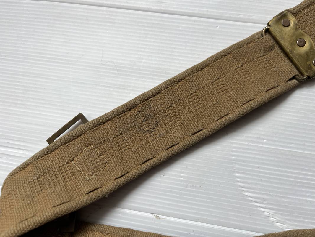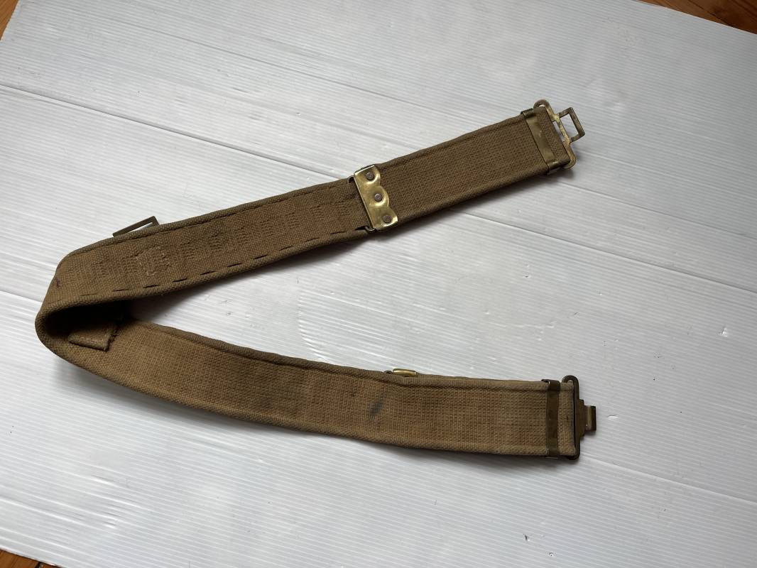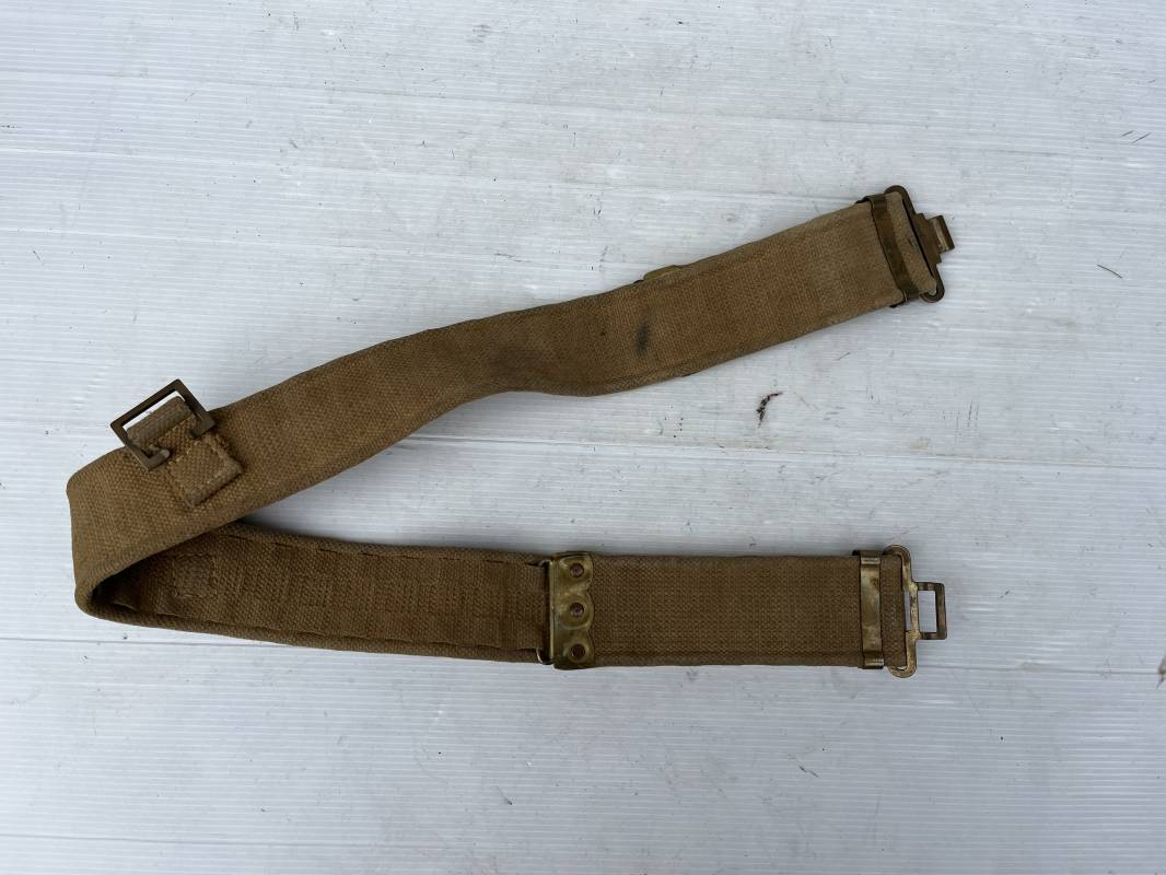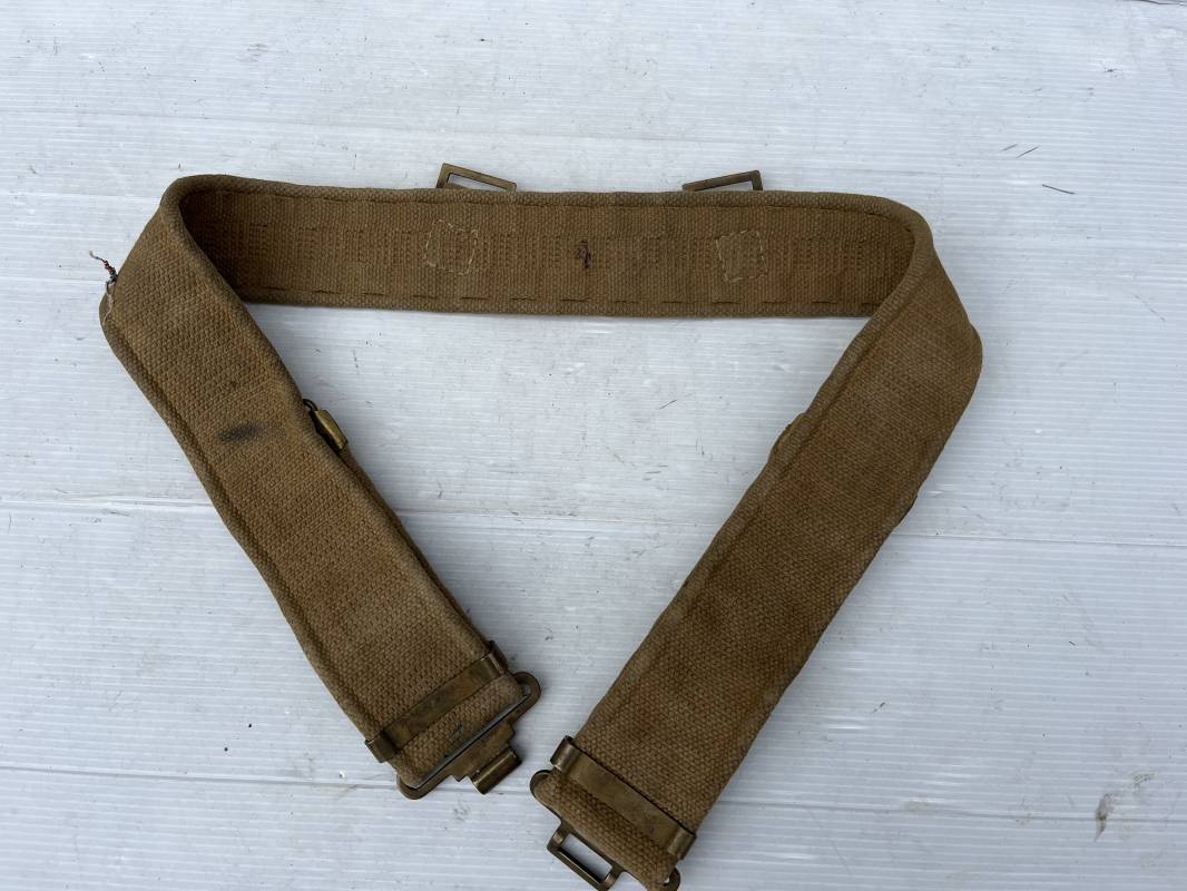 Rare ceinturon Pattern 1937 en coton filet jaunatre . Boucle et crochet en laiton . Marquage fabricant et date illisible Tampon encre noire C et fleche de l ' armee canadienne . Ceinturon porté en bel état trouvé au Havre en succession familale . Peu courant Ref 21202