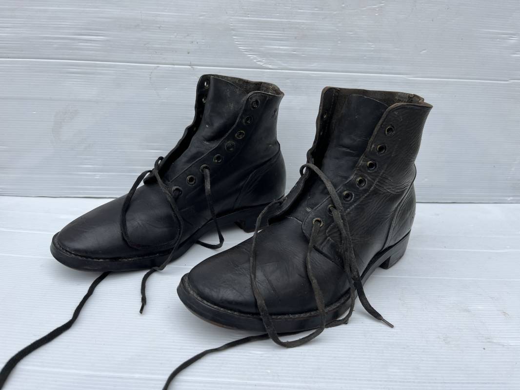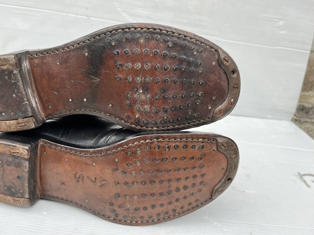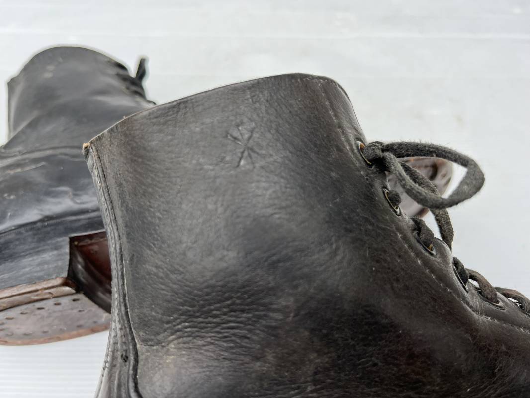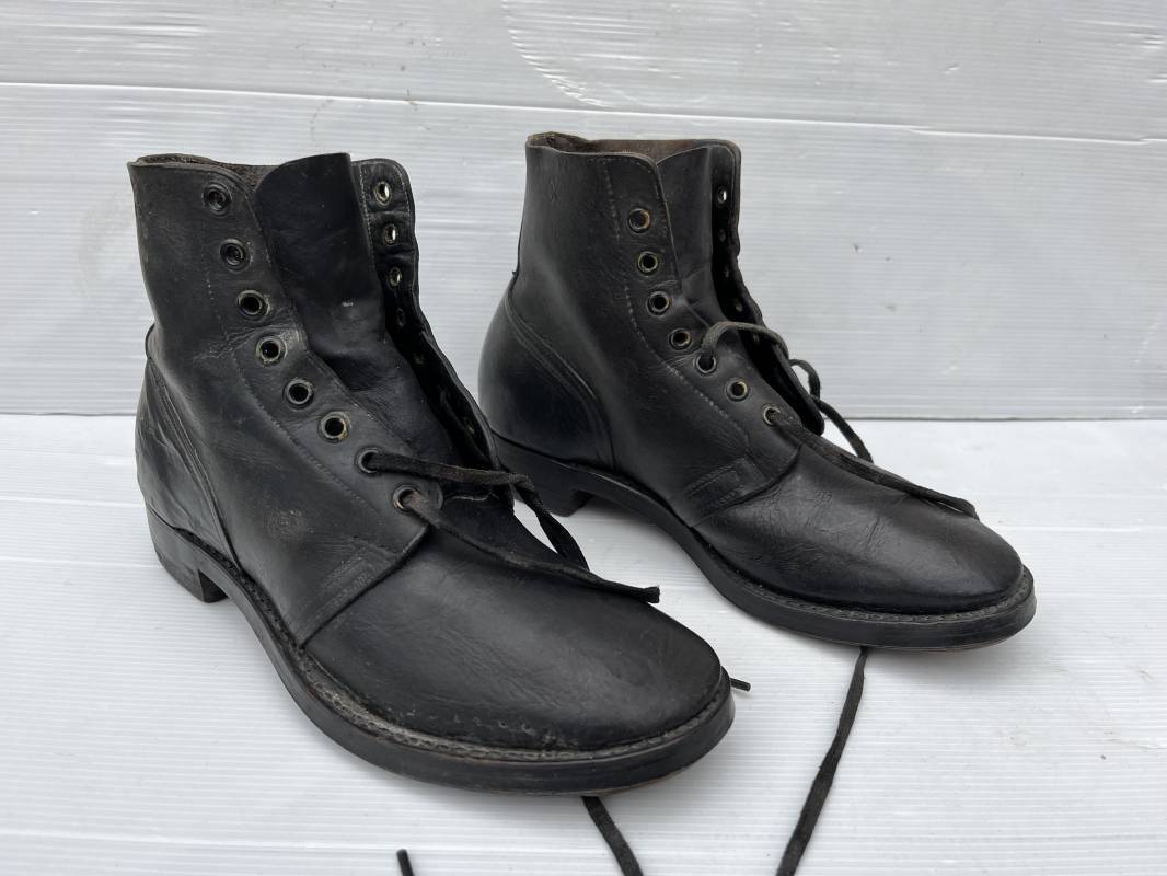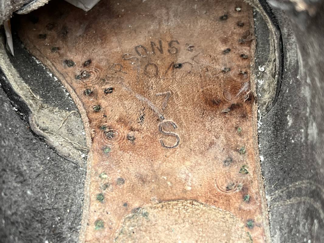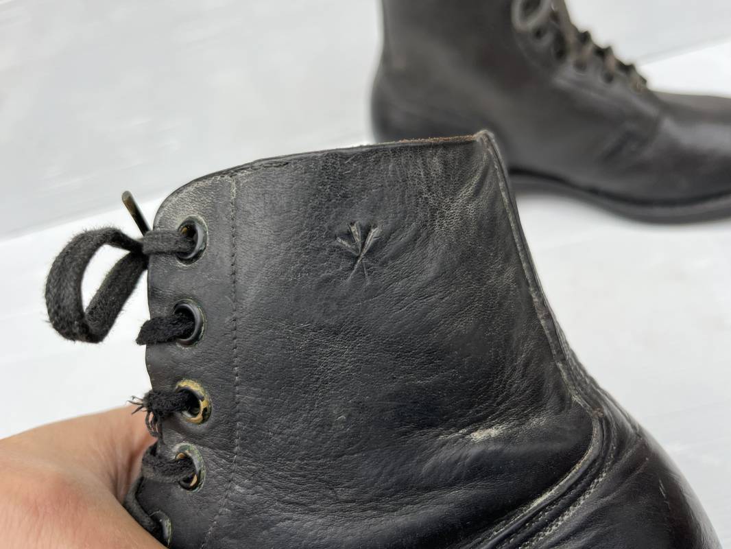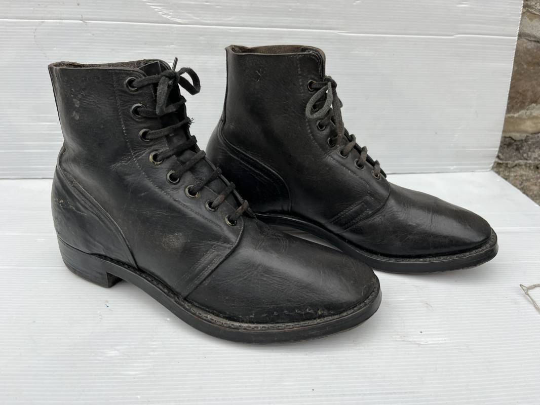 Rare paire de brodequins troupe de dotation de l armée canadienne . ' Boots Ankle Militia GS ', brodequins avec oeillets métalliques et lacet coton . Paire homogéne marquage fabricant en fond de semelle UPSONS 1942 Taille 7 S . Marquage sur hauts des tiges RCA Semelles et talon en cuir , embouts métalliques, talon avec fer en U Marquage sur semelles 7 S et fleche . Longueur semelle 28,5 cm , hauteur brodequins 15,5 cm . Cuir souple taille 42 . Paire homogéne et du meme fabricant dont le pied droit possede 8 oeilletes et le pied gauche 7 !! Cette rare paire d ebrodequins a ete trouvée en brocante au Havre ( 76 ) Ref 18989