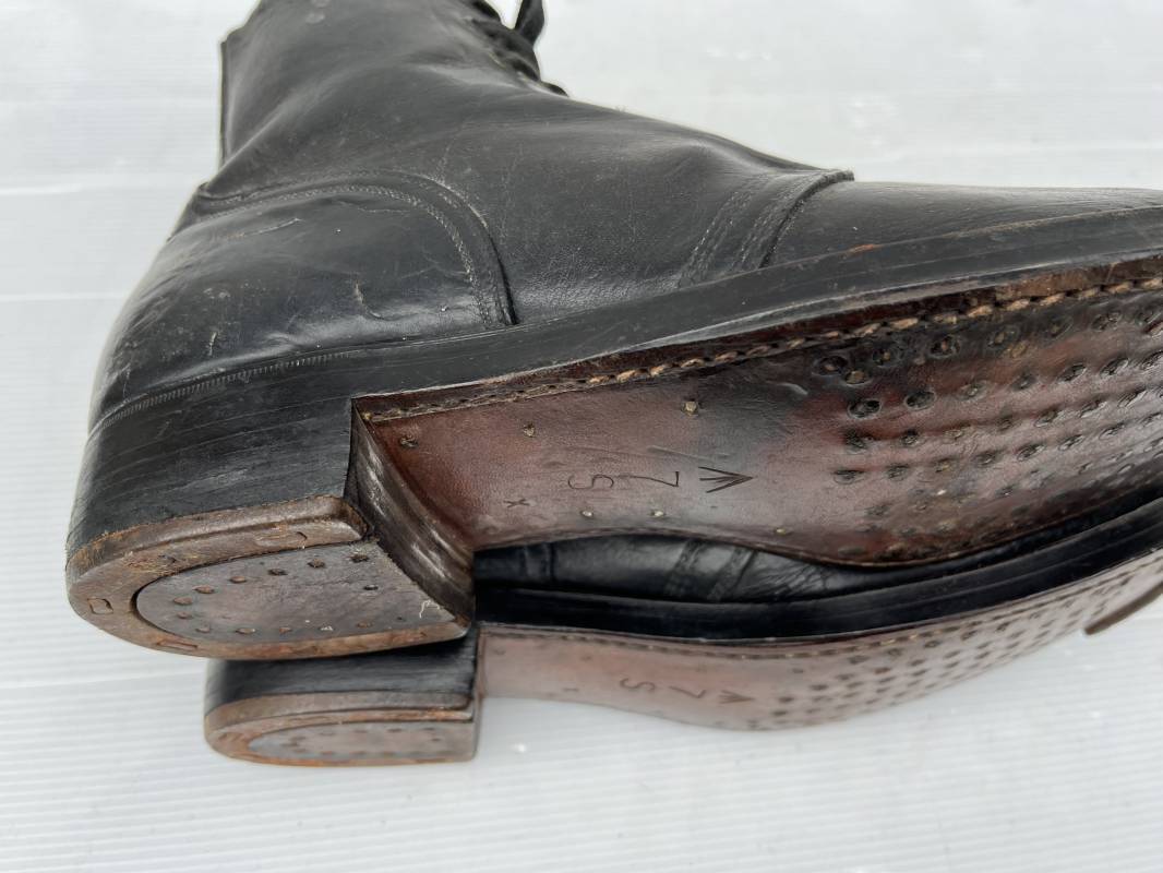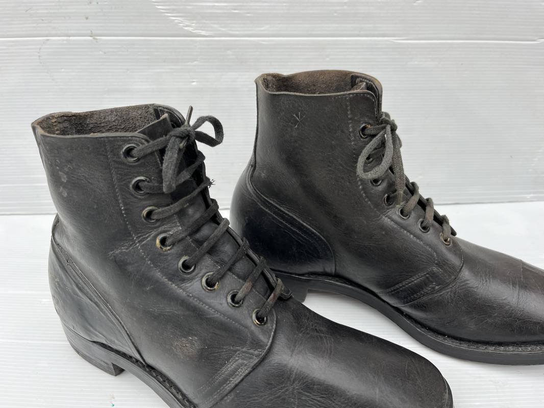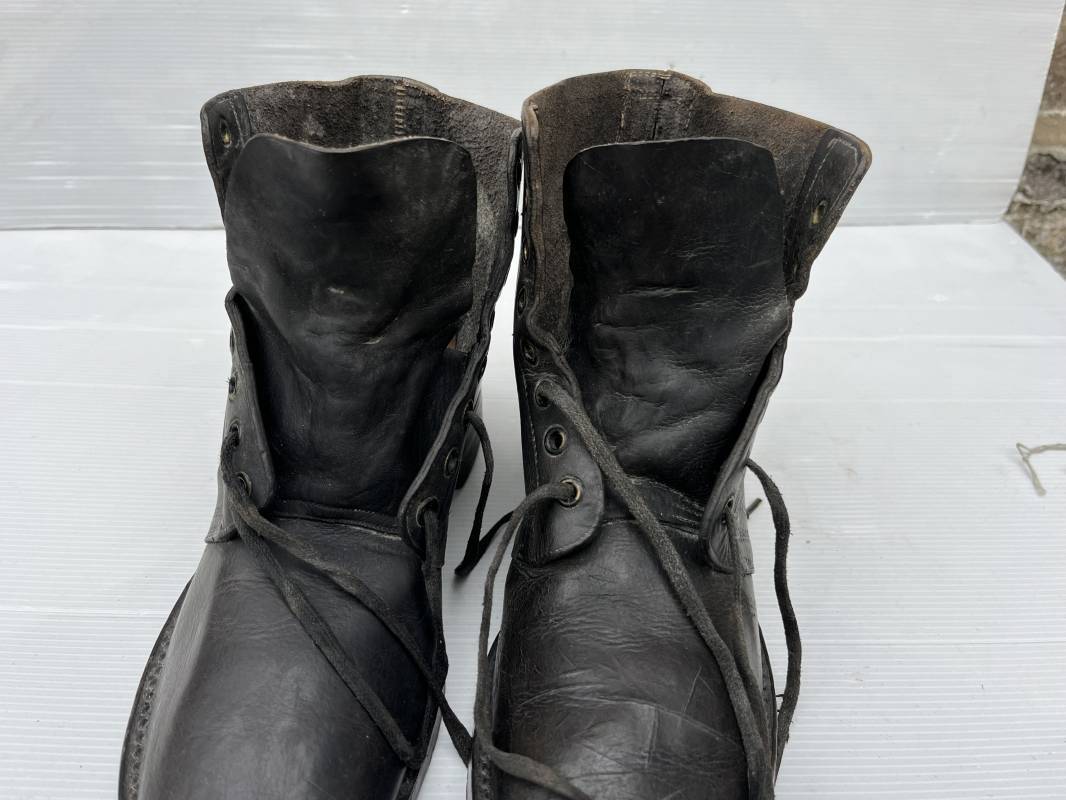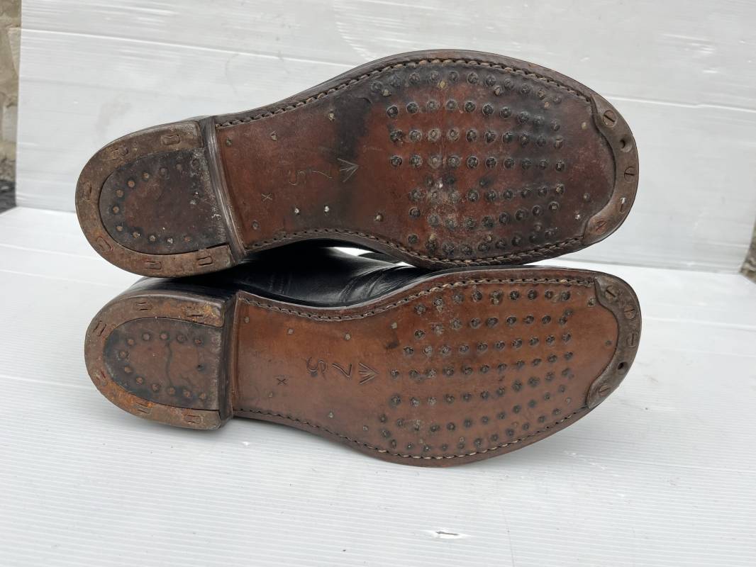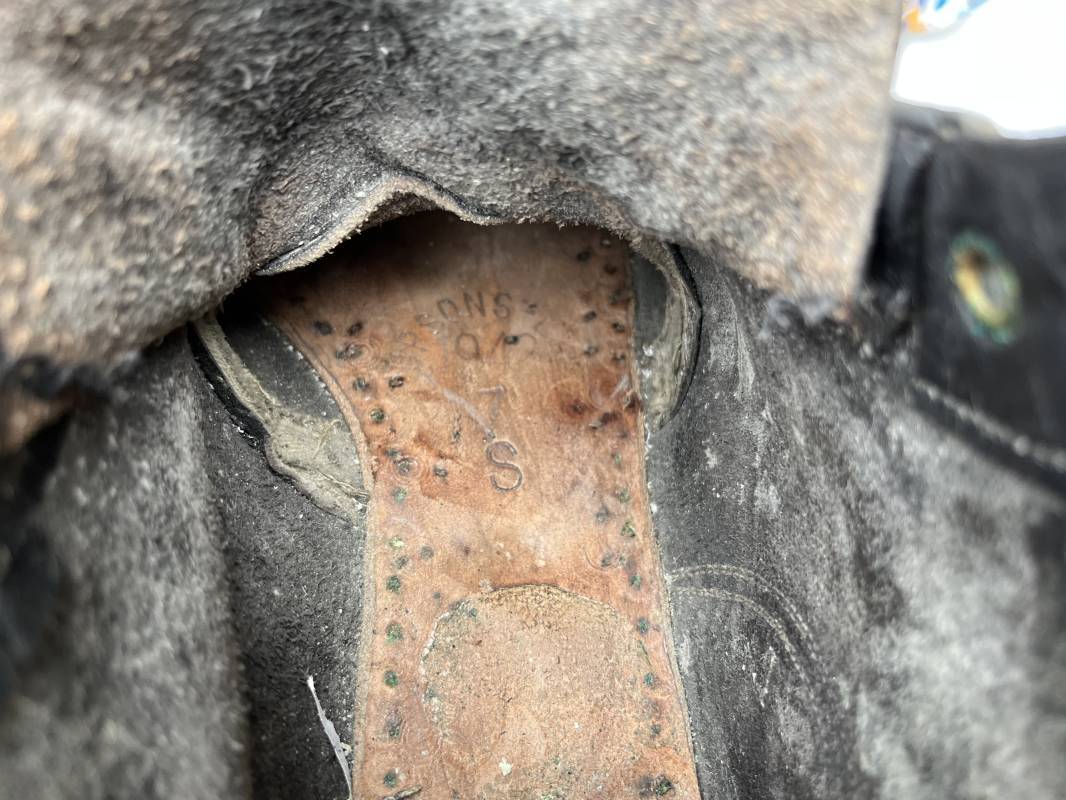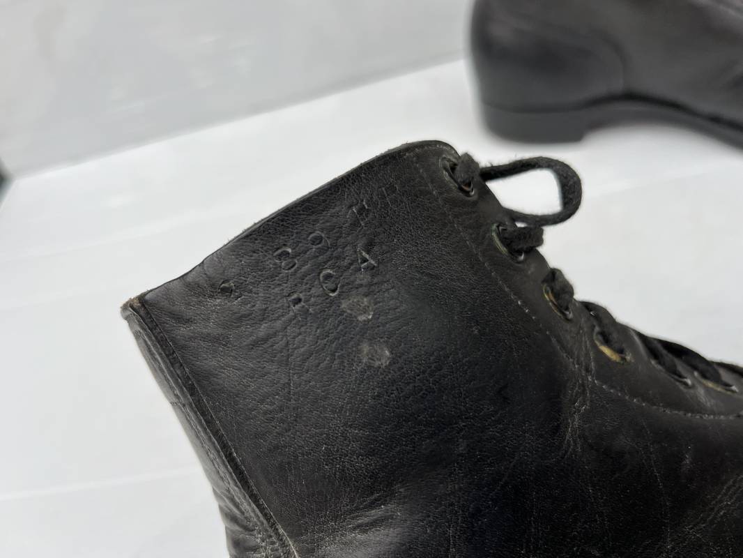 Rare paire de brodequins troupe de dotation de l armée canadienne . ' Boots Ankle Militia GS ', brodequins avec oeillets métalliques et lacet coton . Paire homogéne marquage fabricant en fond de semelle UPSONS 1942 Taille 7 S . Marquage sur hauts des tiges RCA Semelles et talon en cuir , embouts métalliques, talon avec fer en U Marquage sur semelles 7 S et fleche . Longueur semelle 28,5 cm , hauteur brodequins 15,5 cm . Cuir souple taille 42 . Paire homogéne et du meme fabricant dont le pied droit possede 8 oeilletes et le pied gauche 7 !! Cette rare paire d ebrodequins a ete trouvée en brocante au Havre ( 76 ) Ref 18989