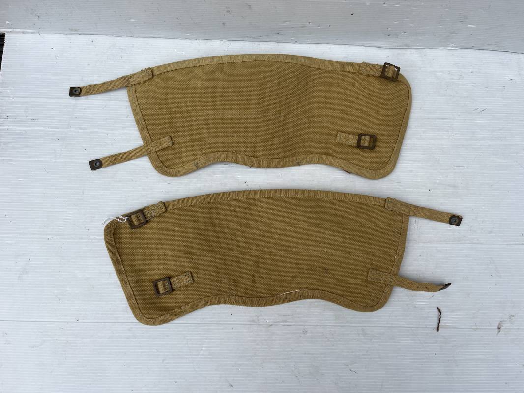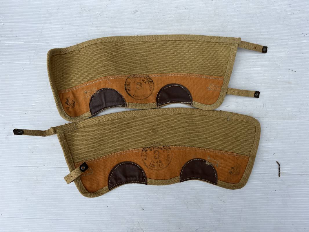 Trés belle paire de guètres canadiennes pattern 1937 . Guètres en coton filé beige jaunatre , lanières en toile et boucles en laiton . Renforts intérieurs en cuir marron clair . Renforts toile , marquages fabricant Hugh Carson Co Ottawa 1943 Taille 3 Marquage ' C' et flèche , parfait état Ref 21237
