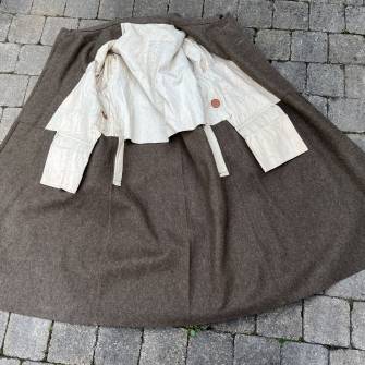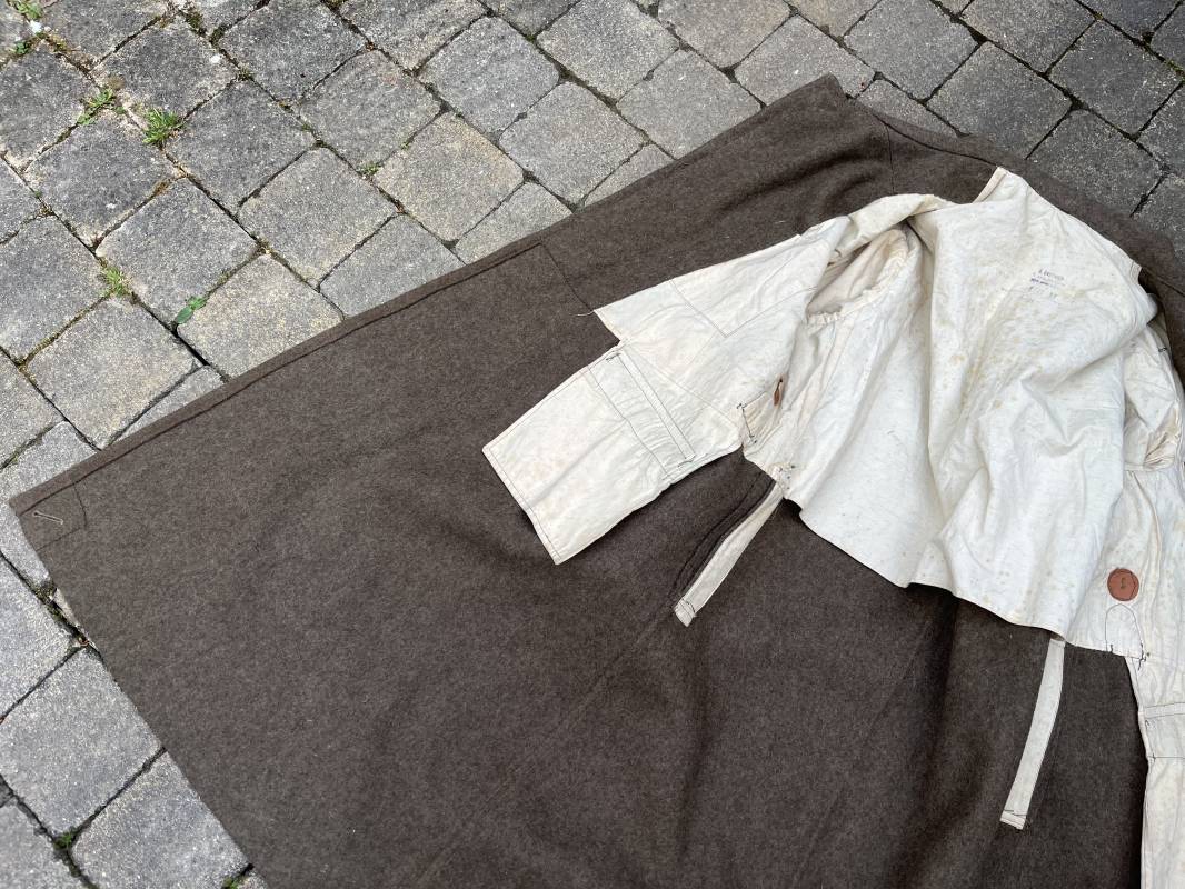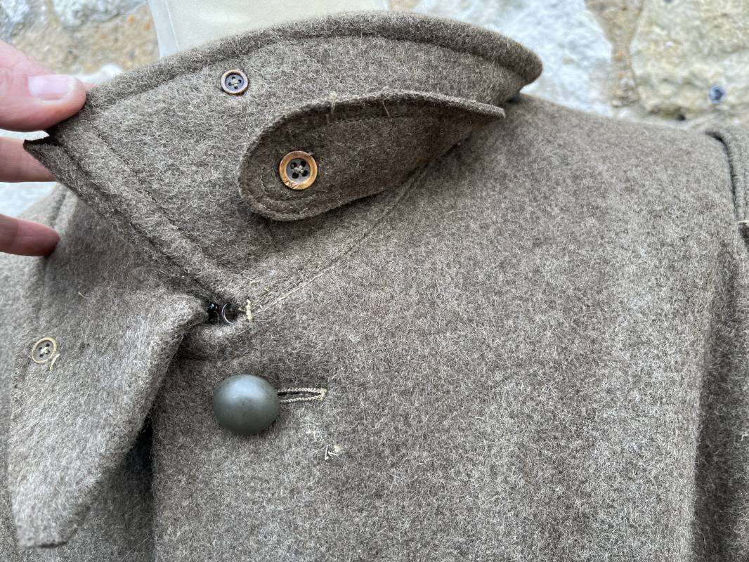Trés belle capote troupe modèle 1938 en drap kaki. Capote réglementaire pour troupe à pied .Fermeture frontale par cinq gros boutons peints en kaki . Large col en drap , crochet métallique de fermeture .Volets de dissimulation et petits boutons de fermeture . Bourrelets d'épaules . . 2 poches à rabats. Deux fentes d'accés sur chaque cotés Passants de ceinturon en drap renforcés en cuir . Intérieur doublé en coton blanc . Tampon encre fabricant Gauthier . Taille 116 M . Largeur épaules 51 cm. Longueur 126 cm. Manches 61 cm. Drap très frais. Capote trés portée en parfait état Trés belle capote réglementaire d'un poilu en Mai/Juin 1940. Ref 19878