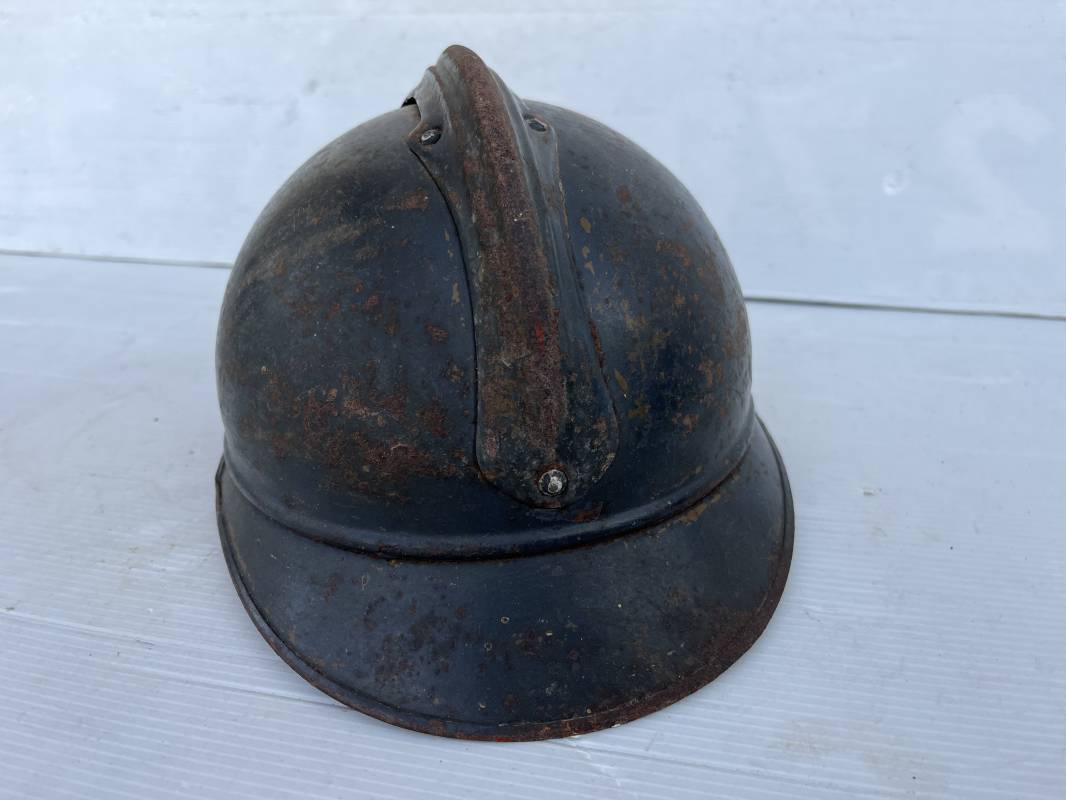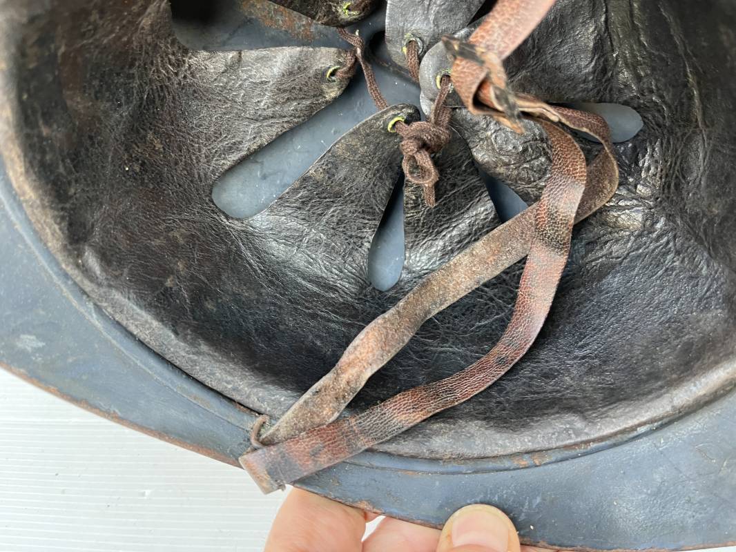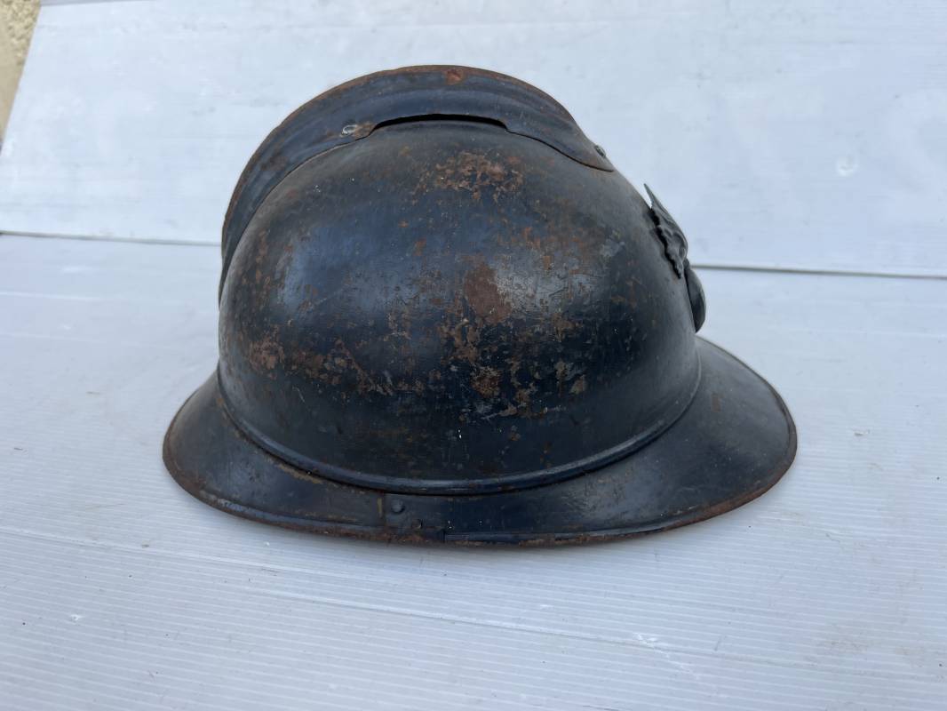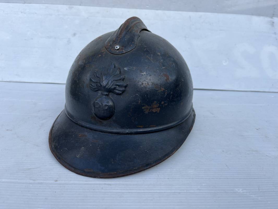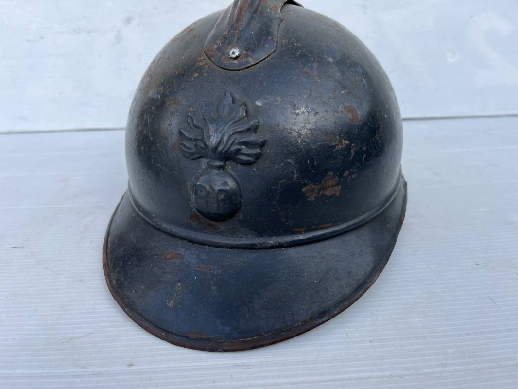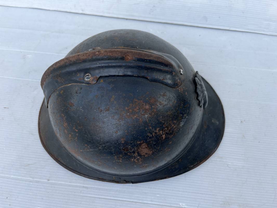 Très beau casque Adrian modèle 1915 de l'Infanterie. Casque 100 % Nature trouvé en succession familiale a Rouen ( 76 ) . Belle peinture bleu nuit mate d'usinage du 2éme type, cimier fer. Insigne à grenade de l'Infanterie, Cavalerie, Train. Belle peinture mate non frottée. Jugulaire en cuir marron. Rivet fer . Boucle métallique, cuir souple. Coiffe intèrieure du 1er type en cuir glacé noir. Lacet en coton. Taille 56. Lamelles en alu ondulé. Fixation par huit pattes plates métalliques. Casque porté en bel état. mentions manuscrites dans les nuquières intérieure avant et arrière 'Dr GALOU ' Bel état. 1916/18 Ref 18624