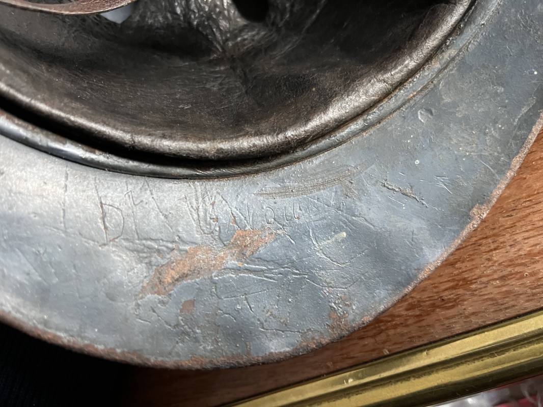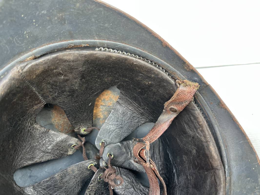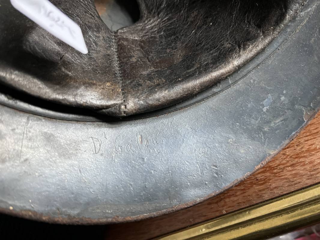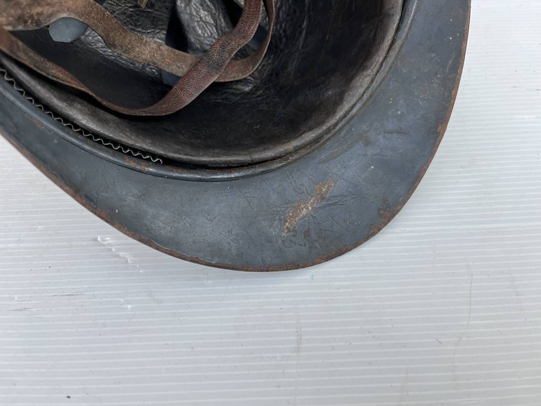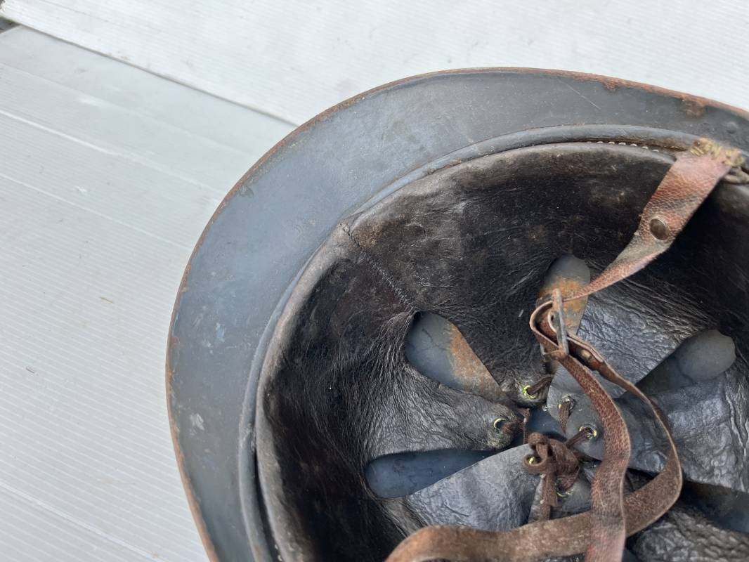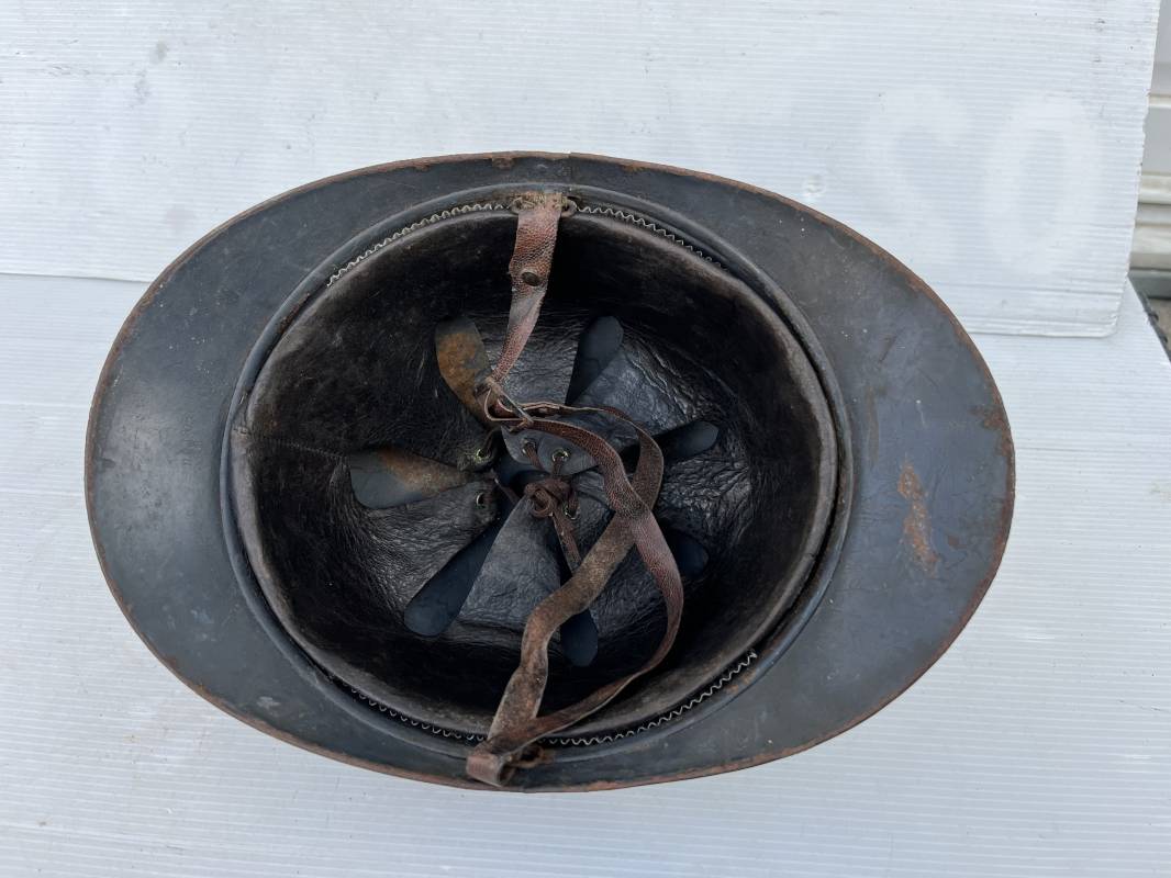 Très beau casque Adrian modèle 1915 de l'Infanterie. Casque 100 % Nature trouvé en succession familiale a Rouen ( 76 ) . Belle peinture bleu nuit mate d'usinage du 2éme type, cimier fer. Insigne à grenade de l'Infanterie, Cavalerie, Train. Belle peinture mate non frottée. Jugulaire en cuir marron. Rivet fer . Boucle métallique, cuir souple. Coiffe intèrieure du 1er type en cuir glacé noir. Lacet en coton. Taille 56. Lamelles en alu ondulé. Fixation par huit pattes plates métalliques. Casque porté en bel état. mentions manuscrites dans les nuquières intérieure avant et arrière 'Dr GALOU ' Bel état. 1916/18 Ref 18624