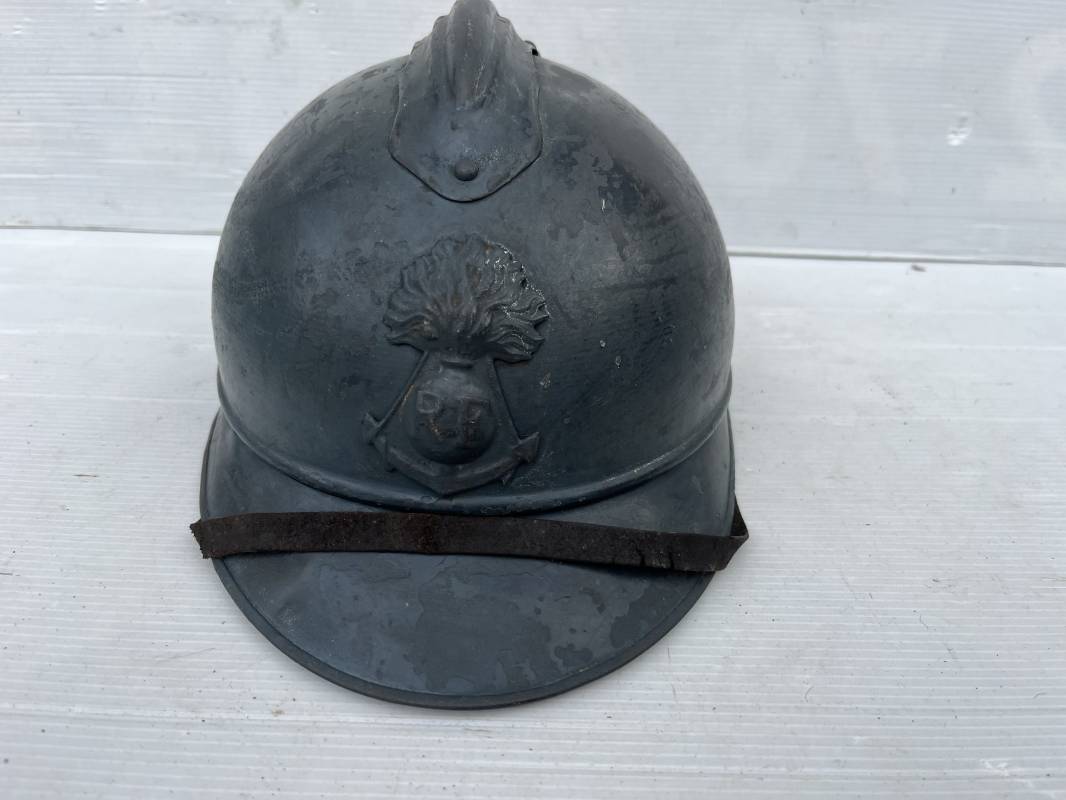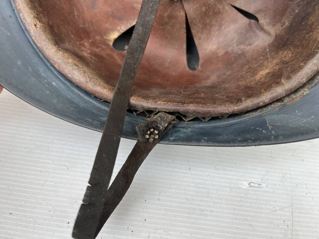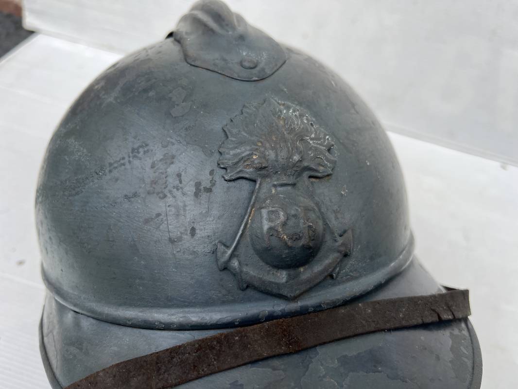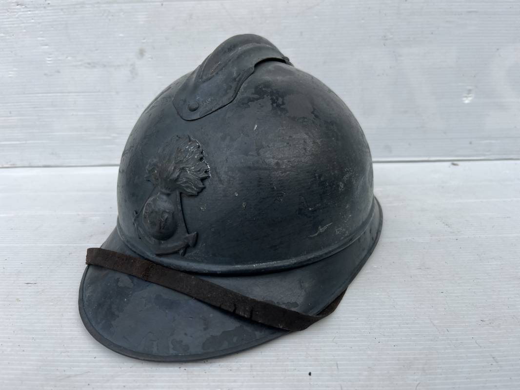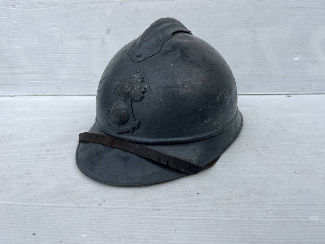 Trés beau casque Adrian modéle 1915 de troupe coloniale . Cimier , insigne frontal à grenade et ancre de la coloniale . trés belle peinture bleu claire mate d'usinage . Peinture non frottée . Jugulaire en cuir fauve rivets métalliques , boucle métallique . Intérieur en cuir marron du premier type . Cuir souple taille 56 Lacet coton noir d'origine . Lamelles aluminium ondulé . Crochets fer plat de fixation presents . Casque legerement porté en parfait état . Rare casque de troupe coloniale en bel état . Coiffure peu courante 1915/18 Ref 21758
