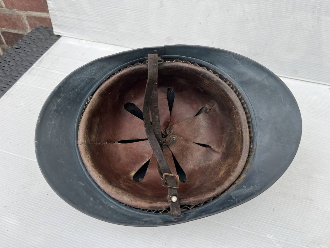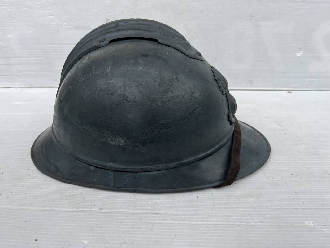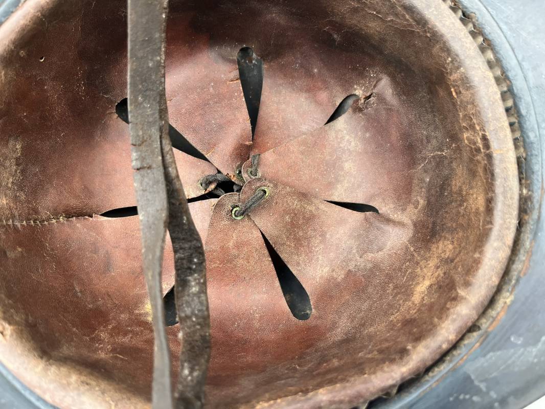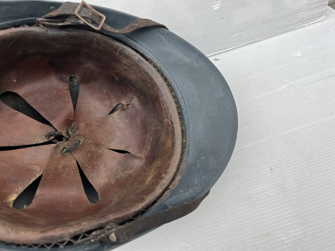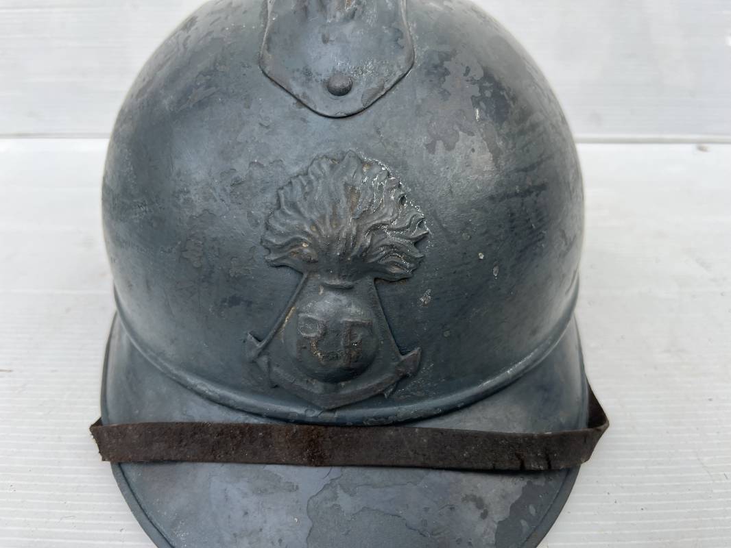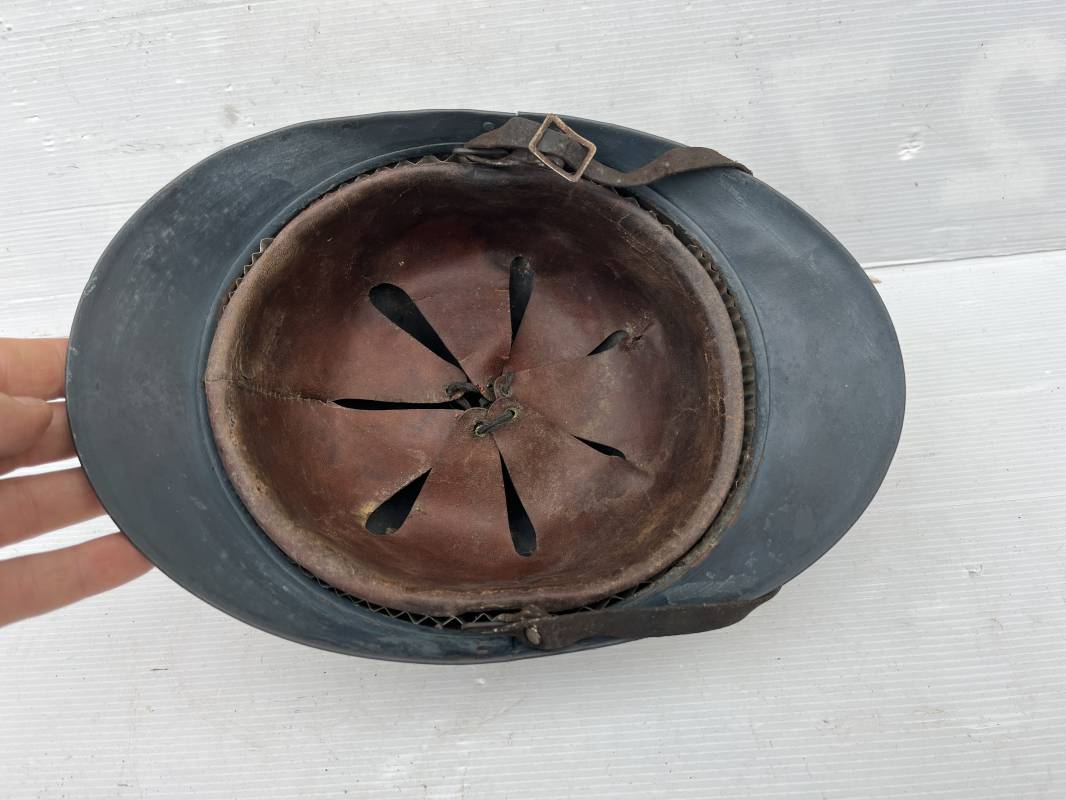 Trés beau casque Adrian modéle 1915 de troupe coloniale . Cimier , insigne frontal à grenade et ancre de la coloniale . trés belle peinture bleu claire mate d'usinage . Peinture non frottée . Jugulaire en cuir fauve rivets métalliques , boucle métallique . Intérieur en cuir marron du premier type . Cuir souple taille 56 Lacet coton noir d'origine . Lamelles aluminium ondulé . Crochets fer plat de fixation presents . Casque legerement porté en parfait état . Rare casque de troupe coloniale en bel état . Coiffure peu courante 1915/18 Ref 21758