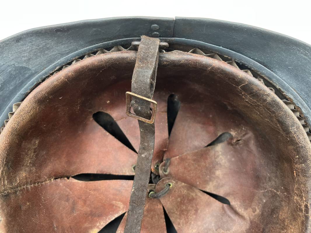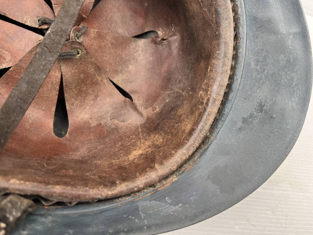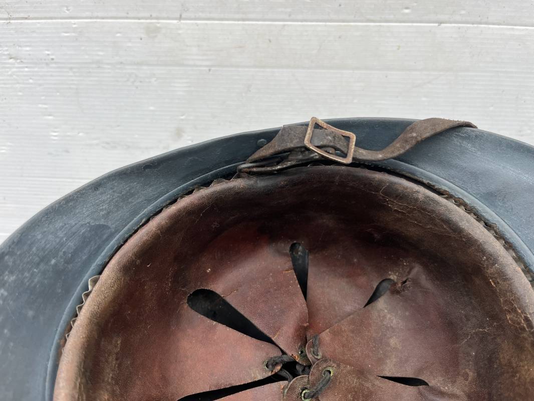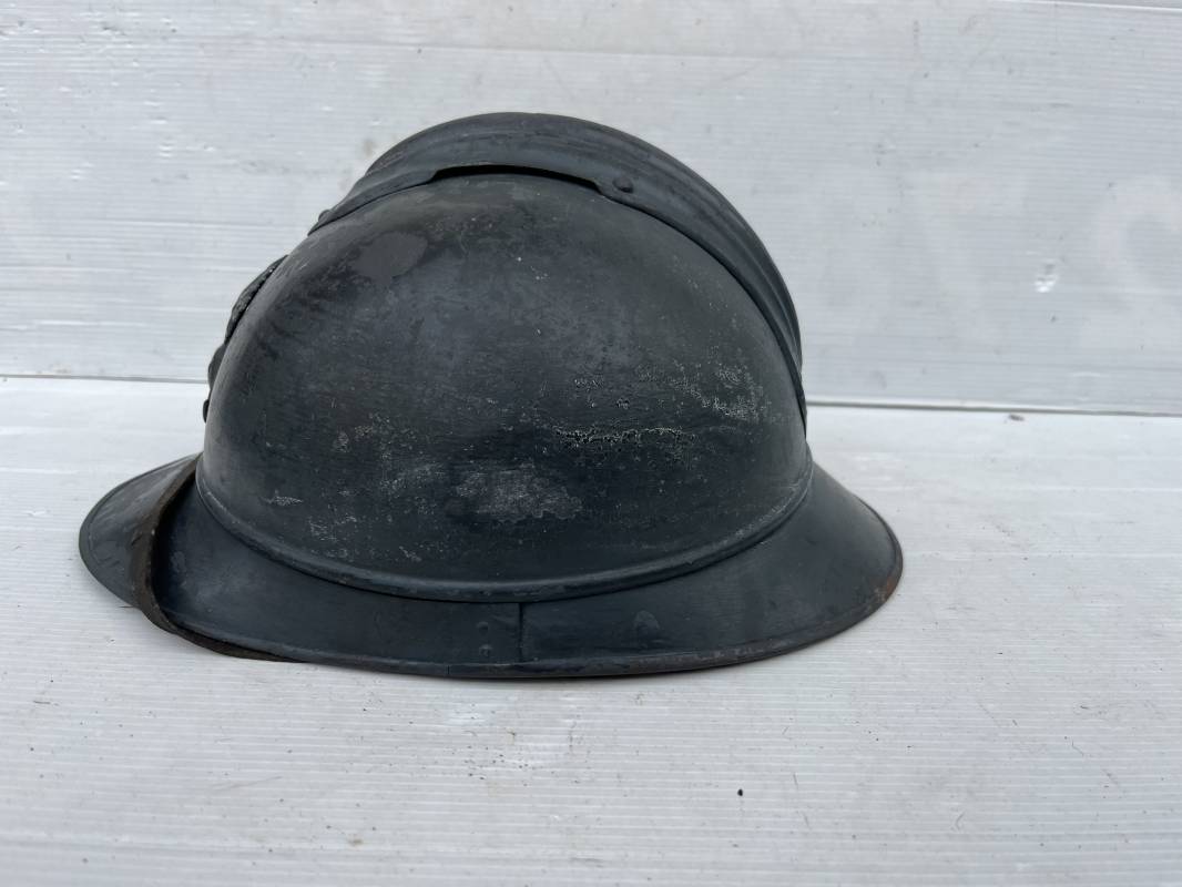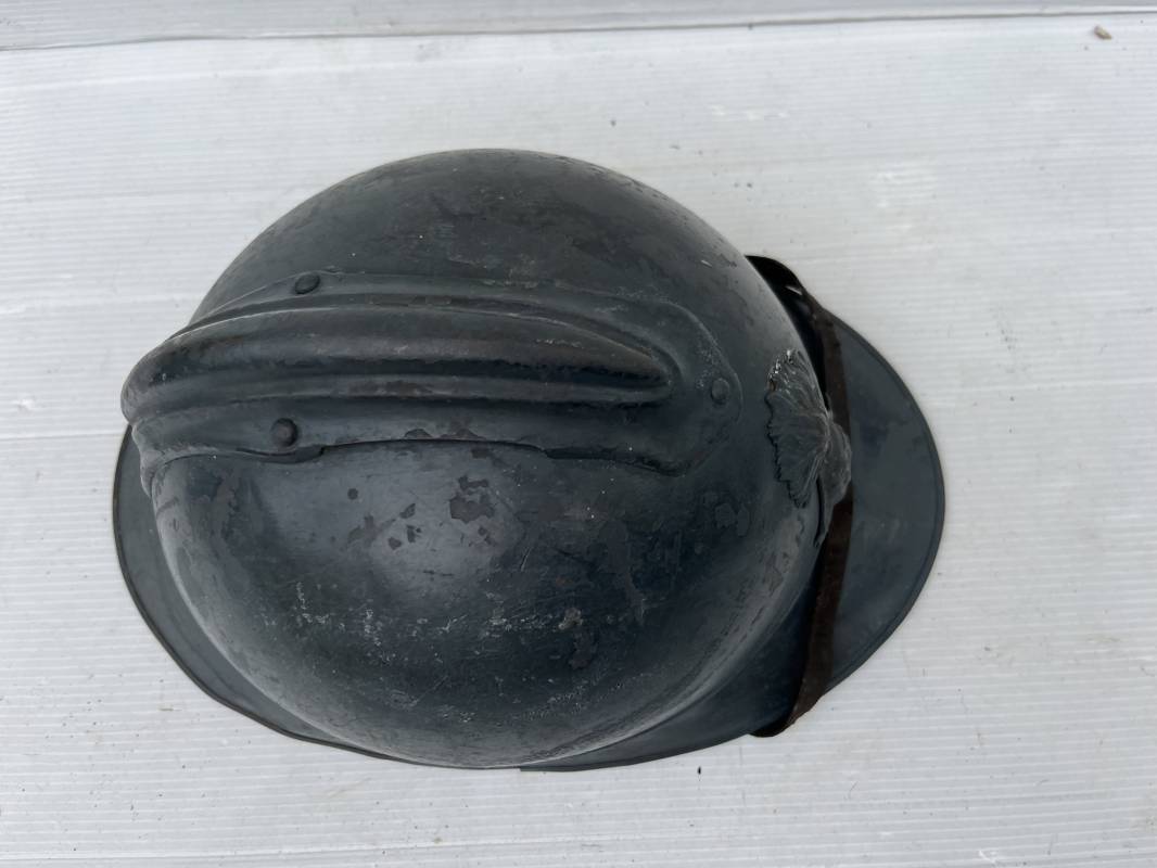 Trés beau casque Adrian modéle 1915 de troupe coloniale . Cimier , insigne frontal à grenade et ancre de la coloniale . trés belle peinture bleu claire mate d'usinage . Peinture non frottée . Jugulaire en cuir fauve rivets métalliques , boucle métallique . Intérieur en cuir marron du premier type . Cuir souple taille 56 Lacet coton noir d'origine . Lamelles aluminium ondulé . Crochets fer plat de fixation presents . Casque legerement porté en parfait état . Rare casque de troupe coloniale en bel état . Coiffure peu courante 1915/18 Ref 21758