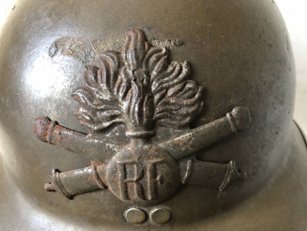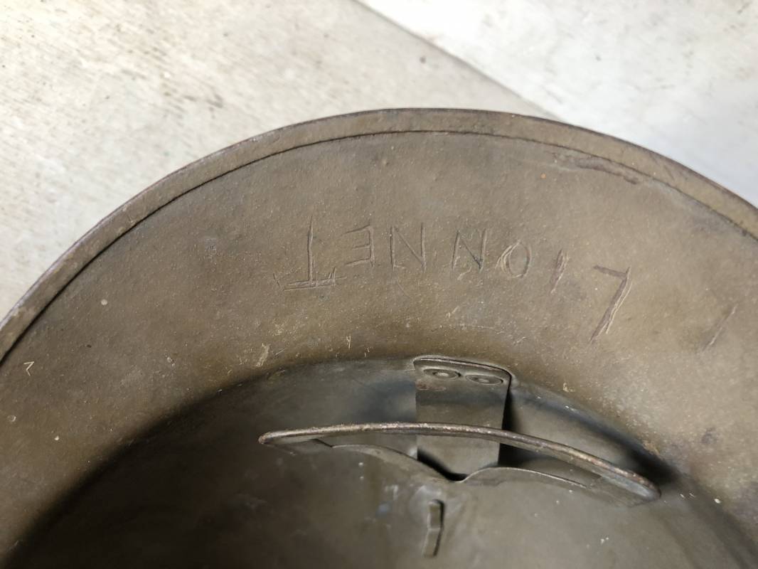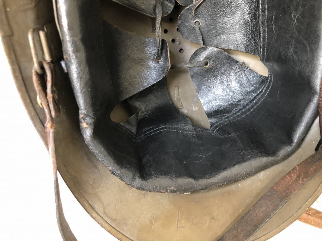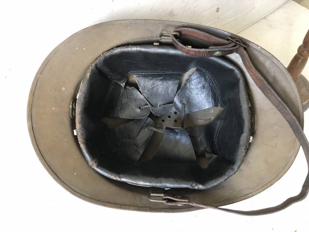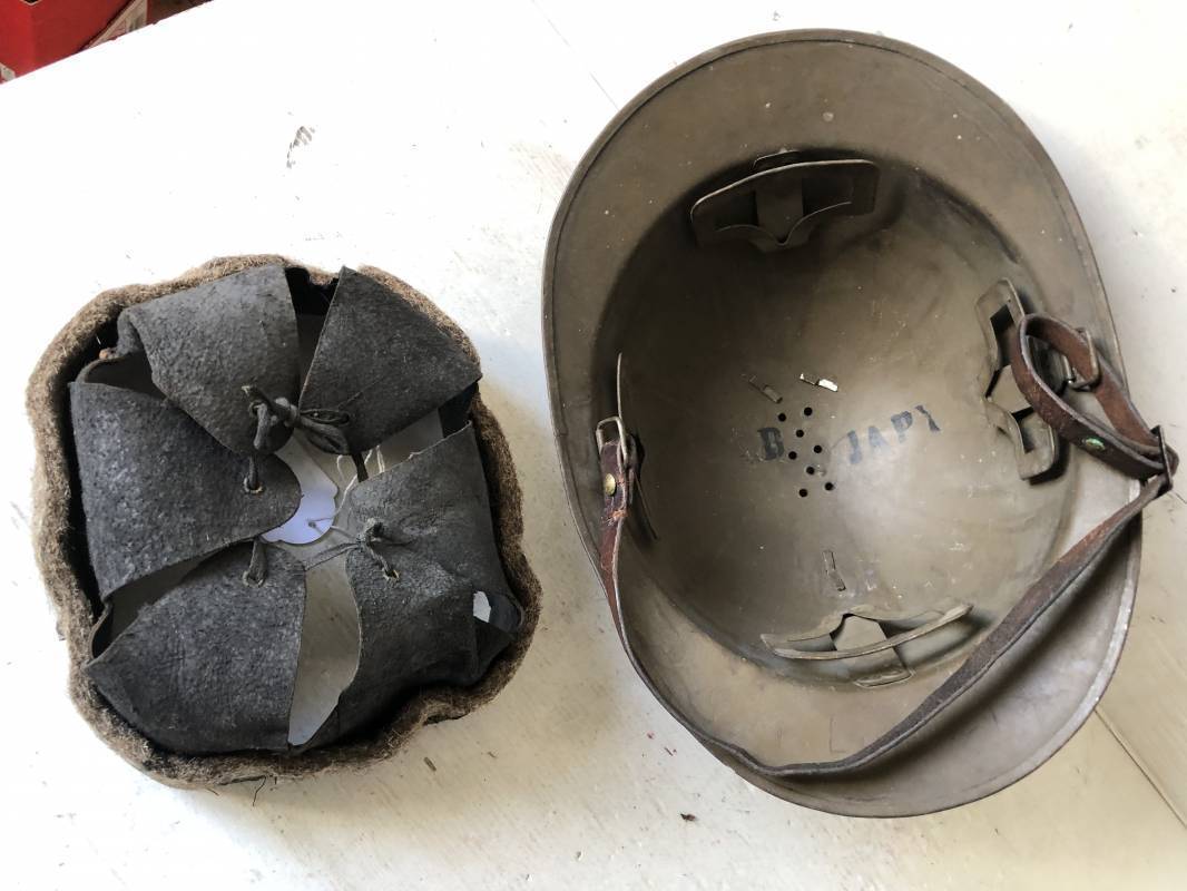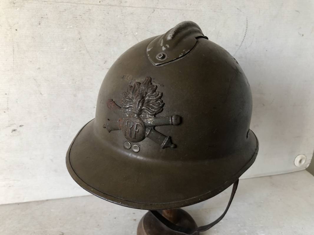 Beau casque Adrian modéle 1926 de l'artillerie . Coque avec peinture d'usinage de couleur kaki mate . Cimier alu . Insigne modéle 1915 de l'artillerie . Marquage fabricant en fond de bombe Japy D . Jugulaire cuir fauve souple , rivet laiton . . Marquage nom du soldat manuscrit sur nuquière 'Lionnet' . Intérieur en cuir noir glacé , feutrine grise , crochets métalliques plats . Lacet coton noir d'origine . Taille 57 Casque légérement porté en parfait état . Bon casque de la campagne de France 1939/40 Ref 11282