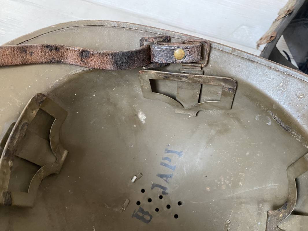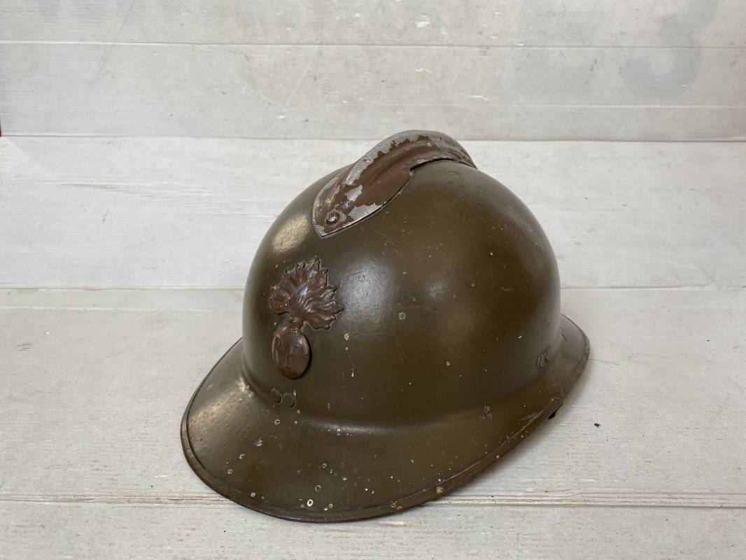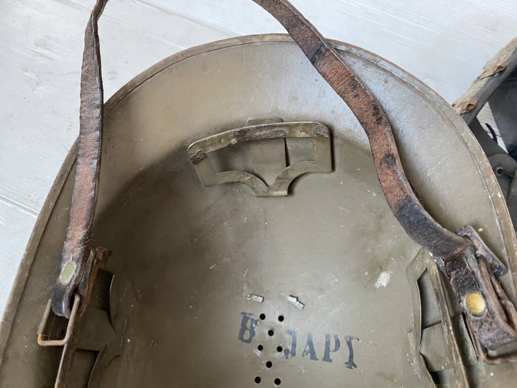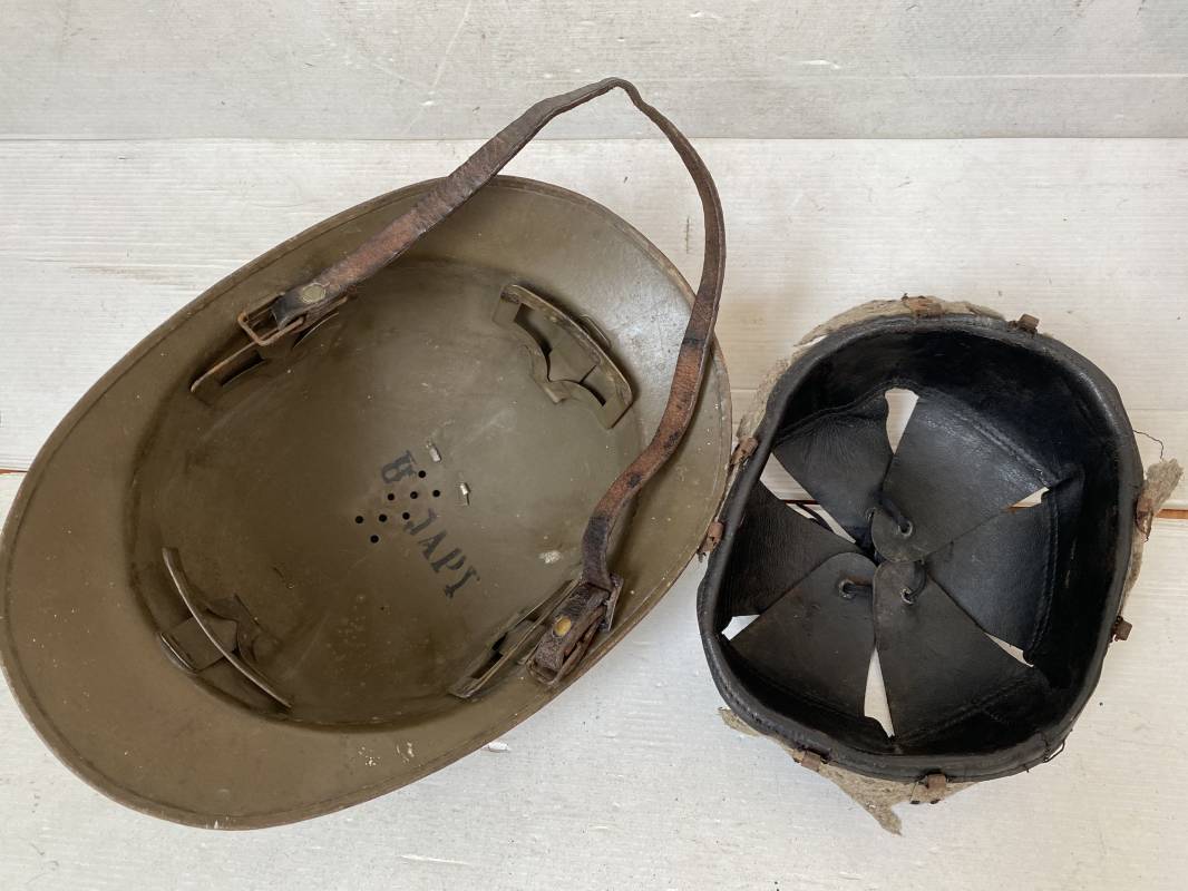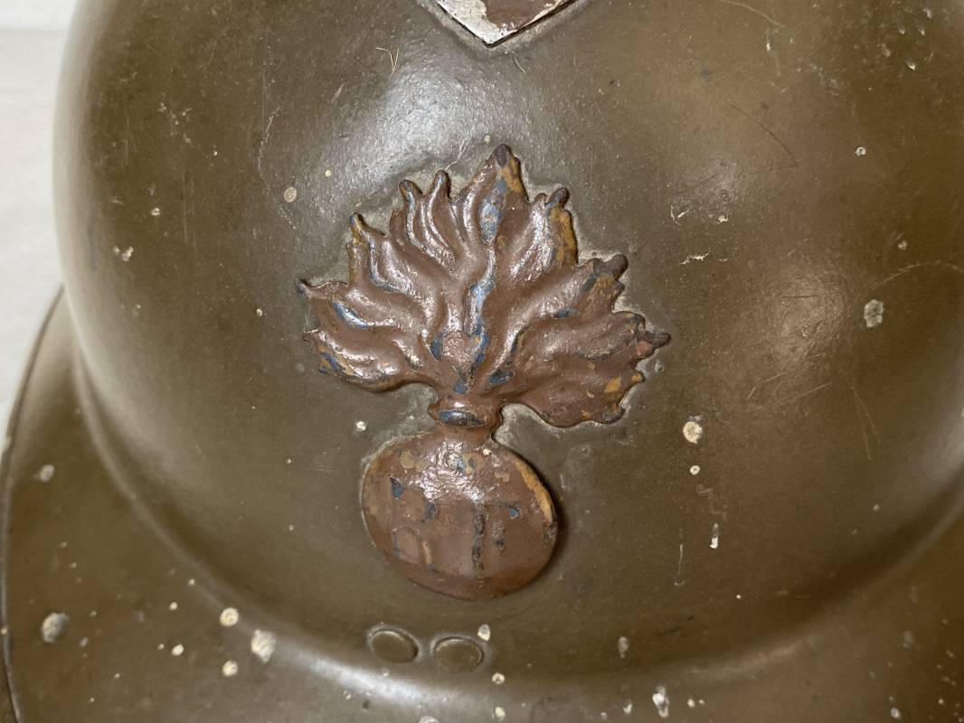 Bon casque Adrian modèle 1926 de l'Infanterie, cimier alu. Belle peinture kaki mate d'usinage. Tampon encre fabricant 'Japy' en fond de bombe. Coque taille B. Insigne frontal modèle 1915 à grenade de l'Infanterie, Cavalerie, Train. Lamelles métalliques intérieures. Jugulaire en cuir fauve et boucle métallique d'origines. Coiffe intérieure en cuir glacé noir. Tampon réception et de taille à l'encre blanc. Date illisible. Taille 55. Lacet coton noir. Fixation pour crochets métalliques, feutrine en partie manquante. Casque porté en bel état. Belle pièce dans son jus, typique de la Bataille de France Mai/Juin 1940. Ref 14253