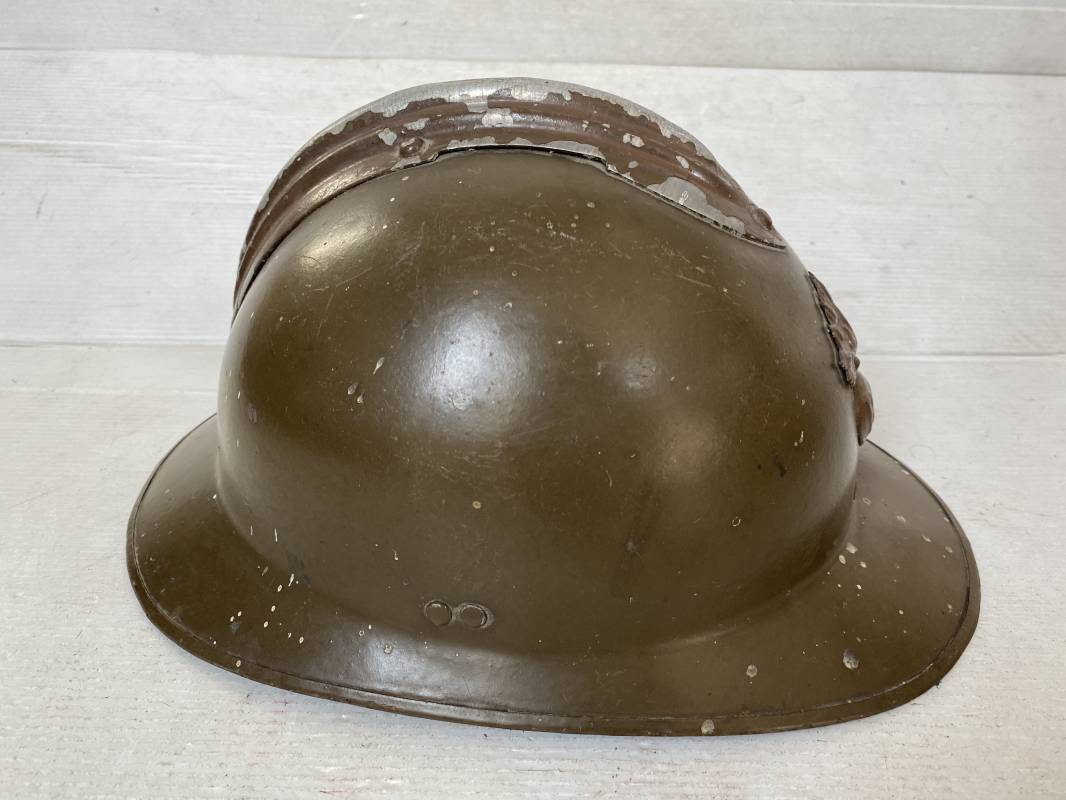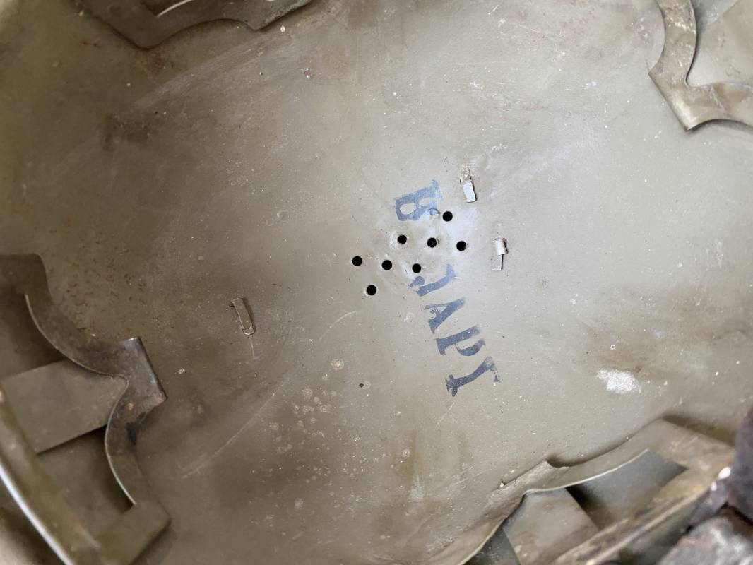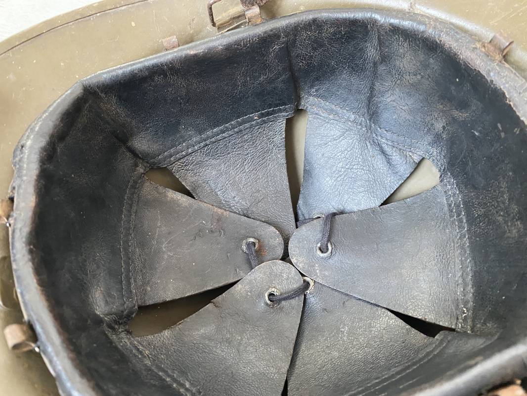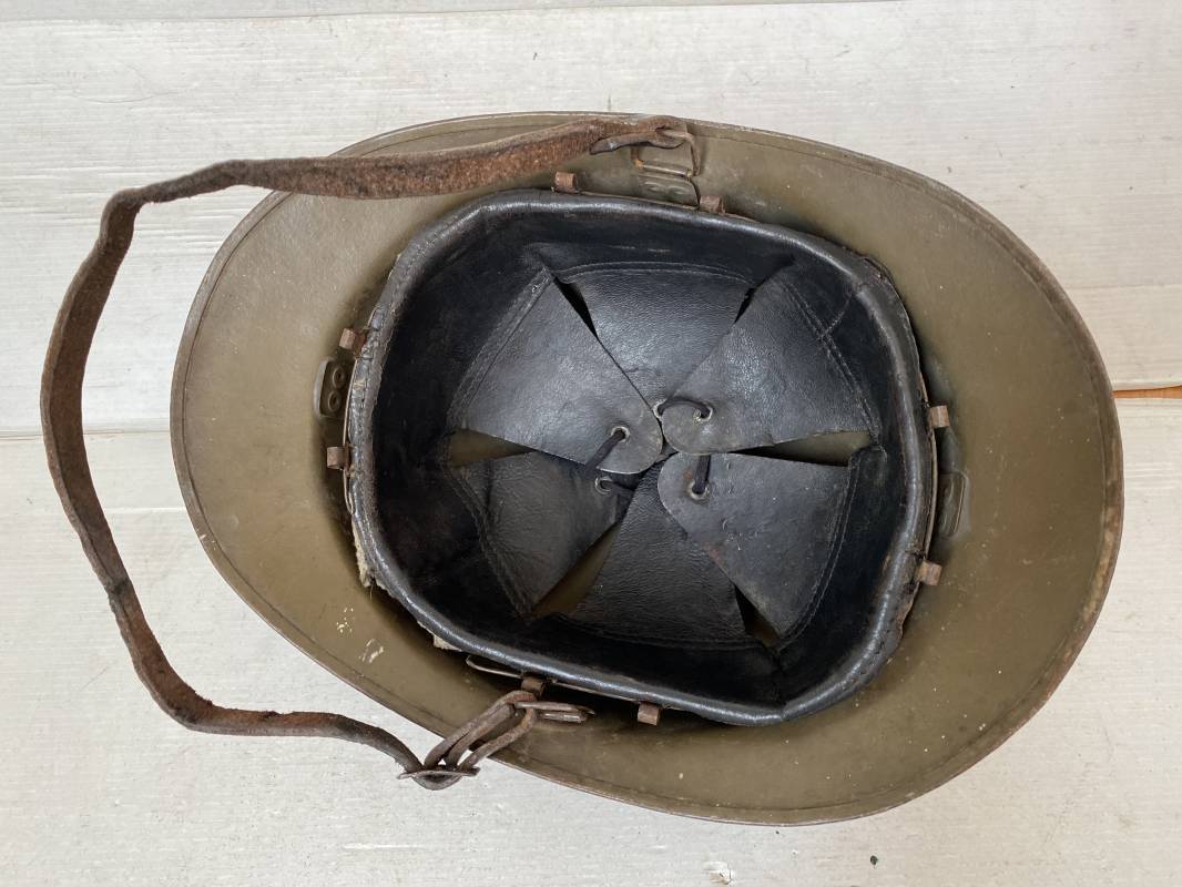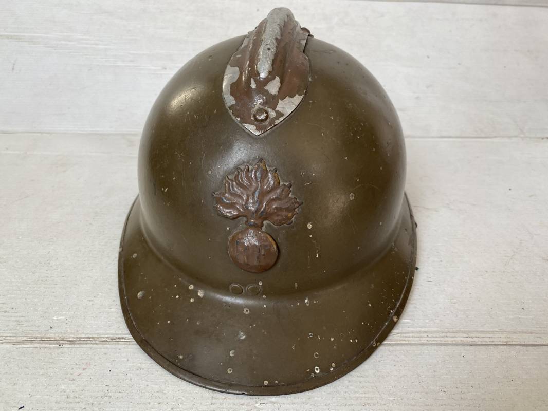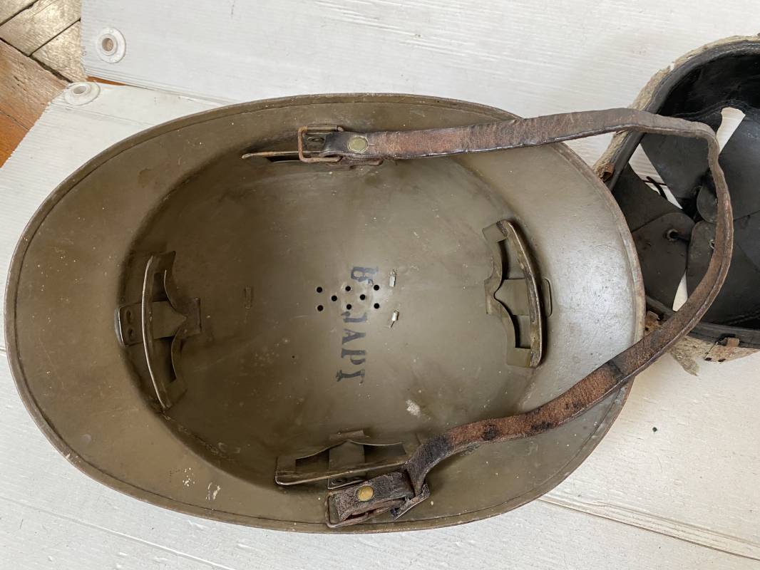 Bon casque Adrian modèle 1926 de l'Infanterie, cimier alu. Belle peinture kaki mate d'usinage. Tampon encre fabricant 'Japy' en fond de bombe. Coque taille B. Insigne frontal modèle 1915 à grenade de l'Infanterie, Cavalerie, Train. Lamelles métalliques intérieures. Jugulaire en cuir fauve et boucle métallique d'origines. Coiffe intérieure en cuir glacé noir. Tampon réception et de taille à l'encre blanc. Date illisible. Taille 55. Lacet coton noir. Fixation pour crochets métalliques, feutrine en partie manquante. Casque porté en bel état. Belle pièce dans son jus, typique de la Bataille de France Mai/Juin 1940. Ref 14253
