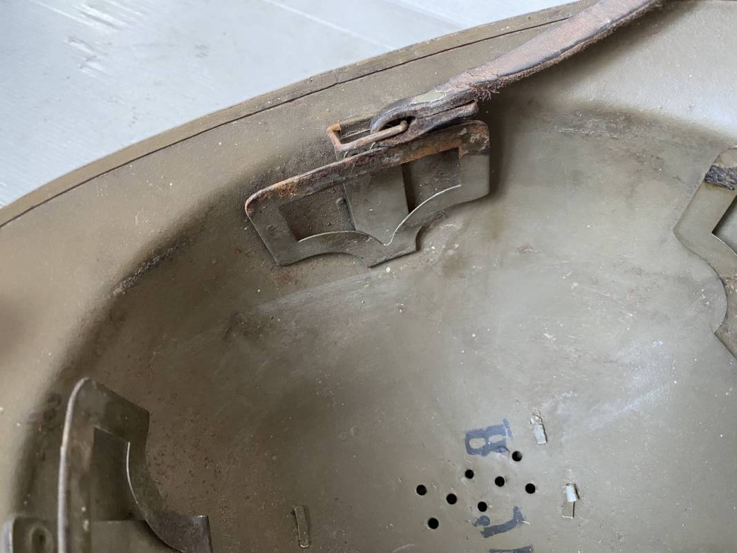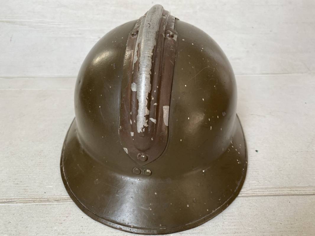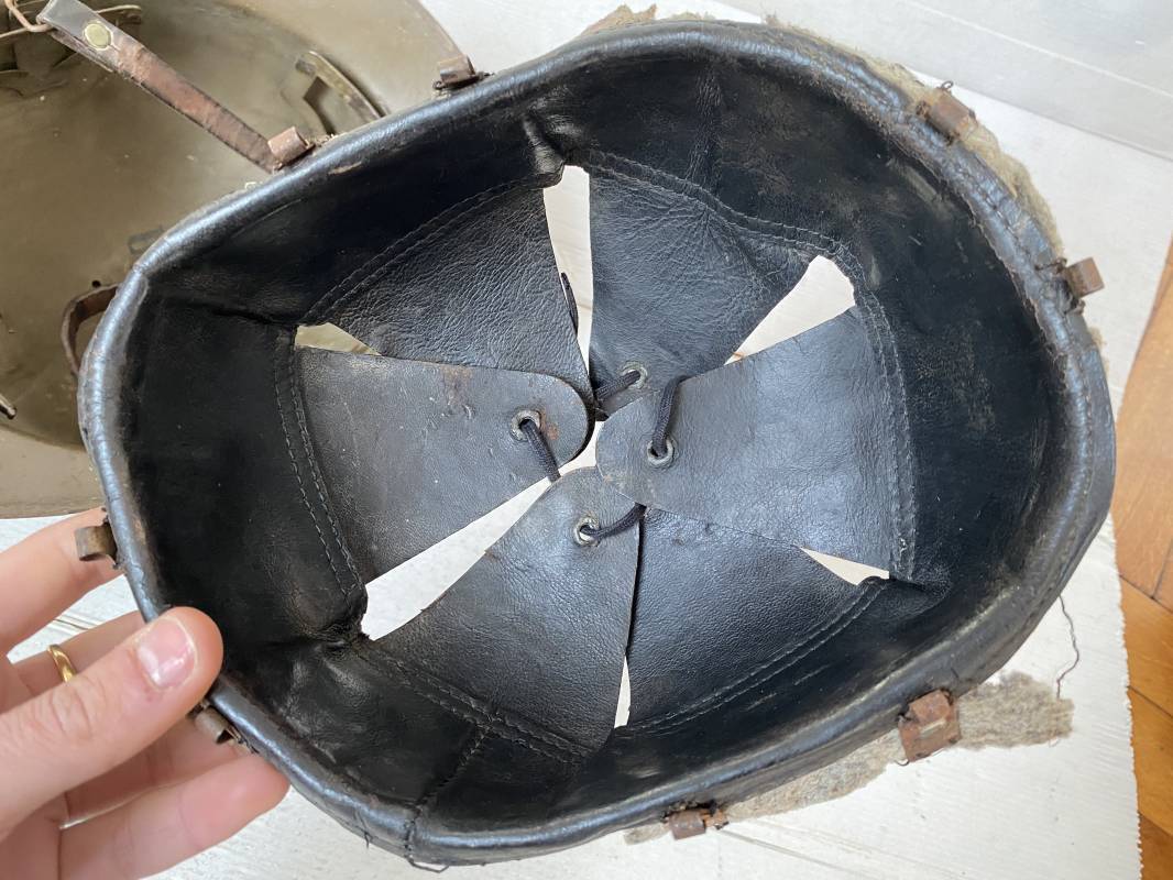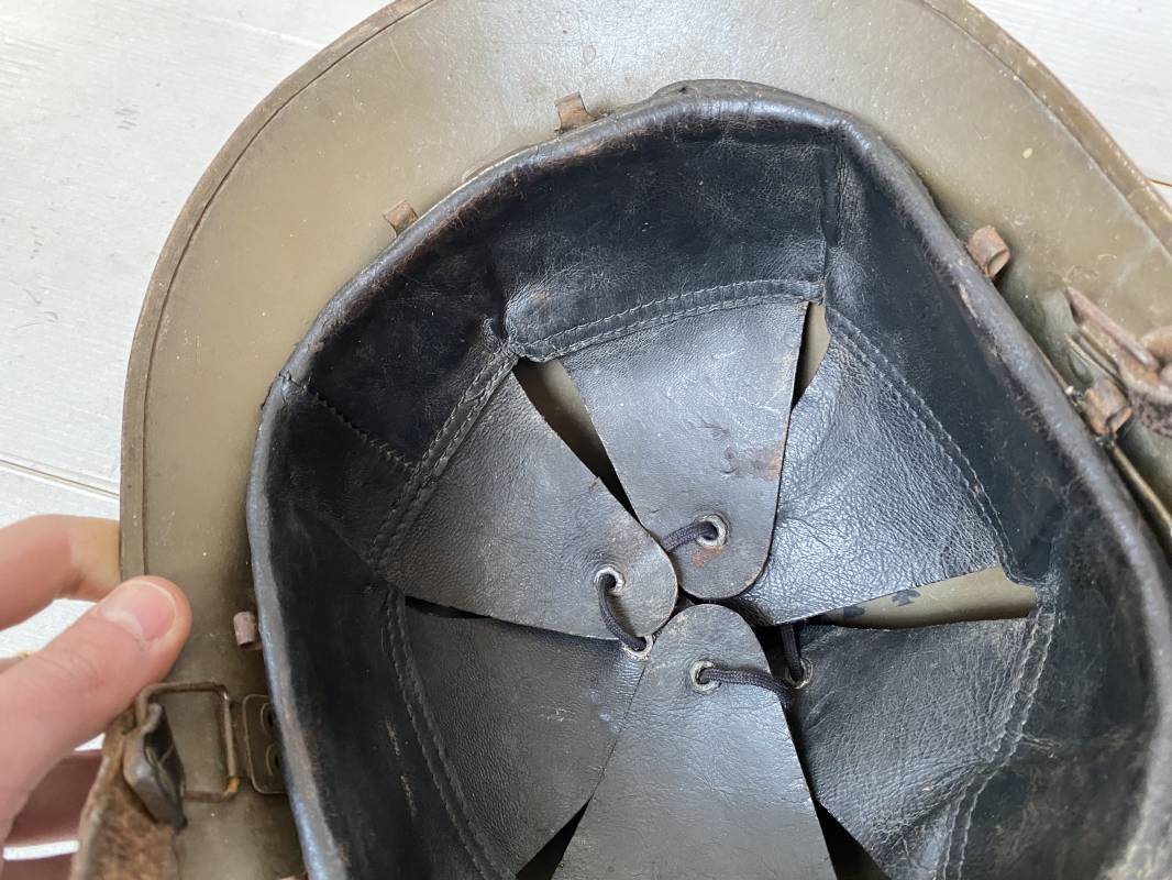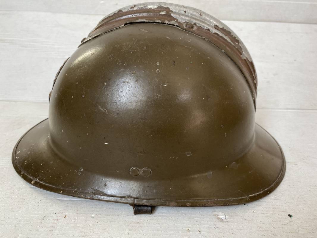 Bon casque Adrian modèle 1926 de l'Infanterie, cimier alu. Belle peinture kaki mate d'usinage. Tampon encre fabricant 'Japy' en fond de bombe. Coque taille B. Insigne frontal modèle 1915 à grenade de l'Infanterie, Cavalerie, Train. Lamelles métalliques intérieures. Jugulaire en cuir fauve et boucle métallique d'origines. Coiffe intérieure en cuir glacé noir. Tampon réception et de taille à l'encre blanc. Date illisible. Taille 55. Lacet coton noir. Fixation pour crochets métalliques, feutrine en partie manquante. Casque porté en bel état. Belle pièce dans son jus, typique de la Bataille de France Mai/Juin 1940. Ref 14253