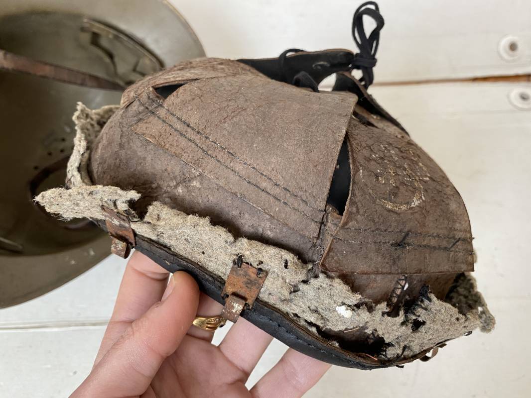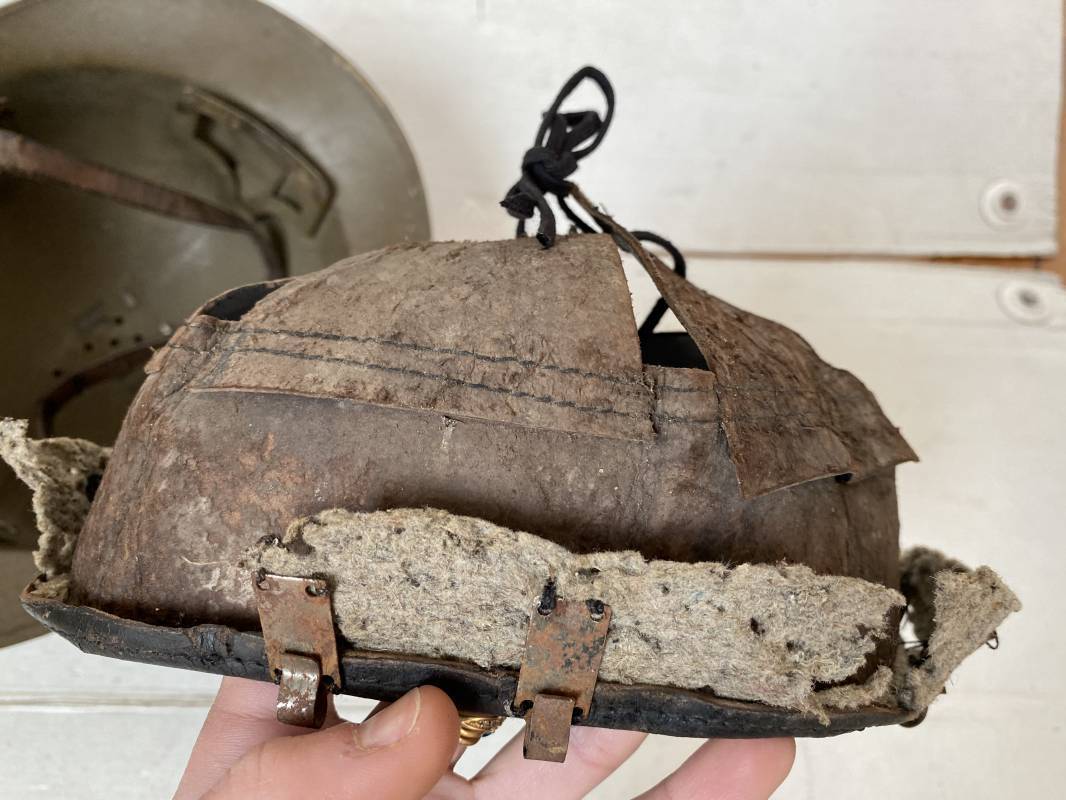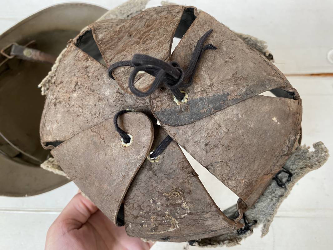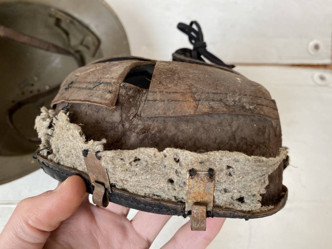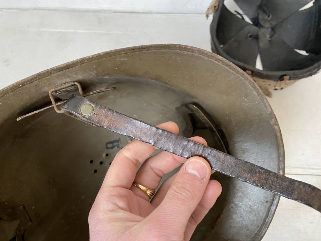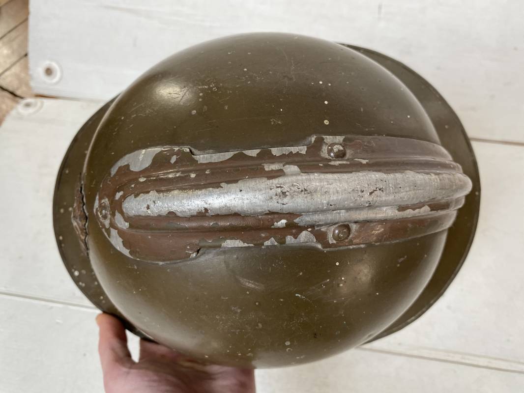 Bon casque Adrian modèle 1926 de l'Infanterie, cimier alu. Belle peinture kaki mate d'usinage. Tampon encre fabricant 'Japy' en fond de bombe. Coque taille B. Insigne frontal modèle 1915 à grenade de l'Infanterie, Cavalerie, Train. Lamelles métalliques intérieures. Jugulaire en cuir fauve et boucle métallique d'origines. Coiffe intérieure en cuir glacé noir. Tampon réception et de taille à l'encre blanc. Date illisible. Taille 55. Lacet coton noir. Fixation pour crochets métalliques, feutrine en partie manquante. Casque porté en bel état. Belle pièce dans son jus, typique de la Bataille de France Mai/Juin 1940. Ref 14253