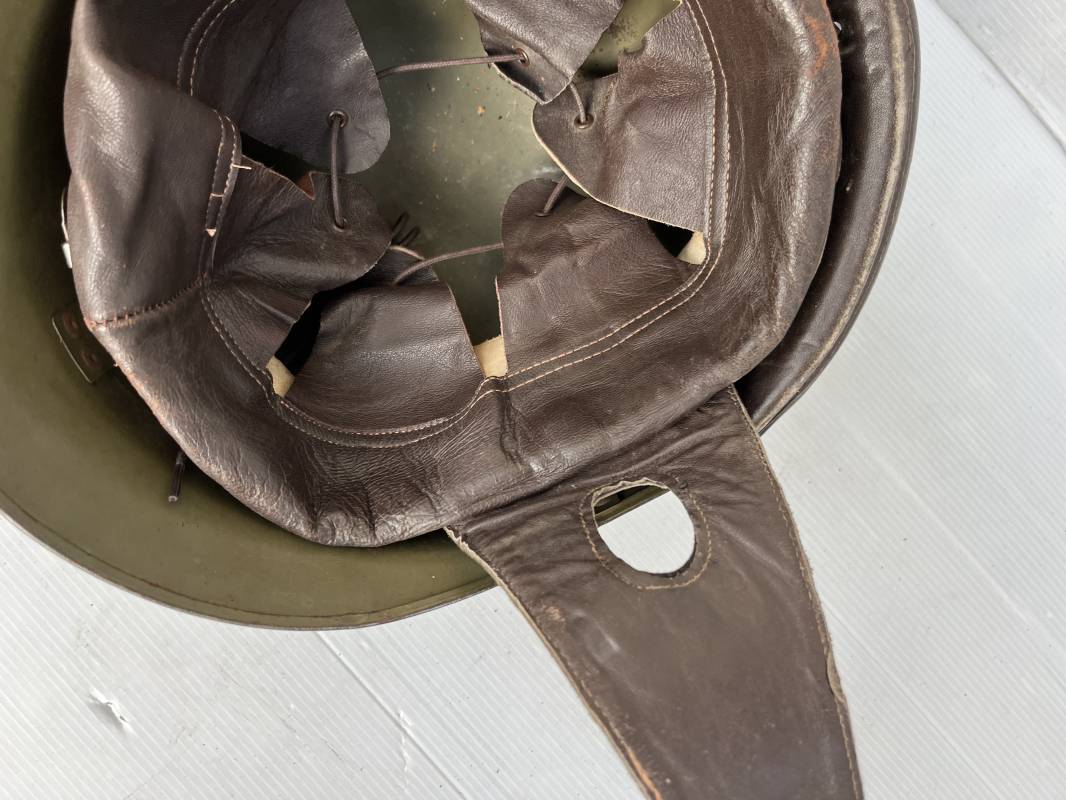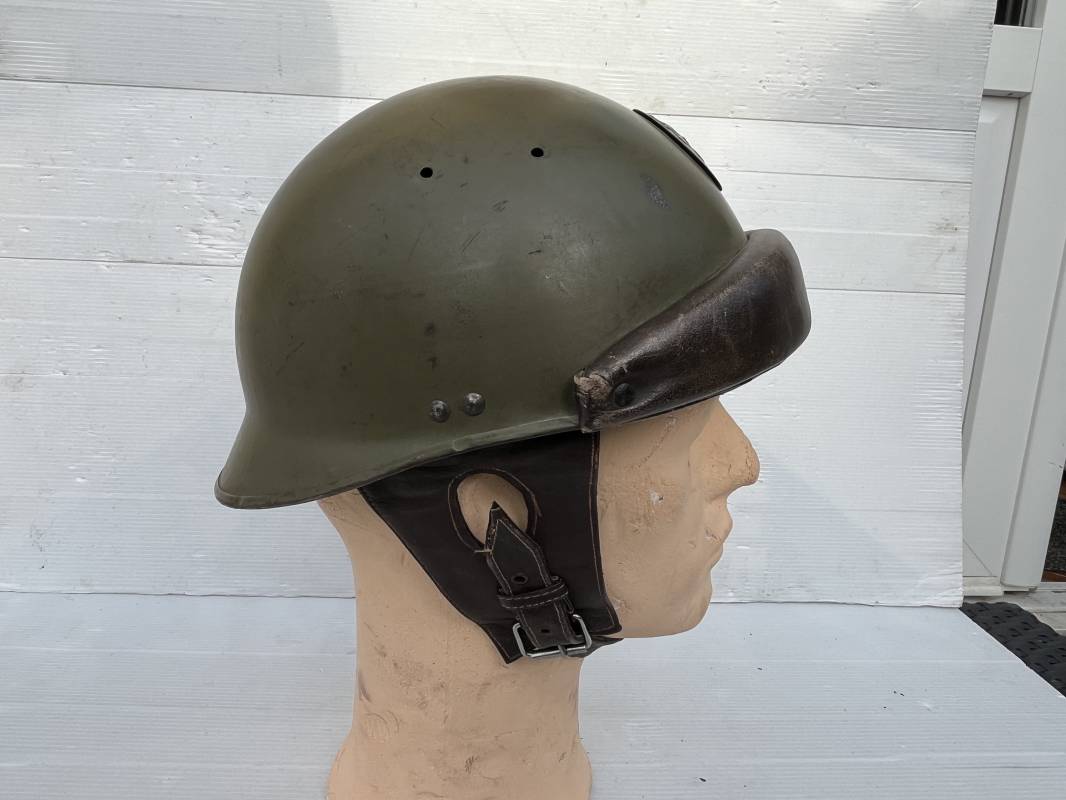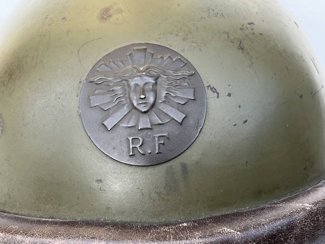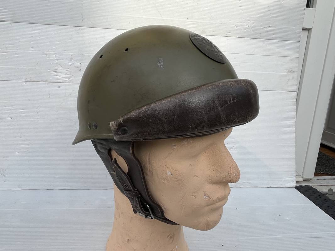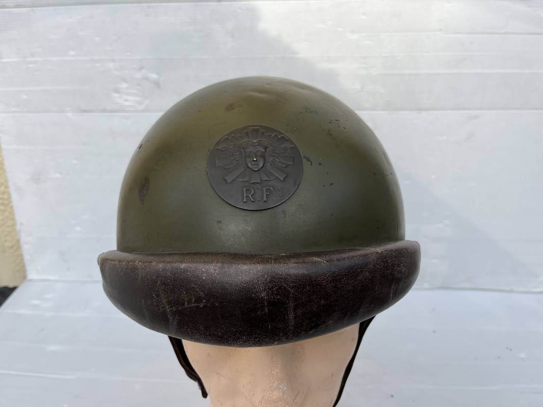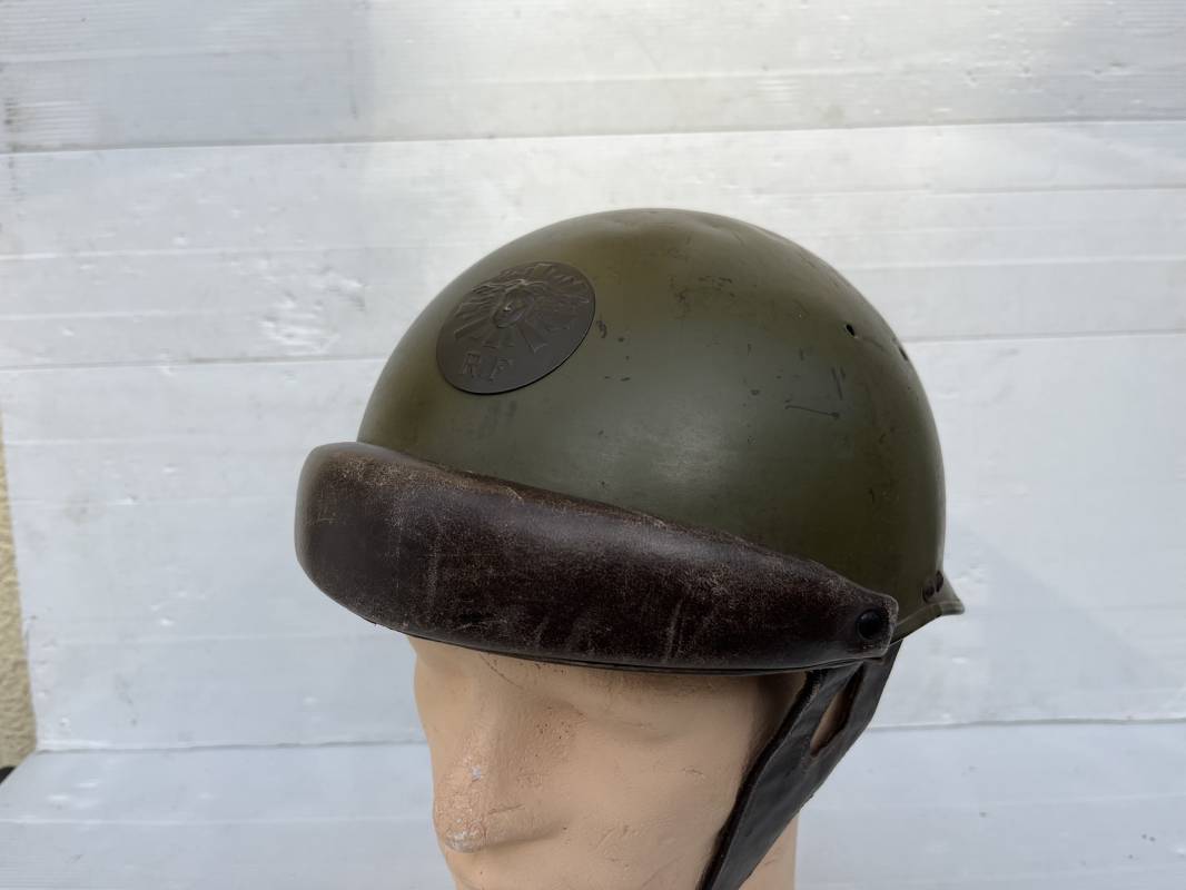 Rare casque modèle 1935 du 2me type reconnaissance blindée . Casque modèle 1935 du deuxième type avec bourrelet cuir marron foncé . Trés belle peinture d usinage kaki claire . Peinture non frottée . Insigne frontal Pastille modèle 1937 ' Téte de méduse ' des unités de reconnaissance legères blindées . A noté sur l insigne a tete de méduse , le point de soudure rond électrique typique des insignes authentiques . Quatre lamelles ressort metallique de fixation de la coiffe intérieur . Tampon noir marquage fabricant FRANCK Coiffe interieure en cuir marron foncé du deuxième type ( avec le petit rabat en cuir sur le devant ) , bavolets , boucle métallique de fermeture Cuir souple. taille 57 . Tampon rond de fabricant daté 1940 . Lacet d'origine en coton marron . Rare casque trés légérement porté et en superbe état . Rare coiffure dont dont nous garantissons l'authenticité absolue .Coiffure définitive en collection . Ce rare casque a été trouvé en succession familiale a Paris . Casque typique du tankiste francais en 1939/40 Ref 19638