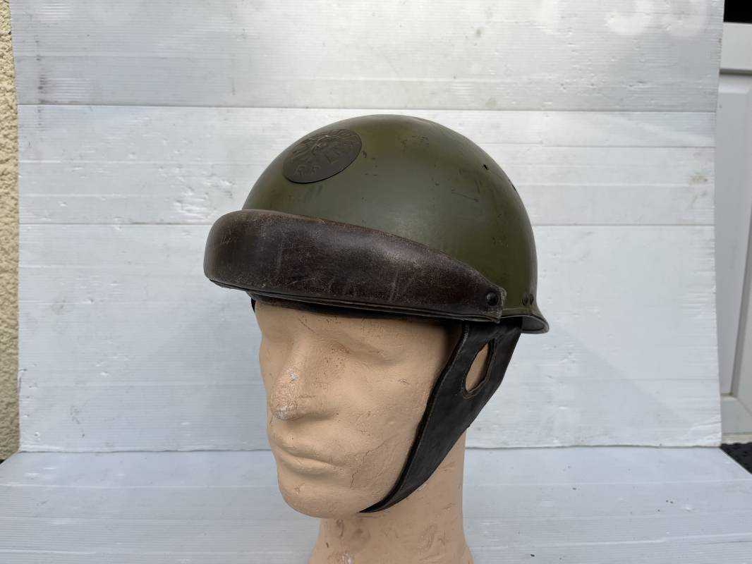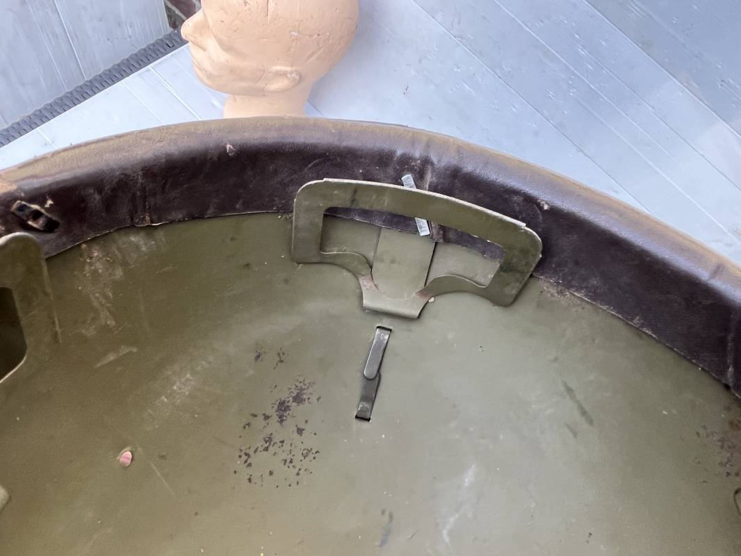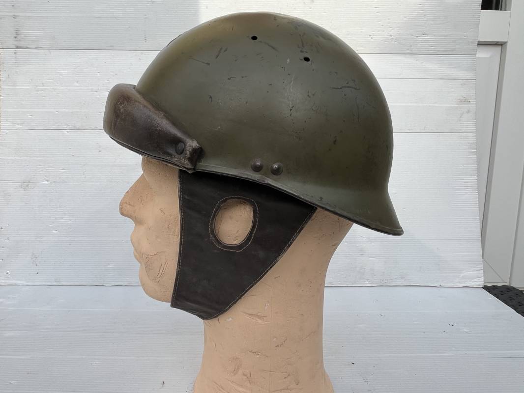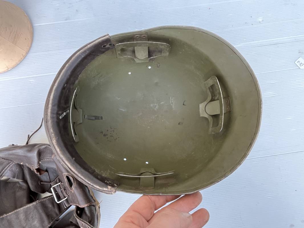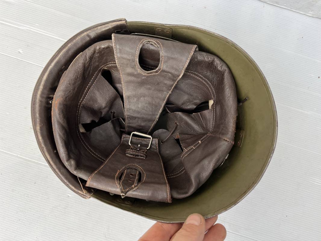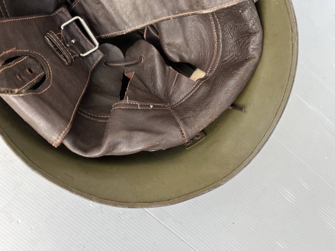 Rare casque modèle 1935 du 2me type reconnaissance blindée . Casque modèle 1935 du deuxième type avec bourrelet cuir marron foncé . Trés belle peinture d usinage kaki claire . Peinture non frottée . Insigne frontal Pastille modèle 1937 ' Téte de méduse ' des unités de reconnaissance legères blindées . A noté sur l insigne a tete de méduse , le point de soudure rond électrique typique des insignes authentiques . Quatre lamelles ressort metallique de fixation de la coiffe intérieur . Tampon noir marquage fabricant FRANCK Coiffe interieure en cuir marron foncé du deuxième type ( avec le petit rabat en cuir sur le devant ) , bavolets , boucle métallique de fermeture Cuir souple. taille 57 . Tampon rond de fabricant daté 1940 . Lacet d'origine en coton marron . Rare casque trés légérement porté et en superbe état . Rare coiffure dont dont nous garantissons l'authenticité absolue .Coiffure définitive en collection . Ce rare casque a été trouvé en succession familiale a Paris . Casque typique du tankiste francais en 1939/40 Ref 19638