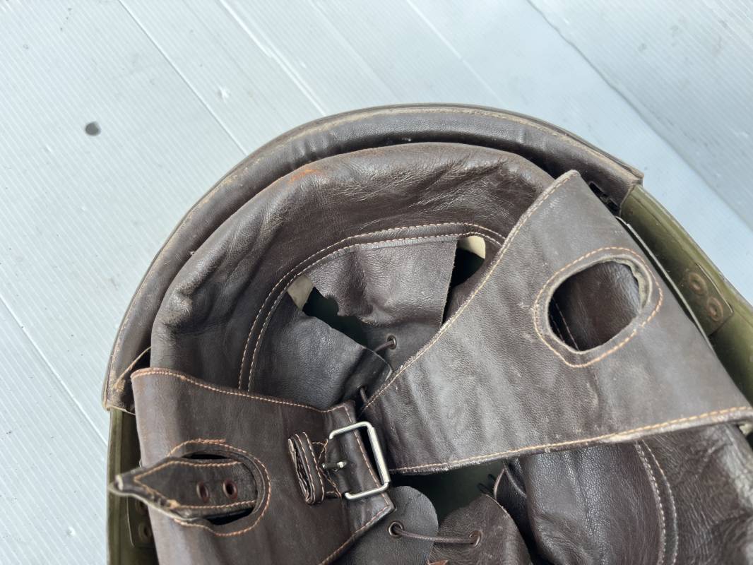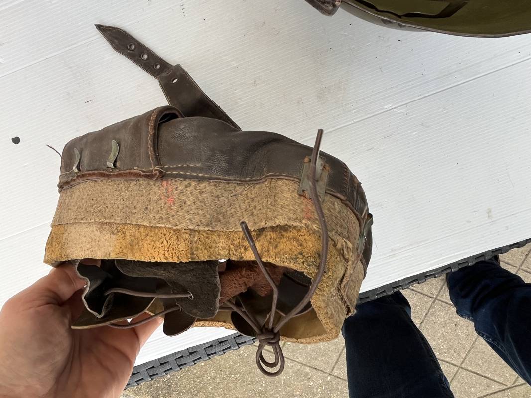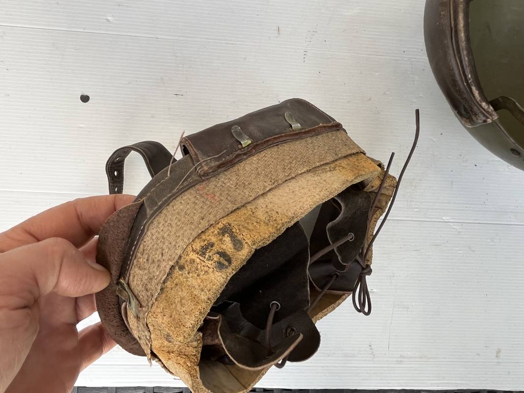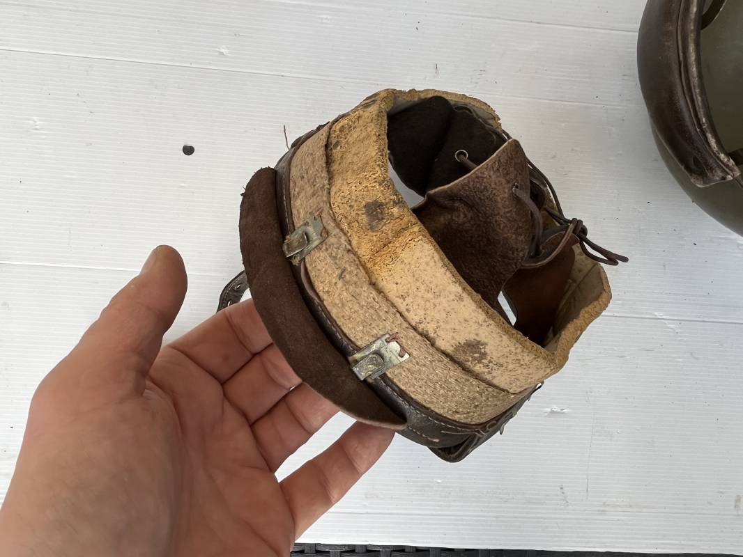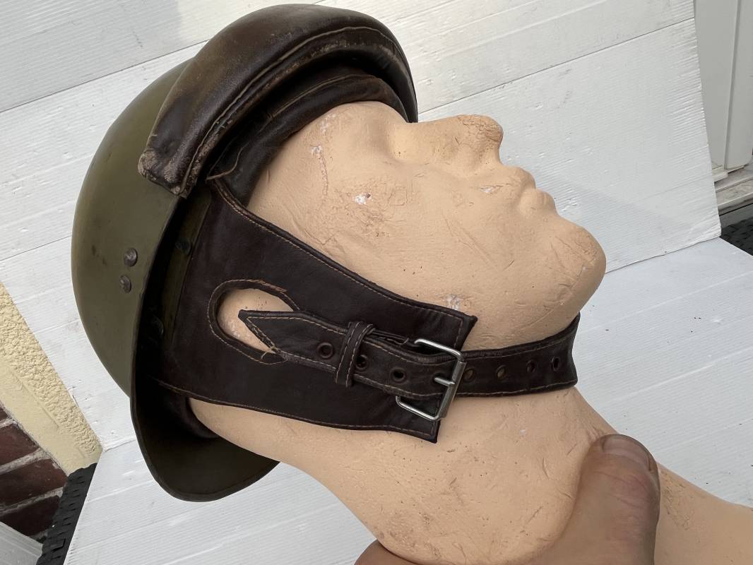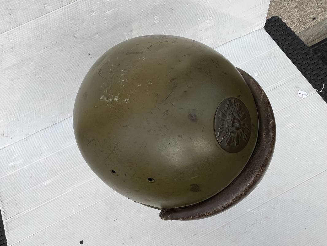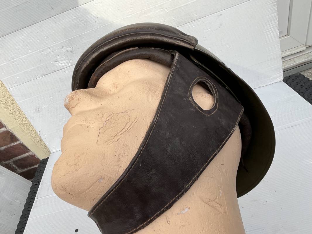 Rare casque modèle 1935 du 2me type reconnaissance blindée . Casque modèle 1935 du deuxième type avec bourrelet cuir marron foncé . Trés belle peinture d usinage kaki claire . Peinture non frottée . Insigne frontal Pastille modèle 1937 ' Téte de méduse ' des unités de reconnaissance legères blindées . A noté sur l insigne a tete de méduse , le point de soudure rond électrique typique des insignes authentiques . Quatre lamelles ressort metallique de fixation de la coiffe intérieur . Tampon noir marquage fabricant FRANCK Coiffe interieure en cuir marron foncé du deuxième type ( avec le petit rabat en cuir sur le devant ) , bavolets , boucle métallique de fermeture Cuir souple. taille 57 . Tampon rond de fabricant daté 1940 . Lacet d'origine en coton marron . Rare casque trés légérement porté et en superbe état . Rare coiffure dont dont nous garantissons l'authenticité absolue .Coiffure définitive en collection . Ce rare casque a été trouvé en succession familiale a Paris . Casque typique du tankiste francais en 1939/40 Ref 19638