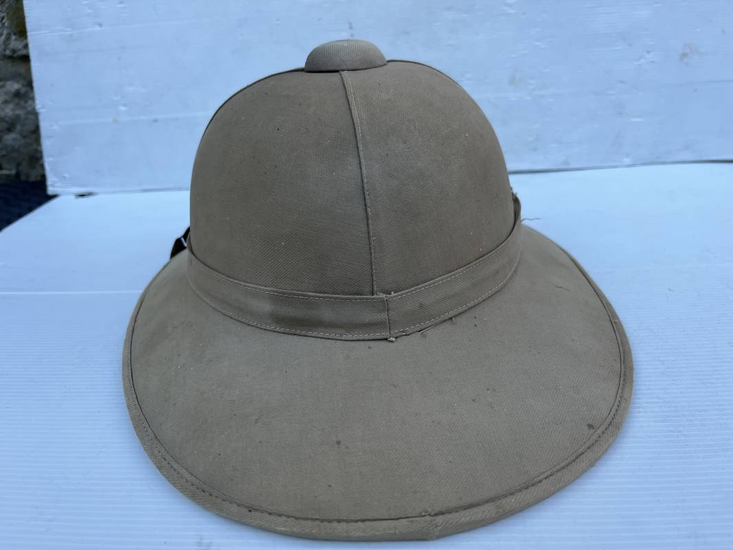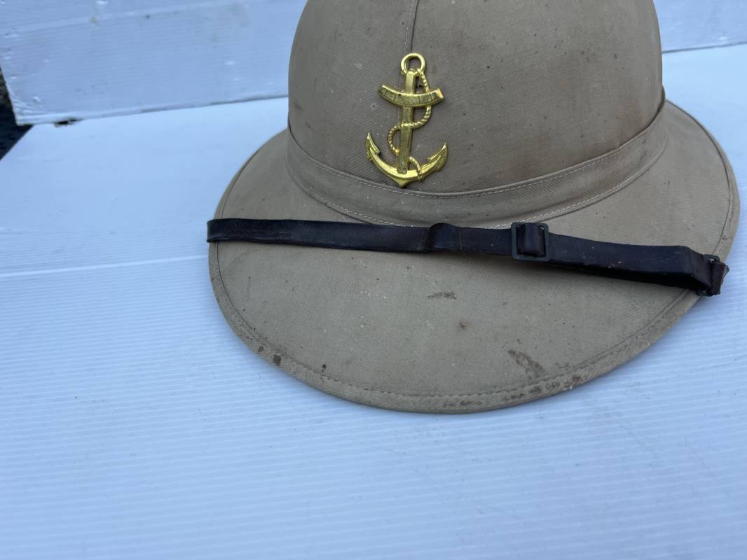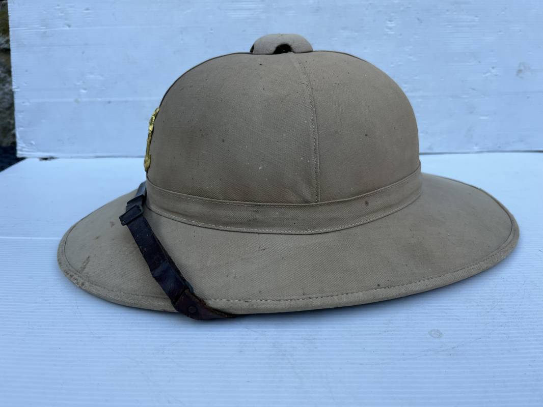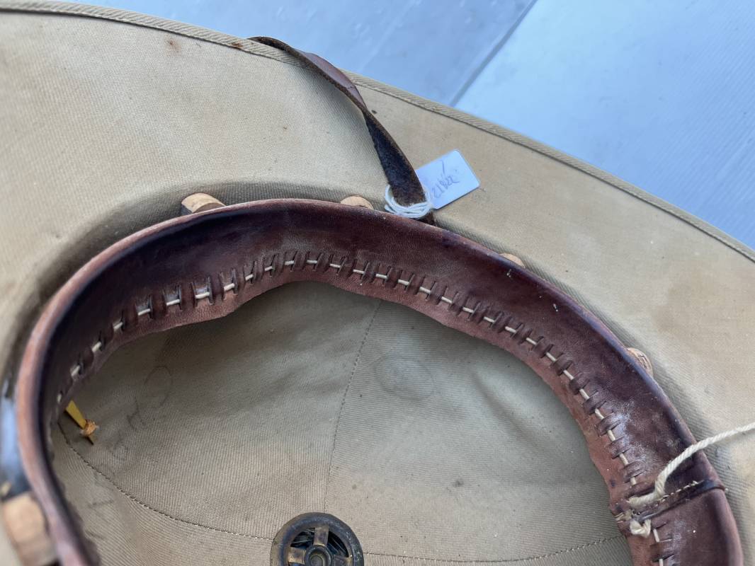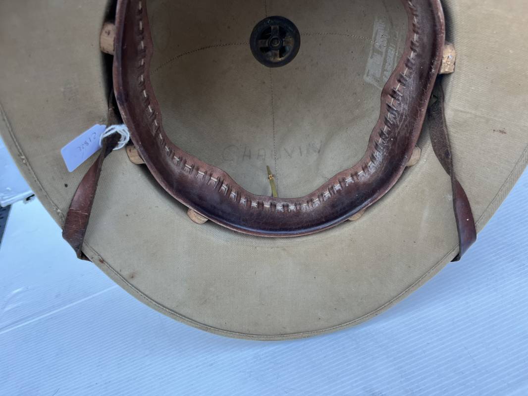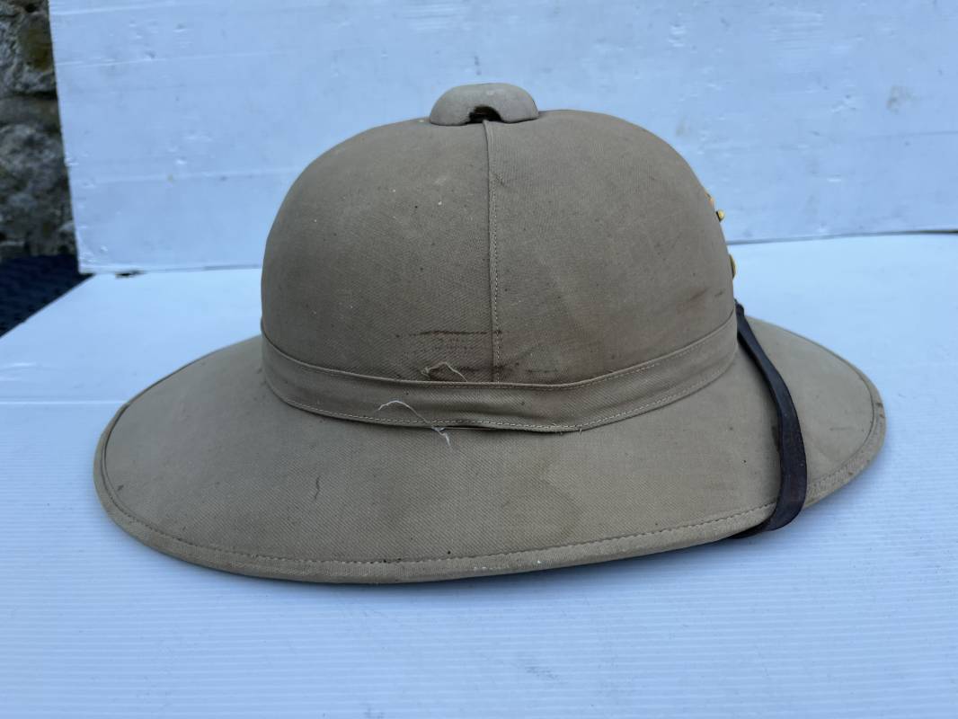 Trés beau casque colonial modéle 1931 des troupes coloniales . Casque en liége recouvert toile de coton kaki clair , aérateur sur le dessus . Belle forme , liège non cassé ni enfoncé .Insigne métallique doré modéle 1929 des troupes coloniales fixé sur le devant Jugulaire en cuir marron et boucle métallique . Intérieur doublé en toile de coton kaki . Marquage encre noire du fabricant à marseille Taille 56 . . coiffe intérieure en cuir marron avec petit lacet en cordelette . Trés beau casque légèrement porté en parfait état Ref 21822