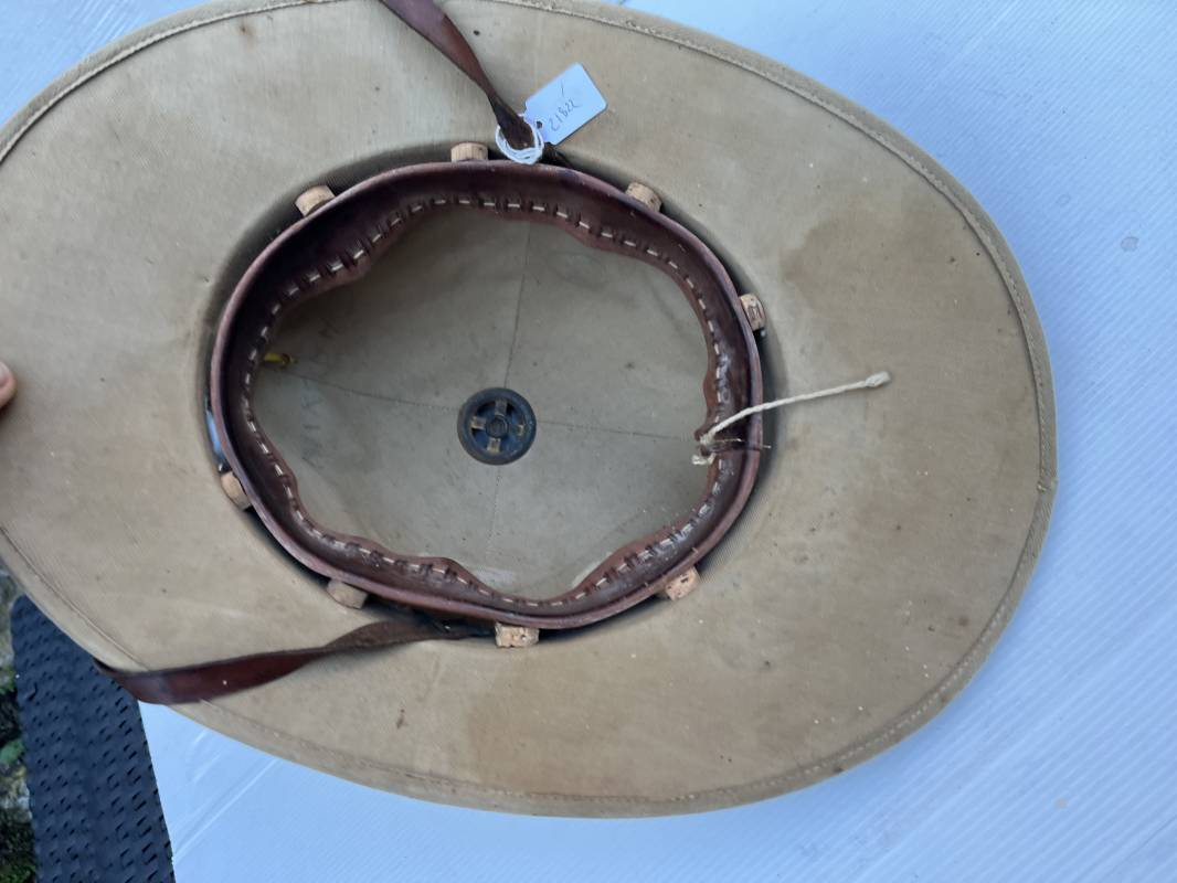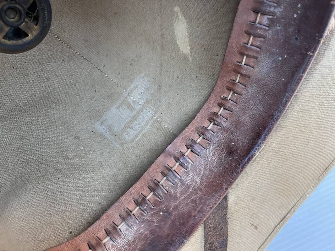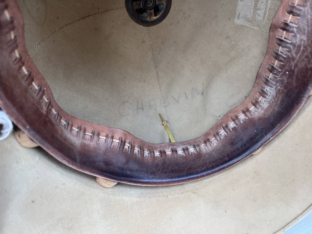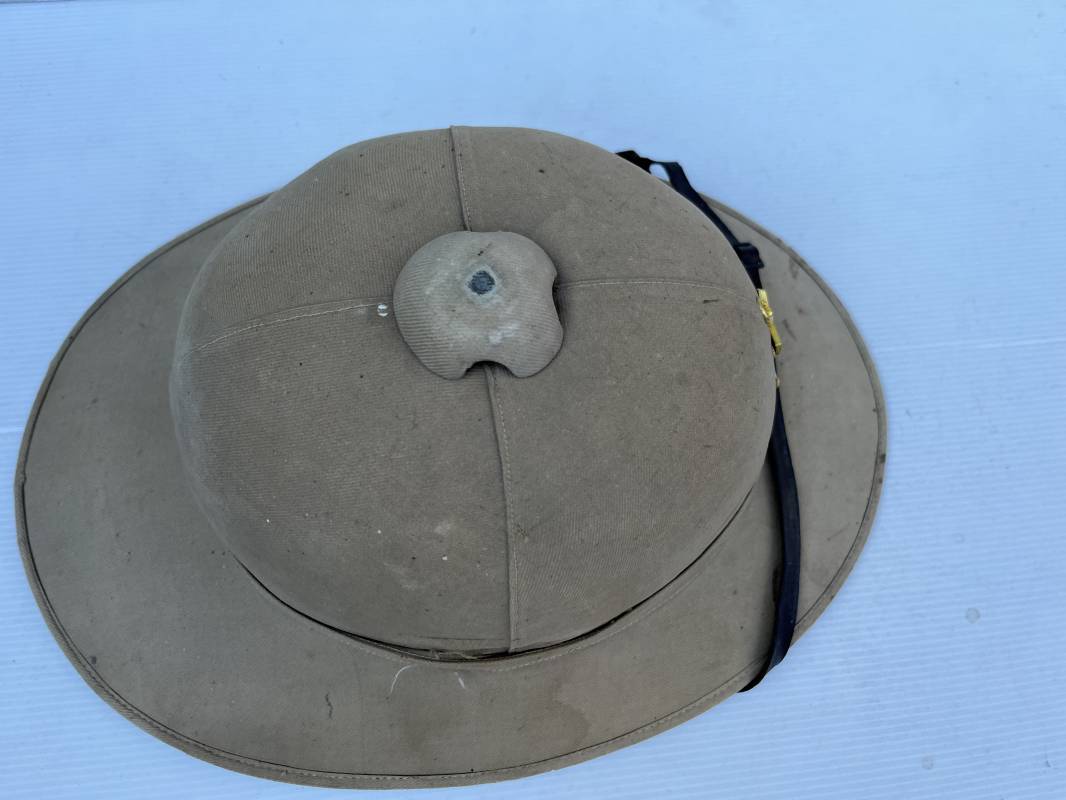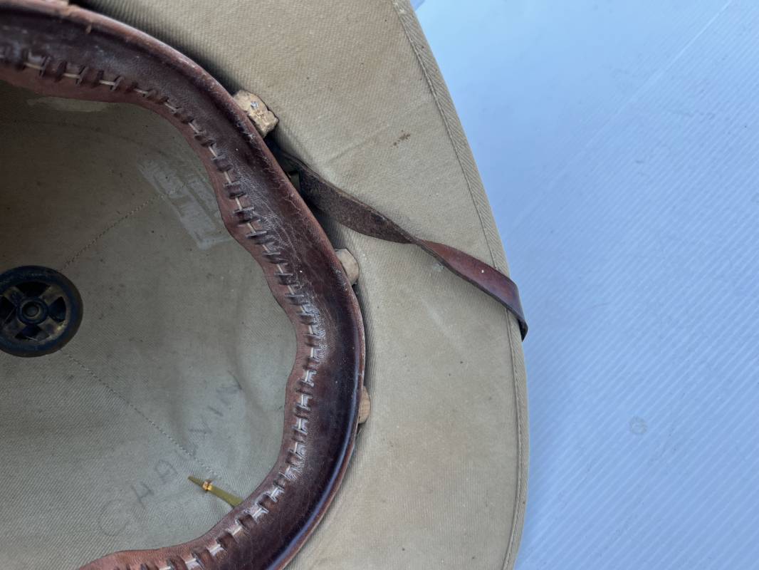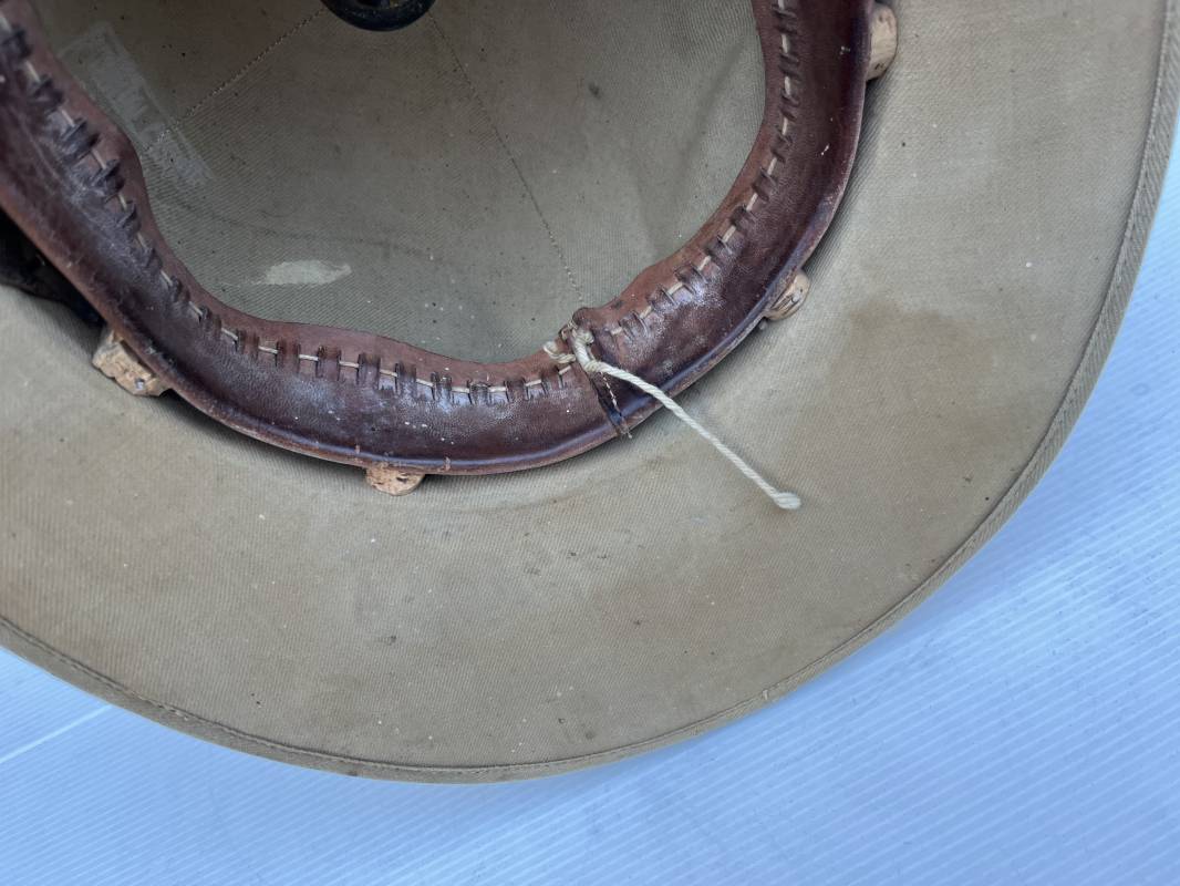 Trés beau casque colonial modéle 1931 des troupes coloniales . Casque en liége recouvert toile de coton kaki clair , aérateur sur le dessus . Belle forme , liège non cassé ni enfoncé .Insigne métallique doré modéle 1929 des troupes coloniales fixé sur le devant Jugulaire en cuir marron et boucle métallique . Intérieur doublé en toile de coton kaki . Marquage encre noire du fabricant à marseille Taille 56 . . coiffe intérieure en cuir marron avec petit lacet en cordelette . Trés beau casque légèrement porté en parfait état Ref 21822