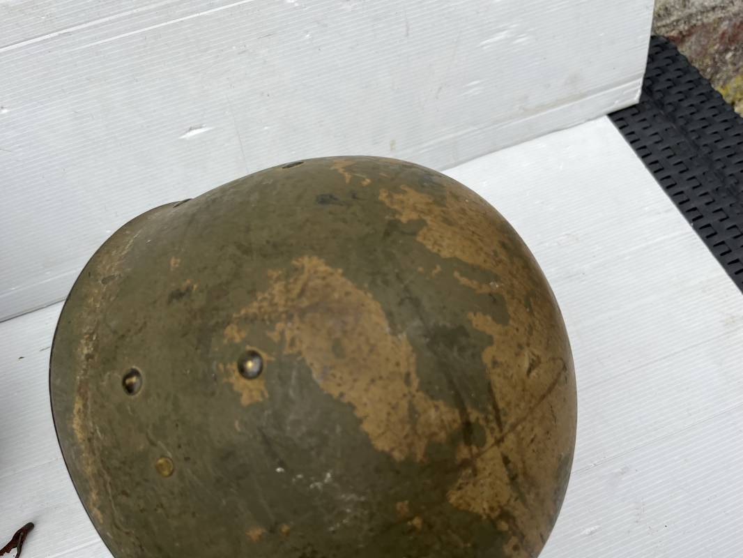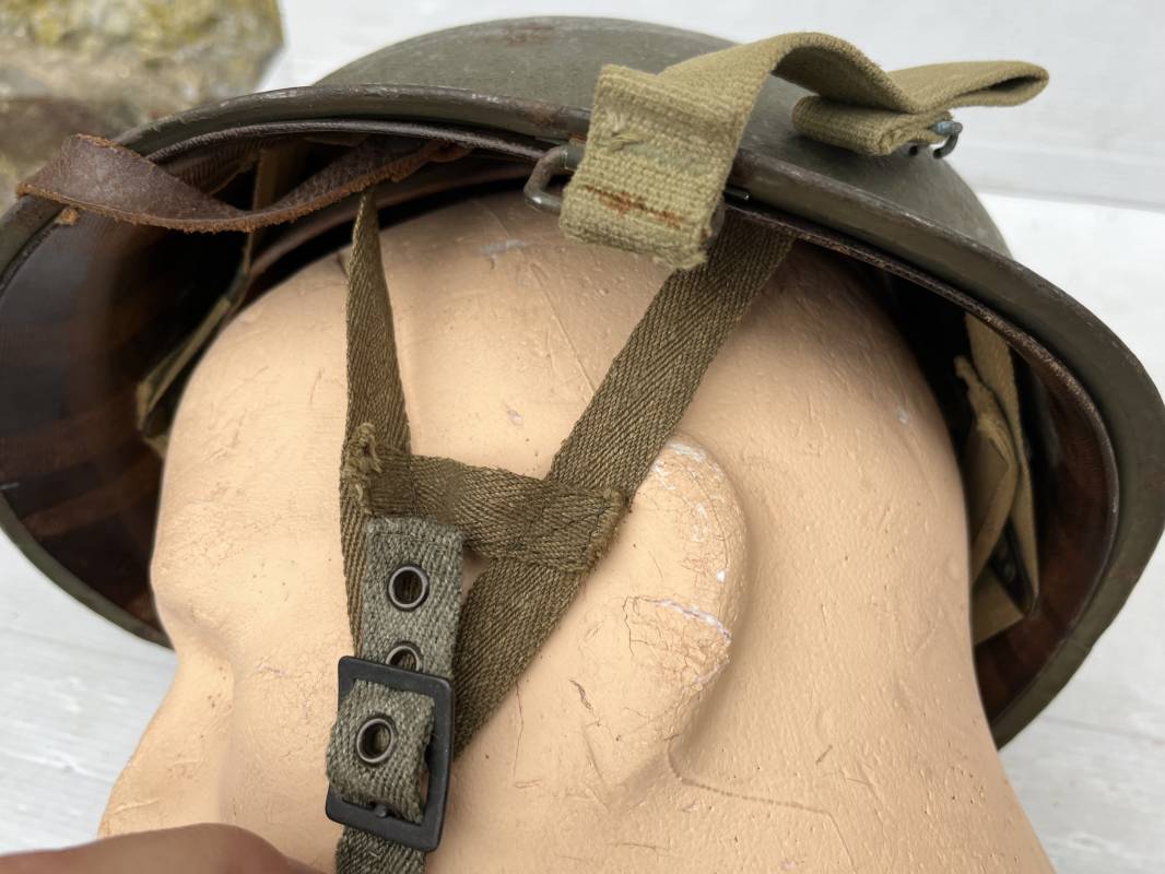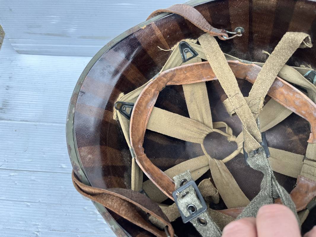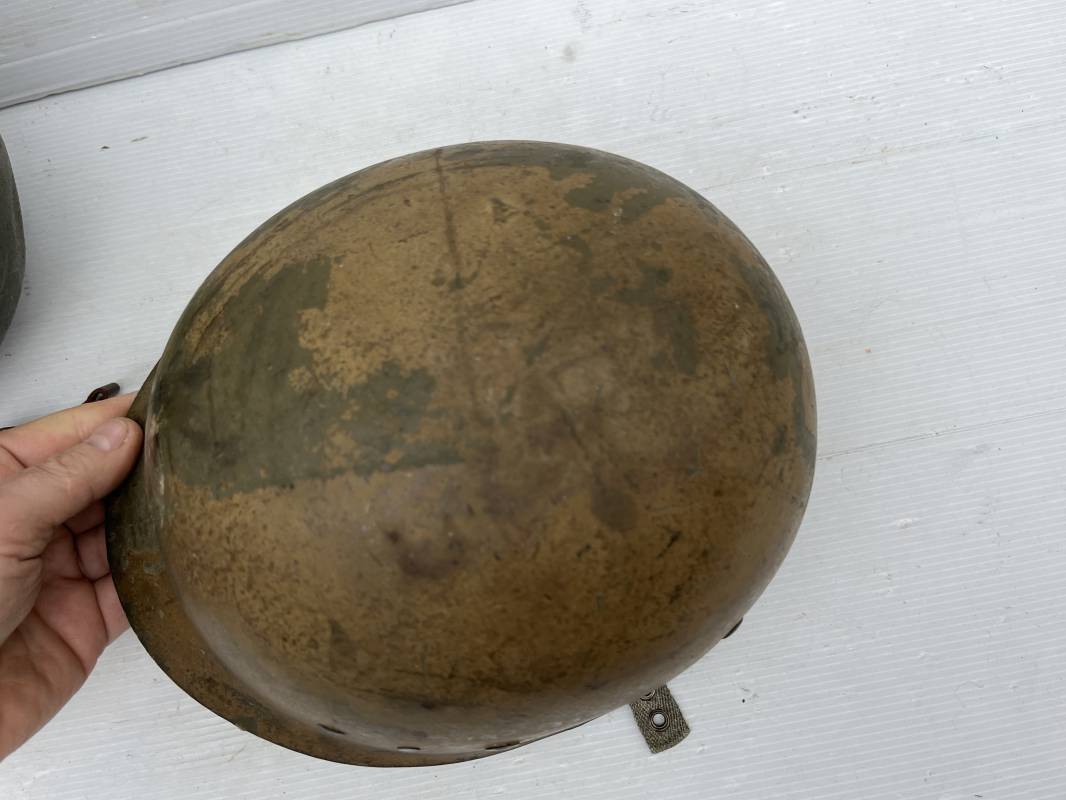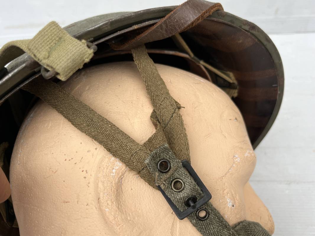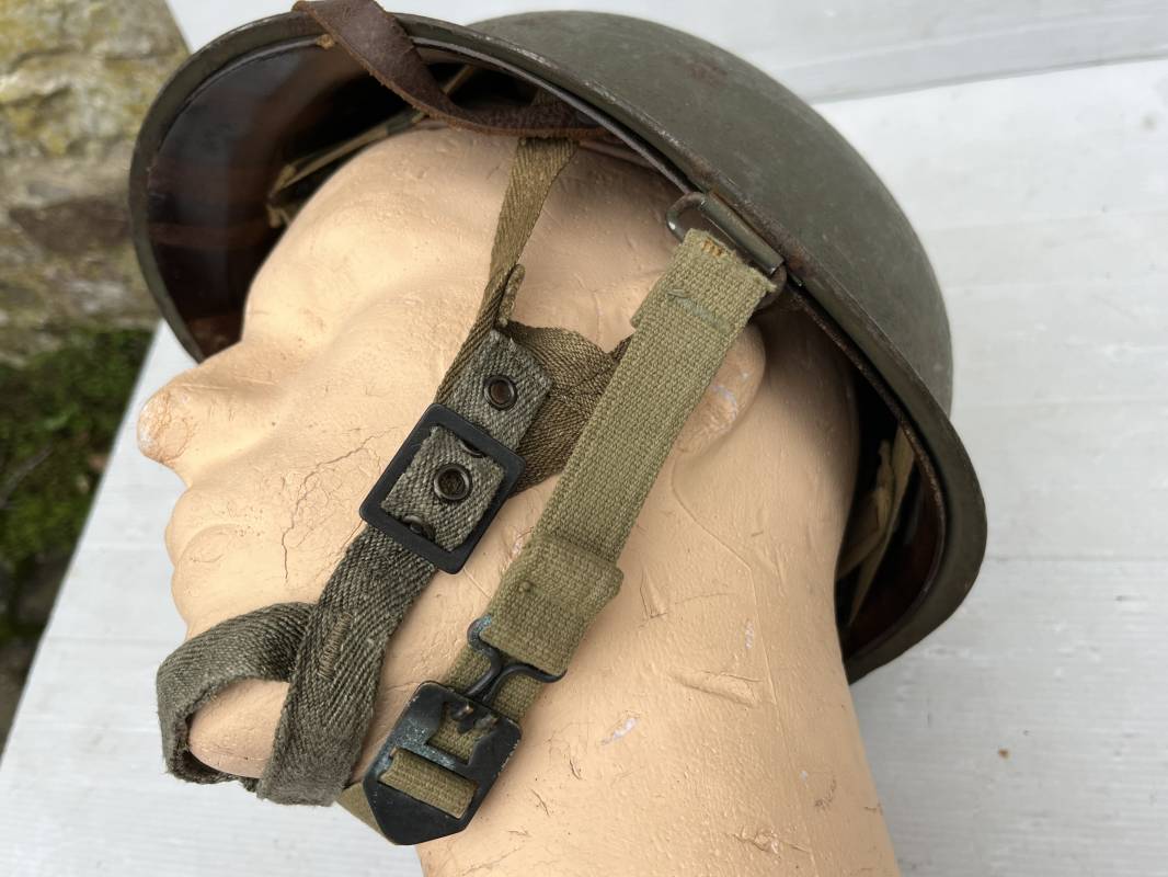 Rare casque US modifié 1951 Armée Francaise pour unitée Aéroportée . Ce casque a ete trouvé en succession familiale a Amiens ( 80) et n a jamais été en collection . Casque US Leger ( liner) , maquage fabricant Fireston en fond de bombe . Intérieur avec bandeau cuir , lacet coton , nuquière . Modification armee francaise par l ajout de jugulaire en V du modéle 1951 . Jugulaire rivetée sur liner . Boucle métallique a un ardillon . Mentonnière en toile type 1951 . Jugulaire du liner en cuir marron avec clapet a boucle plate .Peinture extérieur du liner camouflée marron et vert . Insigne général du modele pour Parachutiste peint blanc sur le devant du casque . Casque lourd US du modéle general a jugulaire mobile . Jonc arrière marquage a l interieur avant de la bombe '1285B' Fabricant Mc Cord . Belle peinture d usinage OD Peinture extérieure semi granuleuse . Bon casque porté en trés bel état . 1950/55 Peu courant Ref 21207