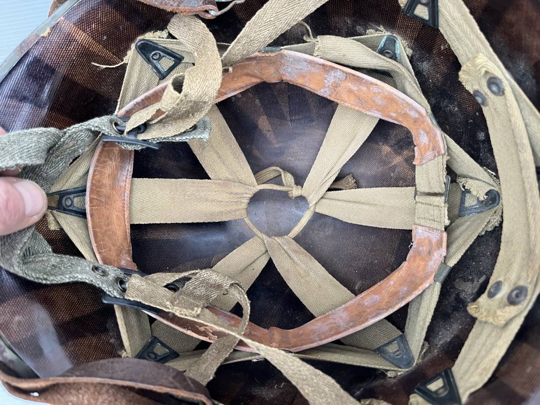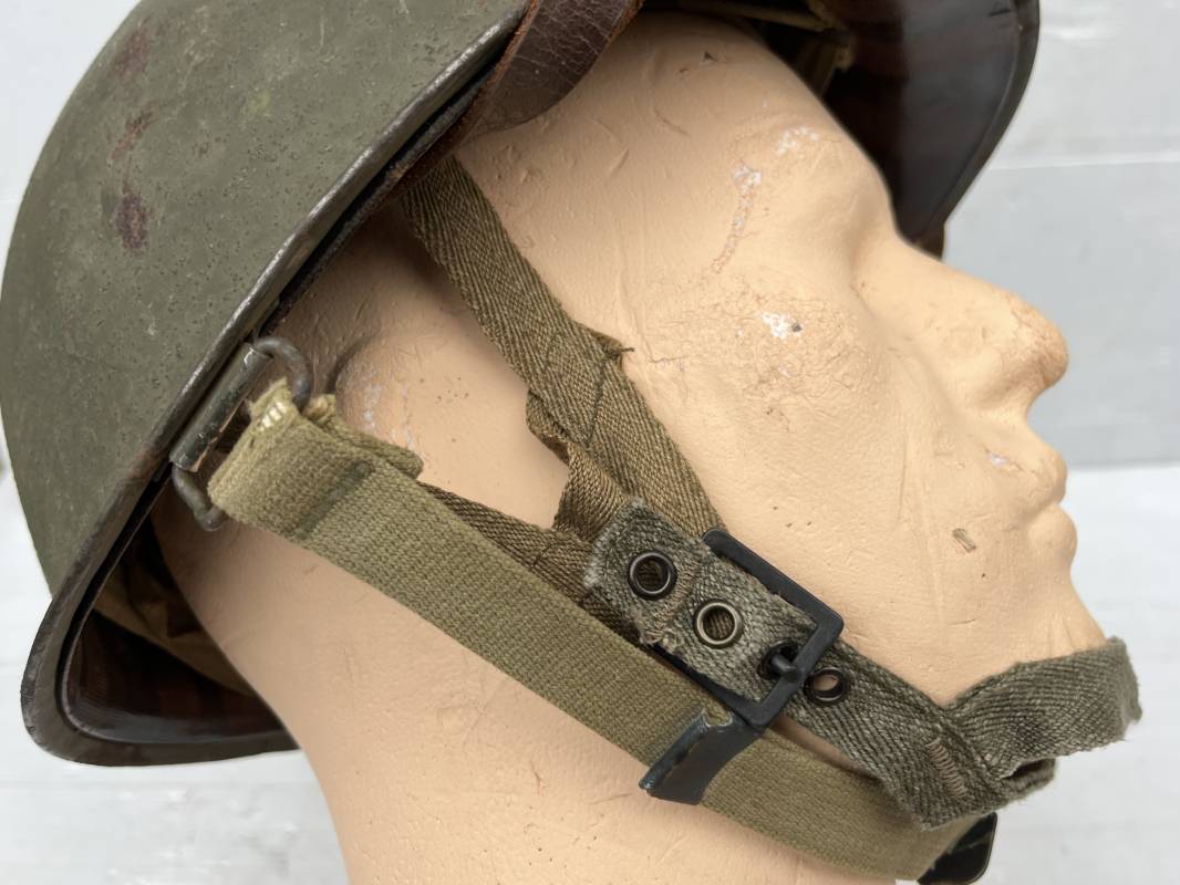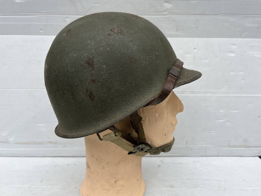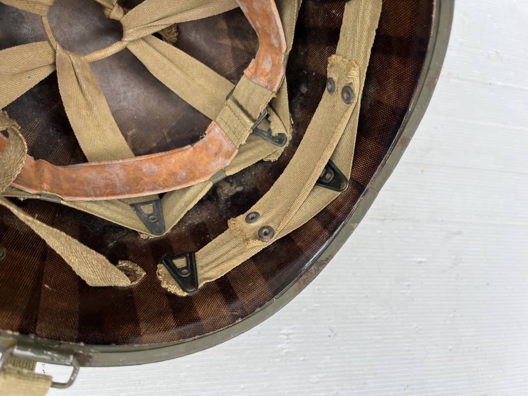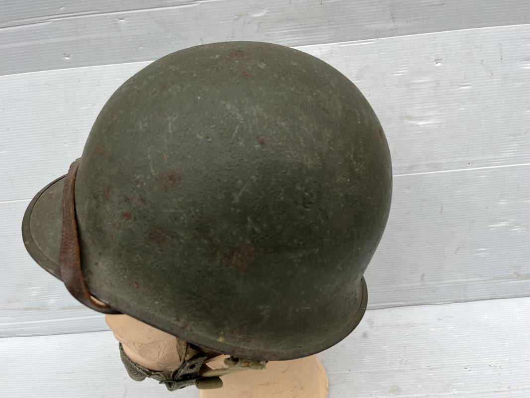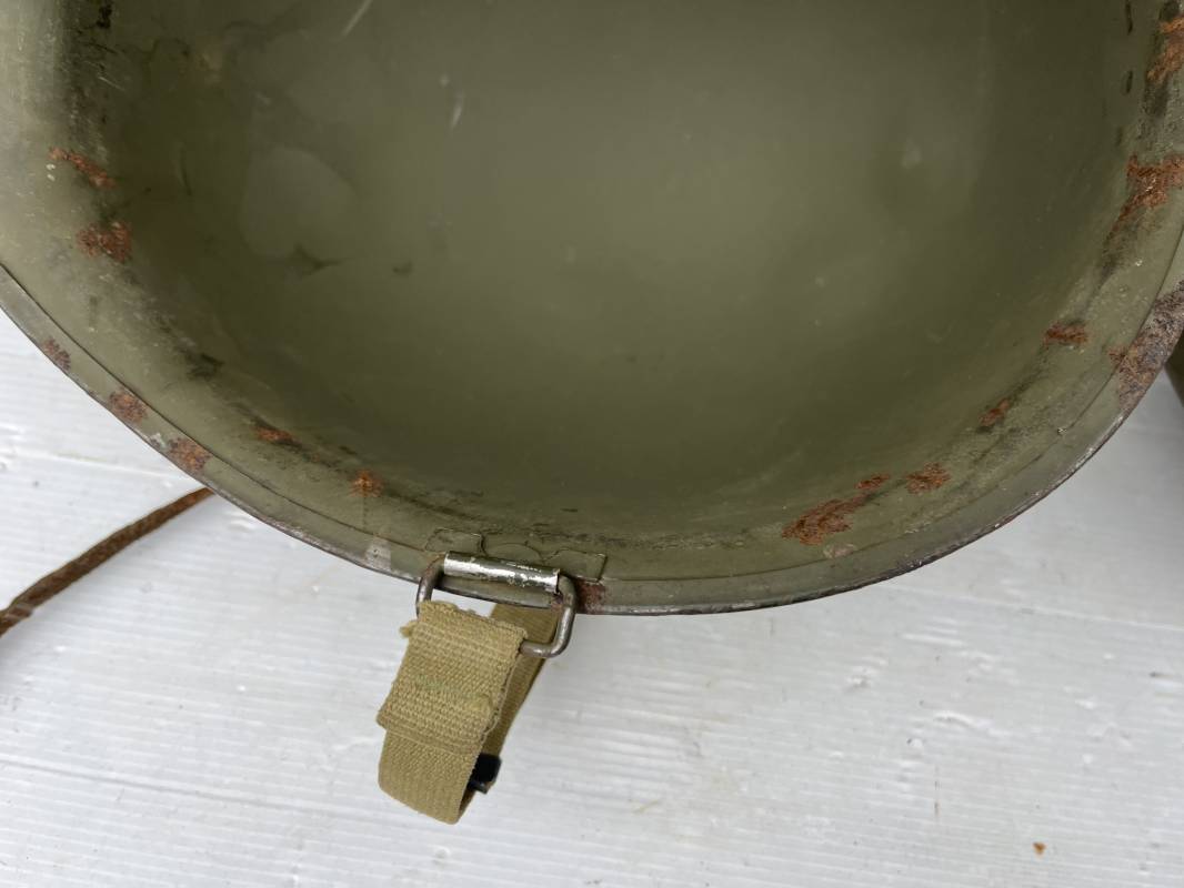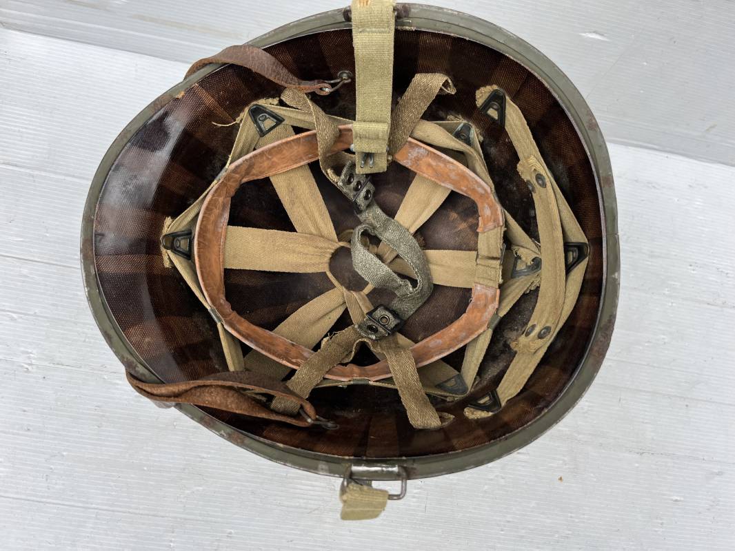 Rare casque US modifié 1951 Armée Francaise pour unitée Aéroportée . Ce casque a ete trouvé en succession familiale a Amiens ( 80) et n a jamais été en collection . Casque US Leger ( liner) , maquage fabricant Fireston en fond de bombe . Intérieur avec bandeau cuir , lacet coton , nuquière . Modification armee francaise par l ajout de jugulaire en V du modéle 1951 . Jugulaire rivetée sur liner . Boucle métallique a un ardillon . Mentonnière en toile type 1951 . Jugulaire du liner en cuir marron avec clapet a boucle plate .Peinture extérieur du liner camouflée marron et vert . Insigne général du modele pour Parachutiste peint blanc sur le devant du casque . Casque lourd US du modéle general a jugulaire mobile . Jonc arrière marquage a l interieur avant de la bombe '1285B' Fabricant Mc Cord . Belle peinture d usinage OD Peinture extérieure semi granuleuse . Bon casque porté en trés bel état . 1950/55 Peu courant Ref 21207
