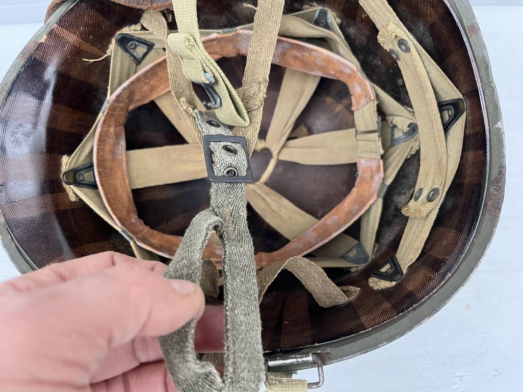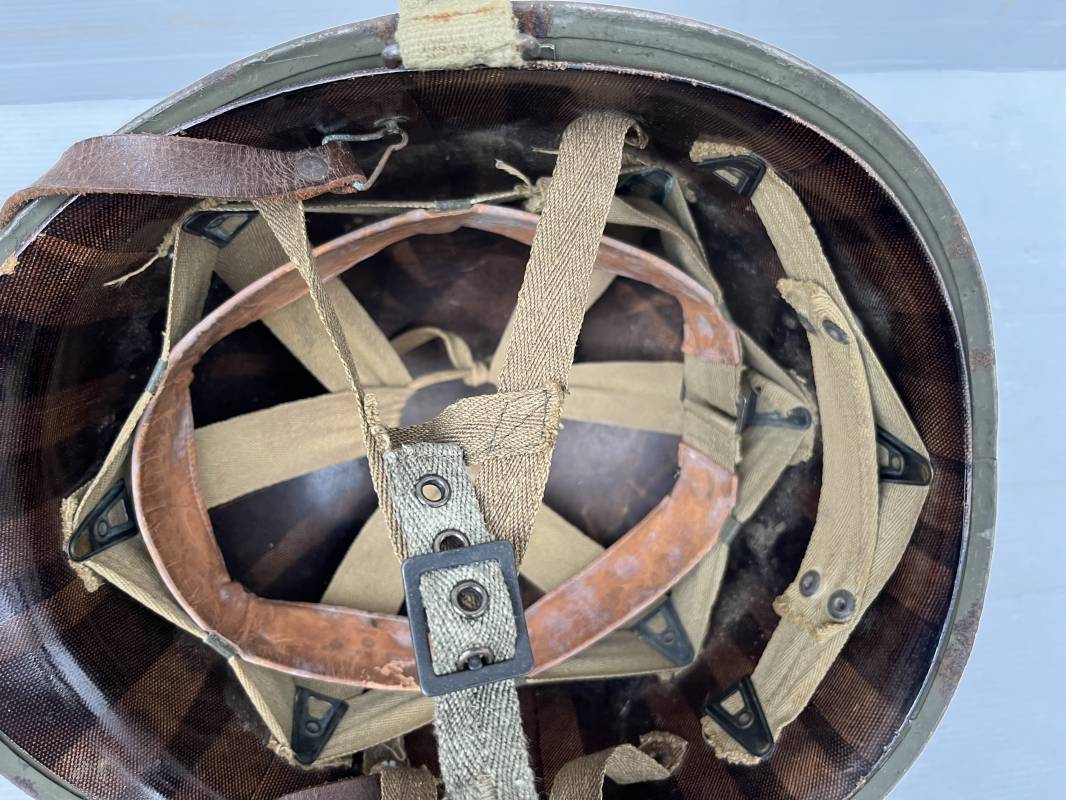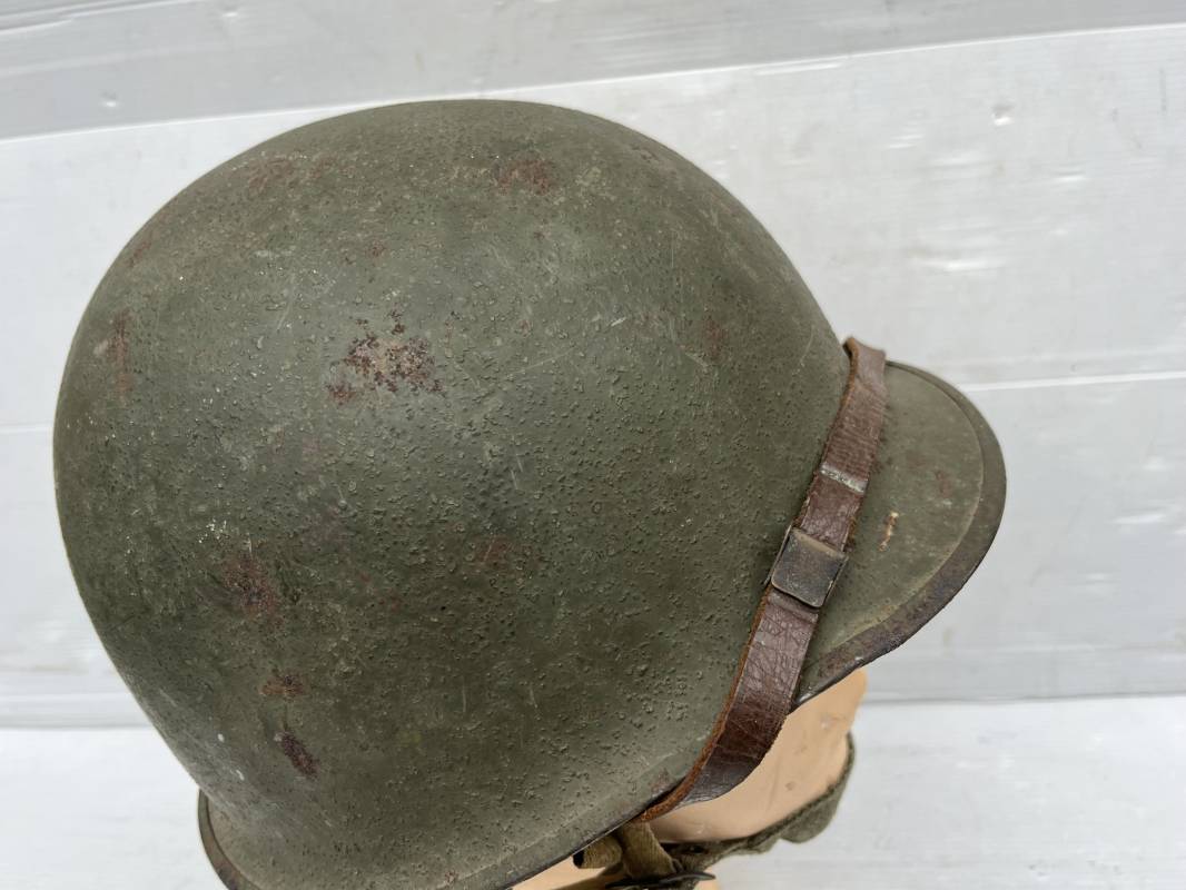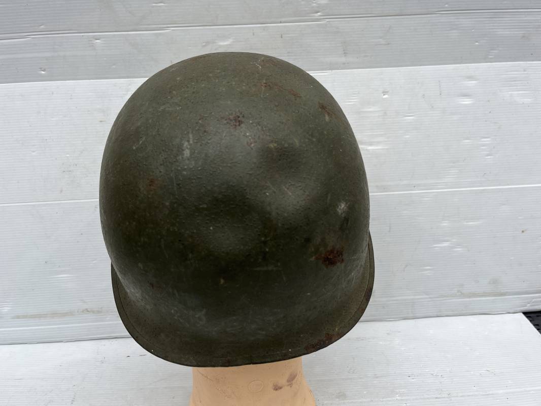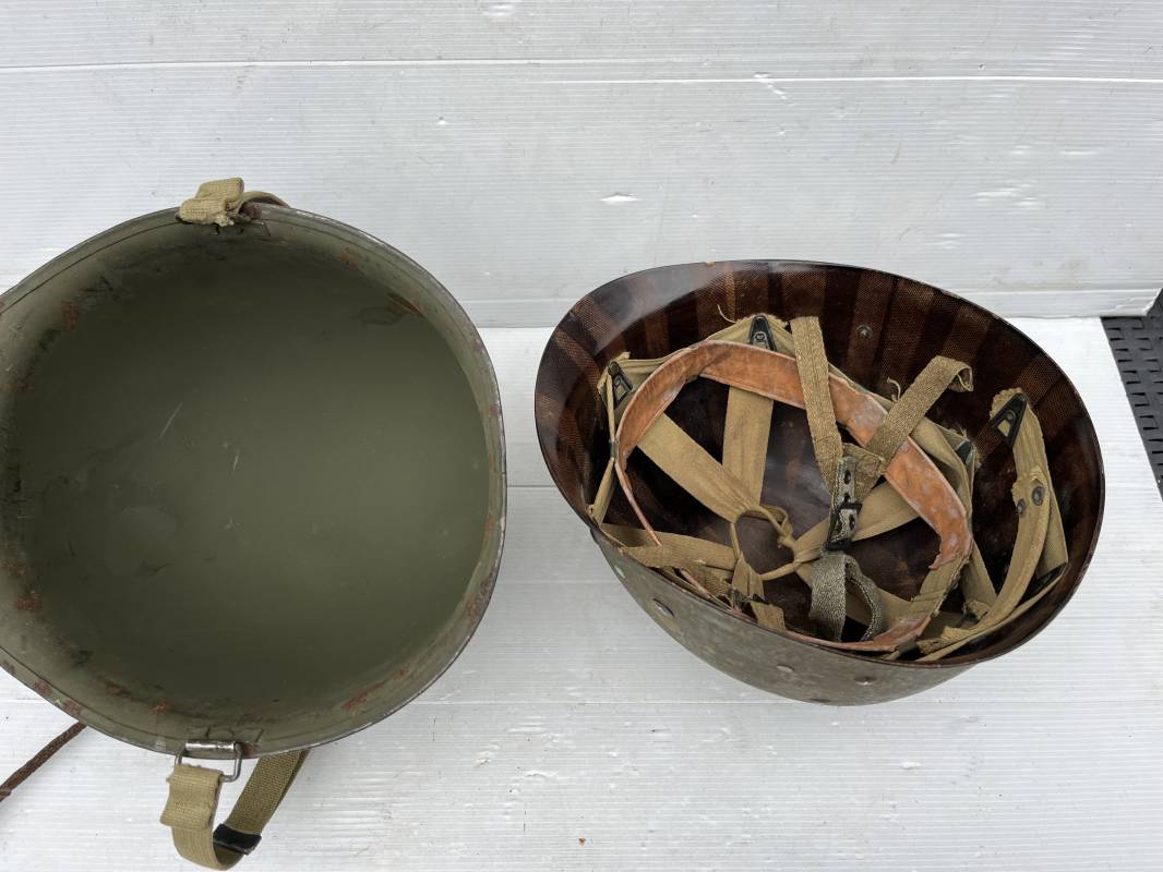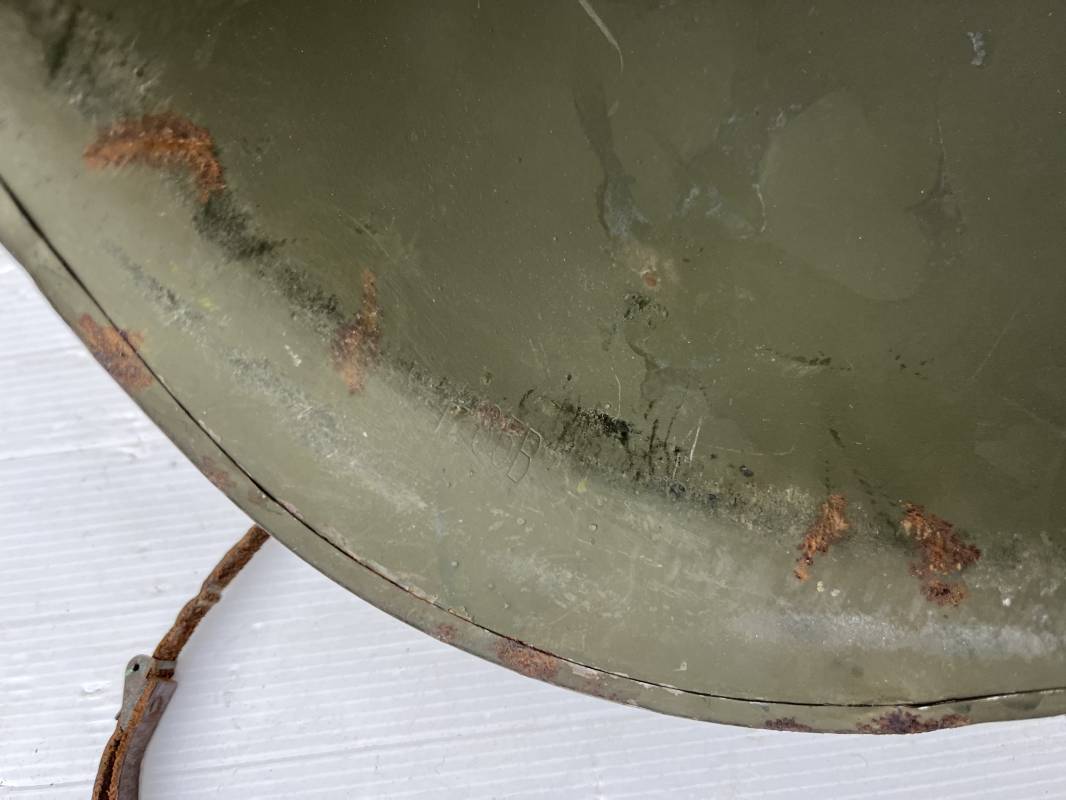Rare casque US modifié 1951 Armée Francaise pour unitée Aéroportée . Ce casque a ete trouvé en succession familiale a Amiens ( 80) et n a jamais été en collection . Casque US Leger ( liner) , maquage fabricant Fireston en fond de bombe . Intérieur avec bandeau cuir , lacet coton , nuquière . Modification armee francaise par l ajout de jugulaire en V du modéle 1951 . Jugulaire rivetée sur liner . Boucle métallique a un ardillon . Mentonnière en toile type 1951 . Jugulaire du liner en cuir marron avec clapet a boucle plate .Peinture extérieur du liner camouflée marron et vert . Insigne général du modele pour Parachutiste peint blanc sur le devant du casque . Casque lourd US du modéle general a jugulaire mobile . Jonc arrière marquage a l interieur avant de la bombe '1285B' Fabricant Mc Cord . Belle peinture d usinage OD Peinture extérieure semi granuleuse . Bon casque porté en trés bel état . 1950/55 Peu courant Ref 21207