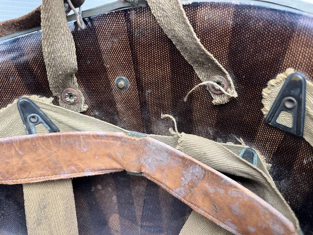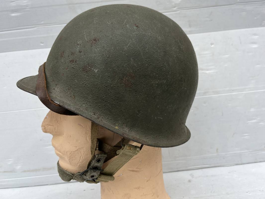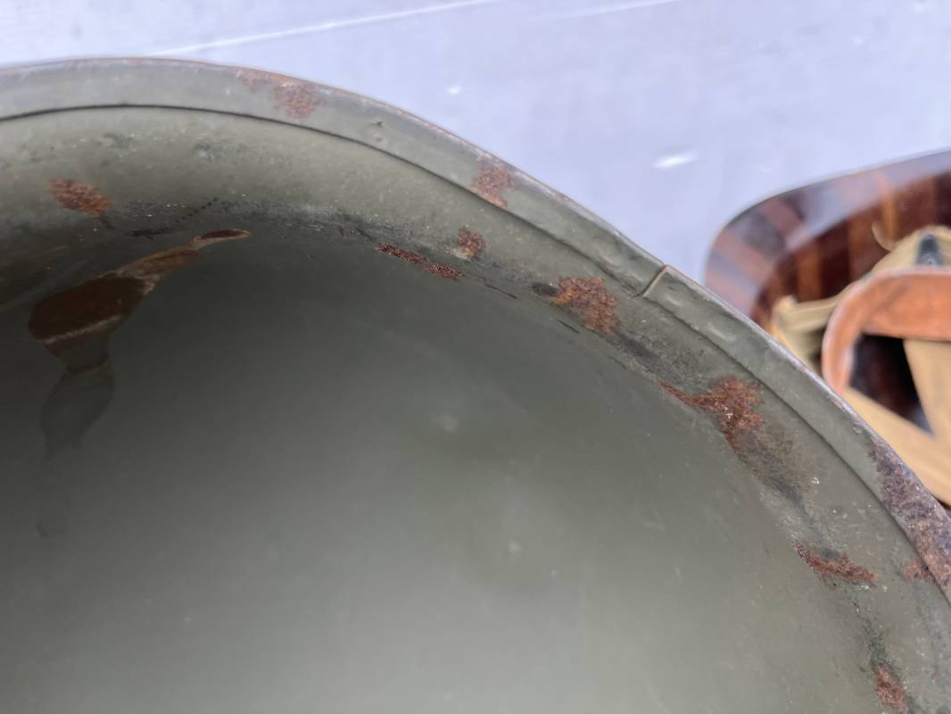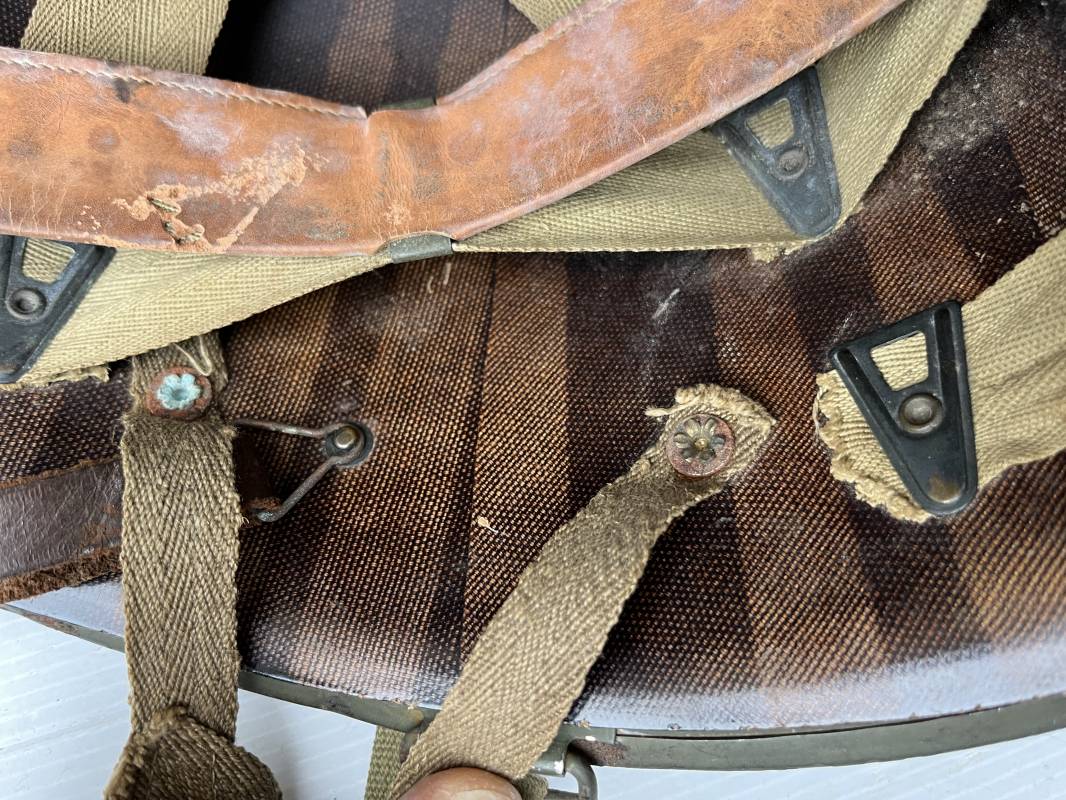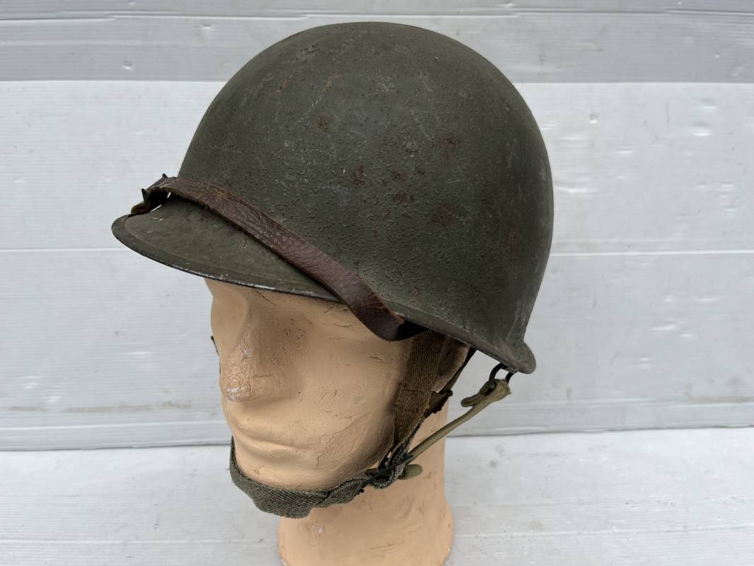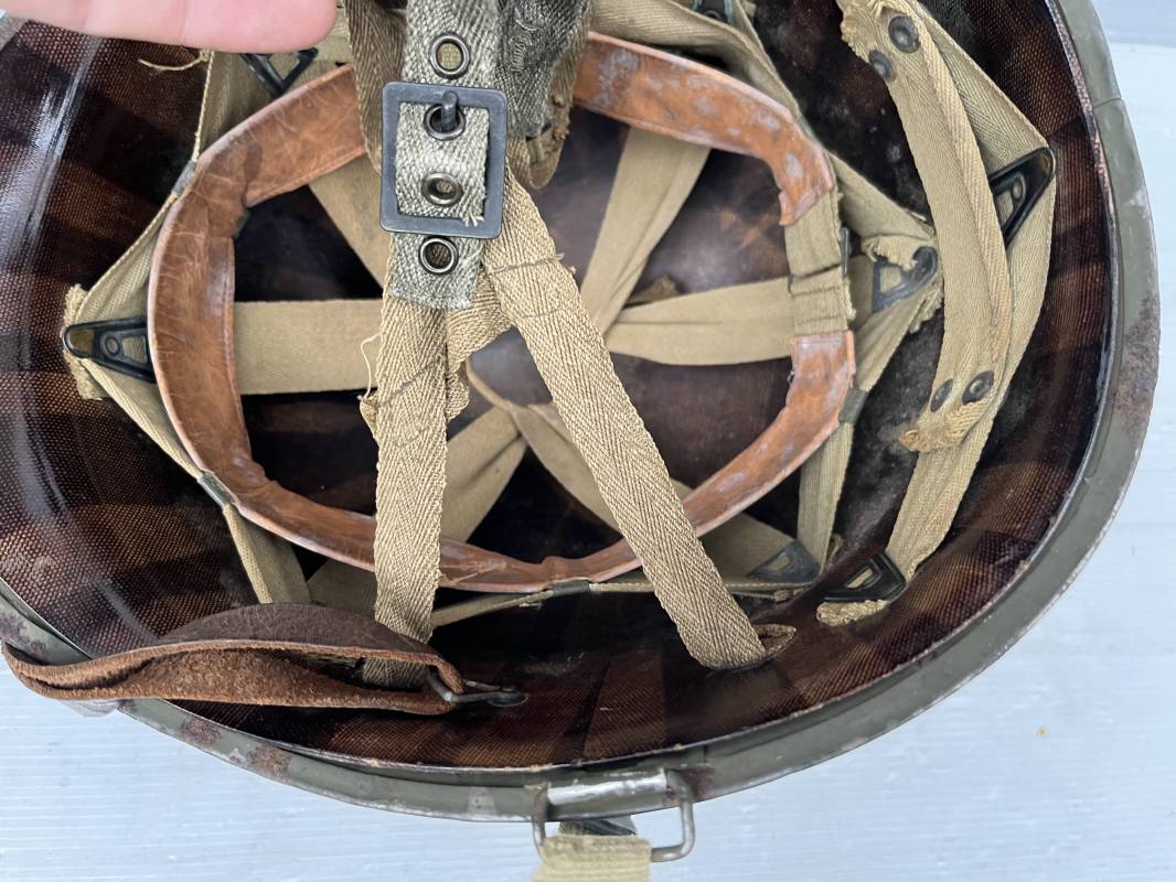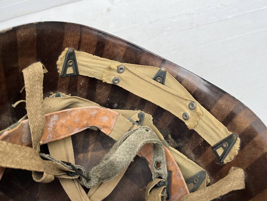 Rare casque US modifié 1951 Armée Francaise pour unitée Aéroportée . Ce casque a ete trouvé en succession familiale a Amiens ( 80) et n a jamais été en collection . Casque US Leger ( liner) , maquage fabricant Fireston en fond de bombe . Intérieur avec bandeau cuir , lacet coton , nuquière . Modification armee francaise par l ajout de jugulaire en V du modéle 1951 . Jugulaire rivetée sur liner . Boucle métallique a un ardillon . Mentonnière en toile type 1951 . Jugulaire du liner en cuir marron avec clapet a boucle plate .Peinture extérieur du liner camouflée marron et vert . Insigne général du modele pour Parachutiste peint blanc sur le devant du casque . Casque lourd US du modéle general a jugulaire mobile . Jonc arrière marquage a l interieur avant de la bombe '1285B' Fabricant Mc Cord . Belle peinture d usinage OD Peinture extérieure semi granuleuse . Bon casque porté en trés bel état . 1950/55 Peu courant Ref 21207