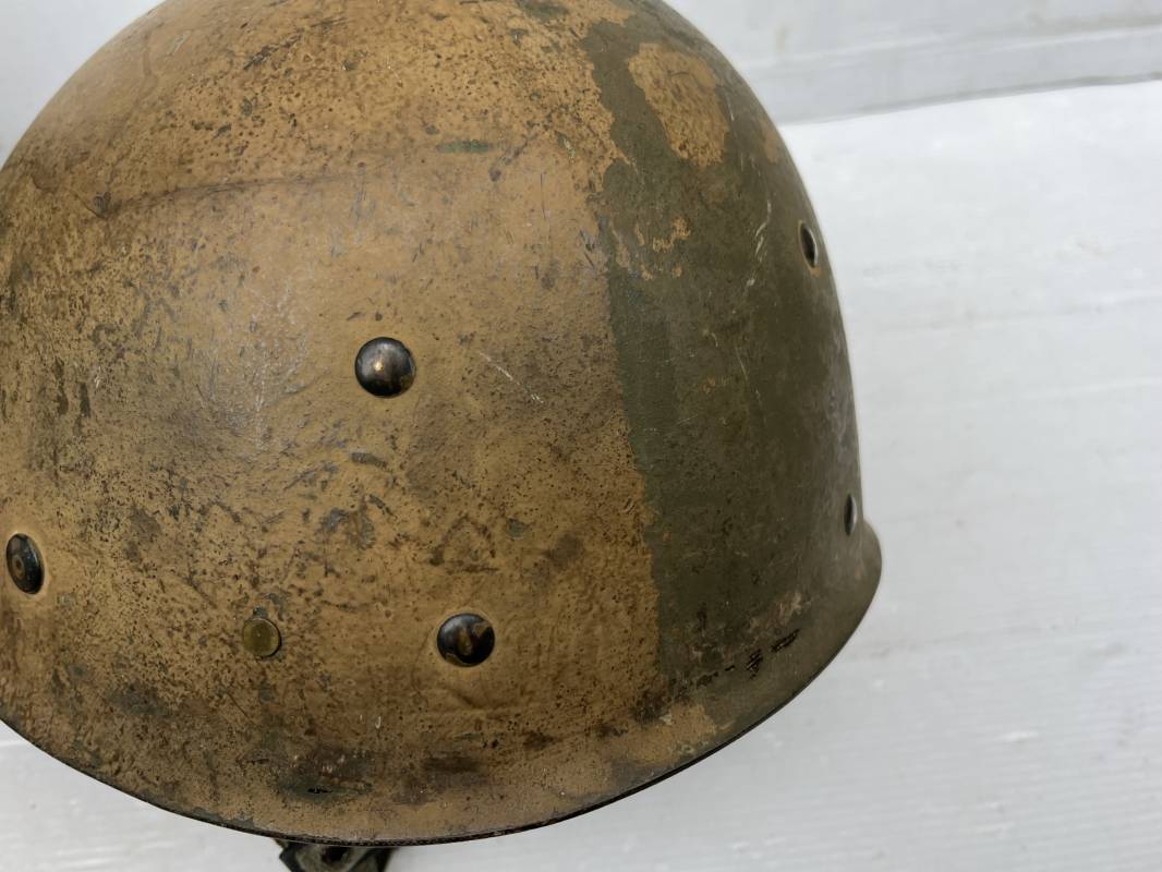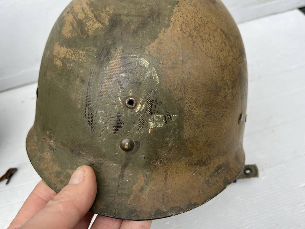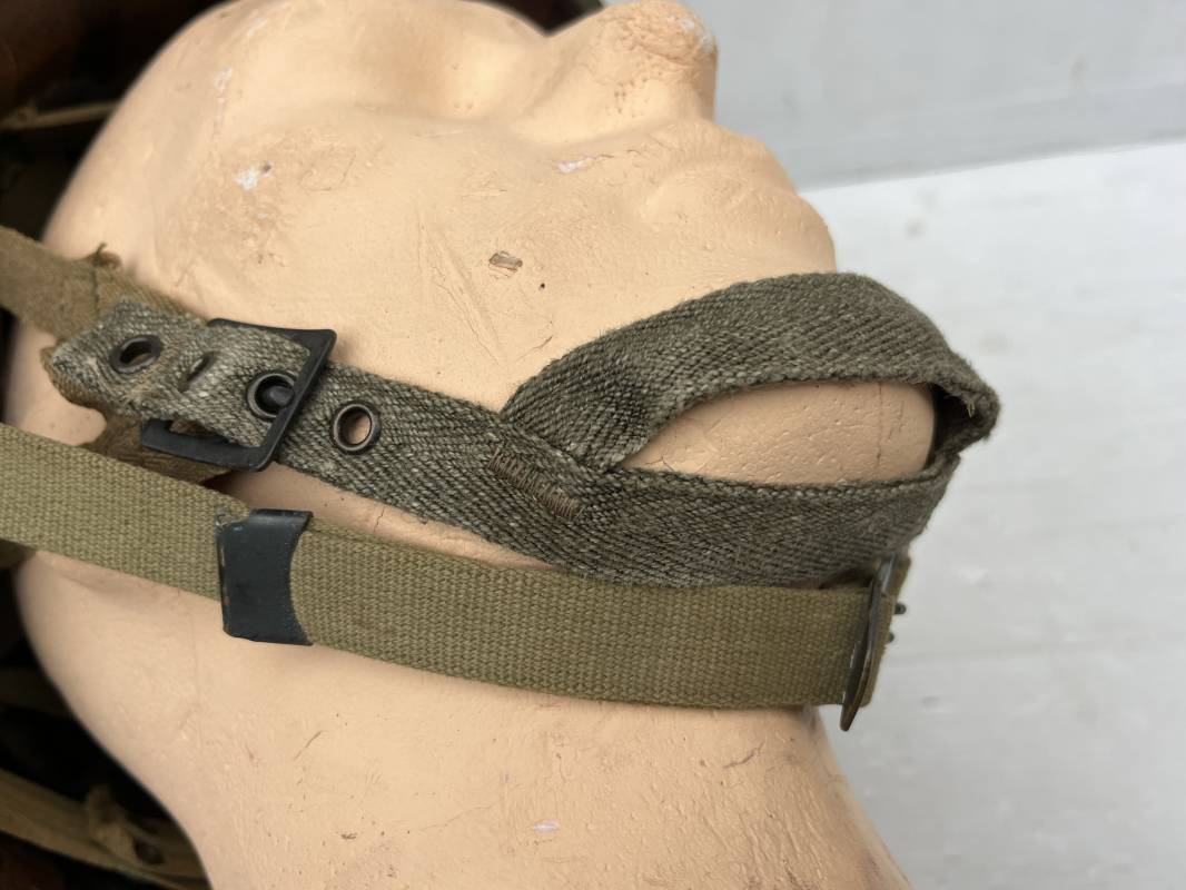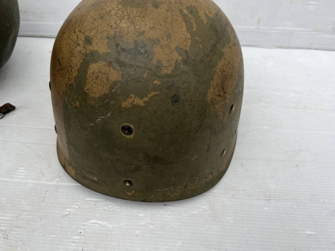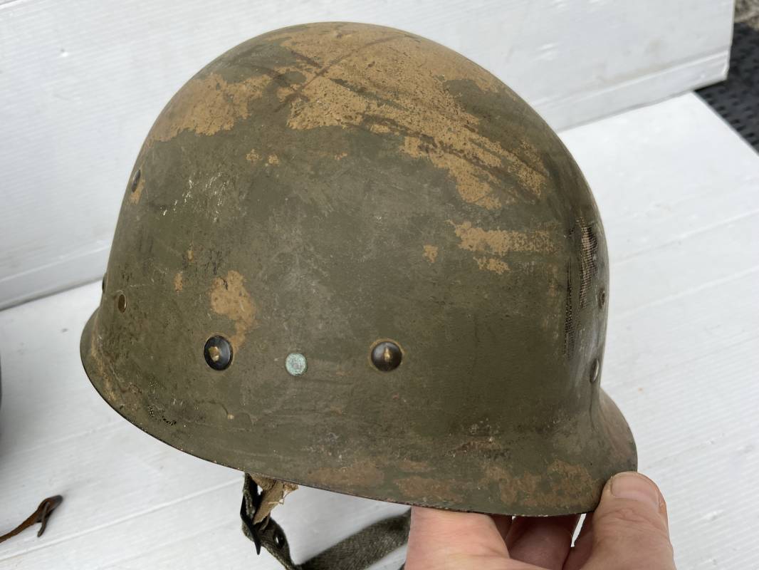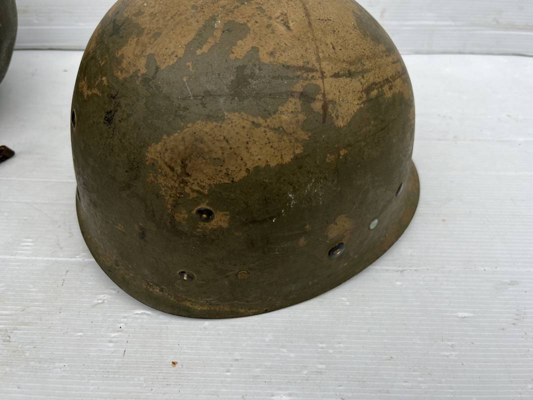 Rare casque US modifié 1951 Armée Francaise pour unitée Aéroportée . Ce casque a ete trouvé en succession familiale a Amiens ( 80) et n a jamais été en collection . Casque US Leger ( liner) , maquage fabricant Fireston en fond de bombe . Intérieur avec bandeau cuir , lacet coton , nuquière . Modification armee francaise par l ajout de jugulaire en V du modéle 1951 . Jugulaire rivetée sur liner . Boucle métallique a un ardillon . Mentonnière en toile type 1951 . Jugulaire du liner en cuir marron avec clapet a boucle plate .Peinture extérieur du liner camouflée marron et vert . Insigne général du modele pour Parachutiste peint blanc sur le devant du casque . Casque lourd US du modéle general a jugulaire mobile . Jonc arrière marquage a l interieur avant de la bombe '1285B' Fabricant Mc Cord . Belle peinture d usinage OD Peinture extérieure semi granuleuse . Bon casque porté en trés bel état . 1950/55 Peu courant Ref 21207