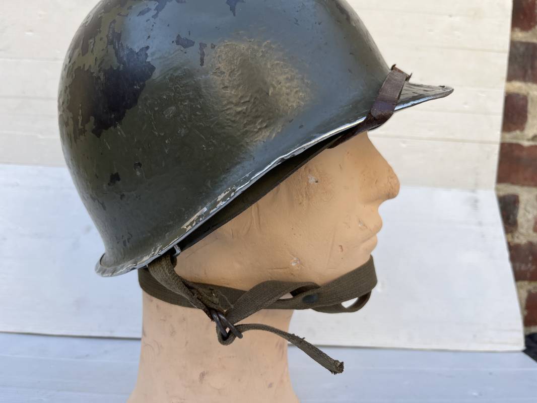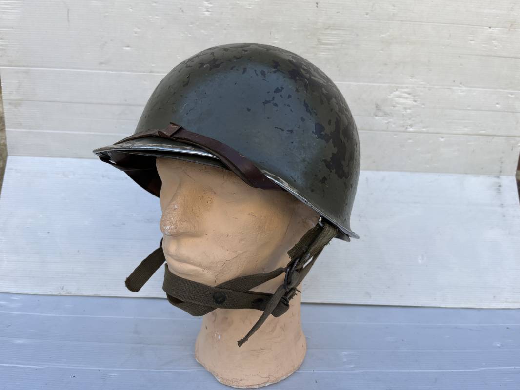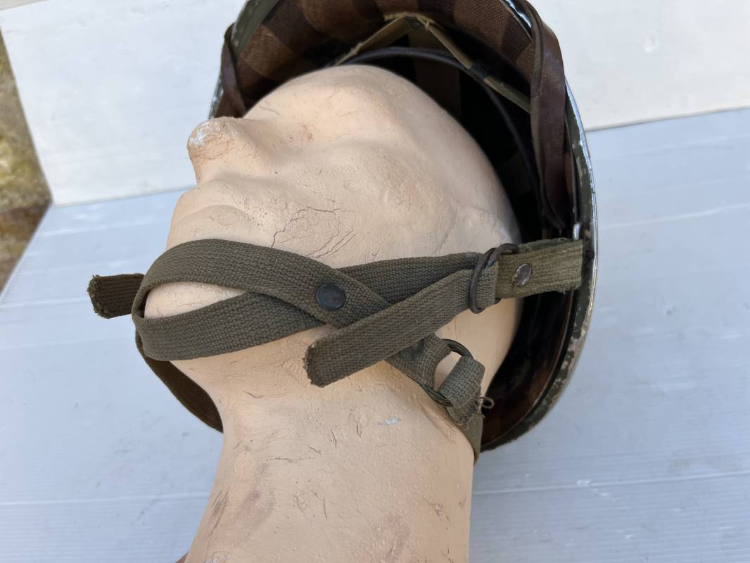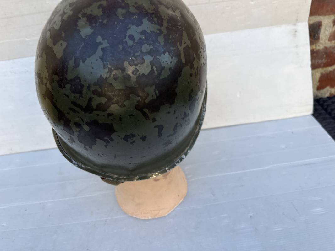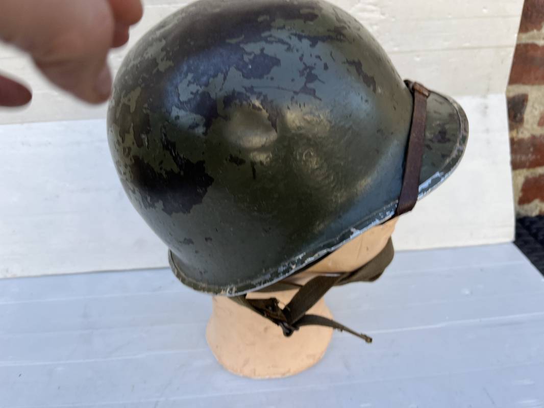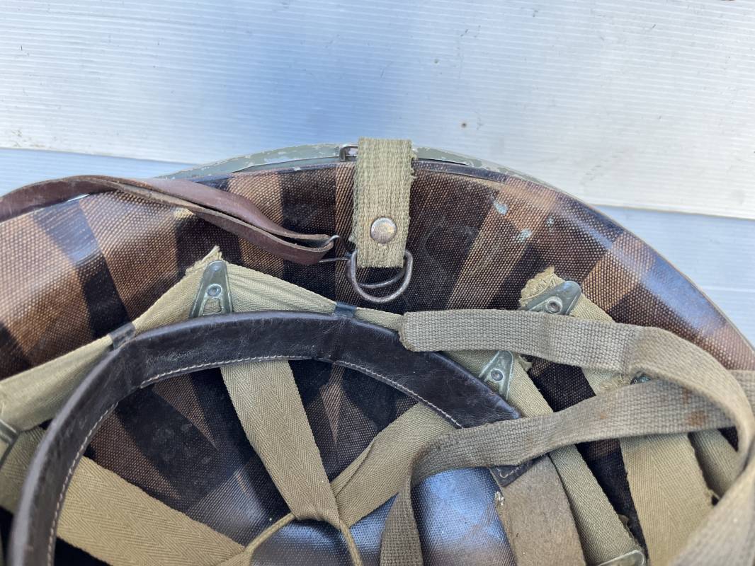 Rare casque US 'modifié Métrople ' par l Armée Francaise pour Parachutiste . Casque US Léger ( liner) , marquage fabricant Westinghouse en fond de bombe . Intérieur avec bandeau cuir , lacet coton , nuquière . Jugulaire du liner en cuir marron avec clapet a boucle plate .Peinture extérieure d usinage de couleur OD . Casque lourd a pontets fixes . Jonc avant Fabricant Mc Cord .Casque lourd modifié 'metro ' par le remplacement de la jugulaire initiale par un système de jugulaire / mentonnière se fixant en trois points sur les pontets d origine de cotés et sur un pontet rajouté a l arrière du casque . Jugulaire croisée en toile kaki et trois paires d anneaux demi ronds metalliques . Peinture verte type 'Armée francaise' sur le casque lourd . . Bon casque porté en trés bel état .100 % dans son jus et intouché . 1950/55 Peu courant Ref 21307