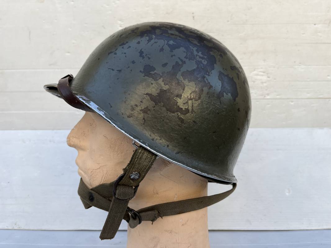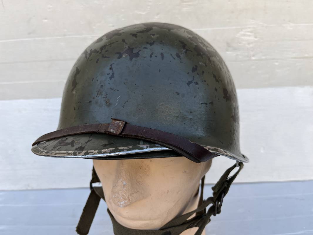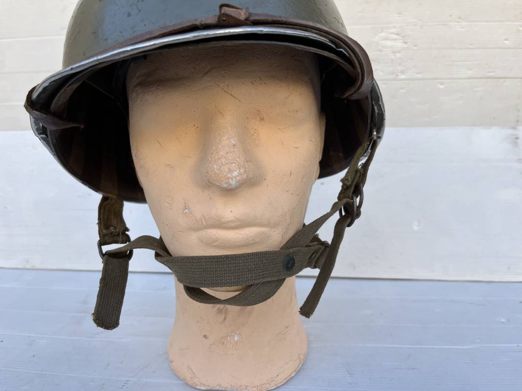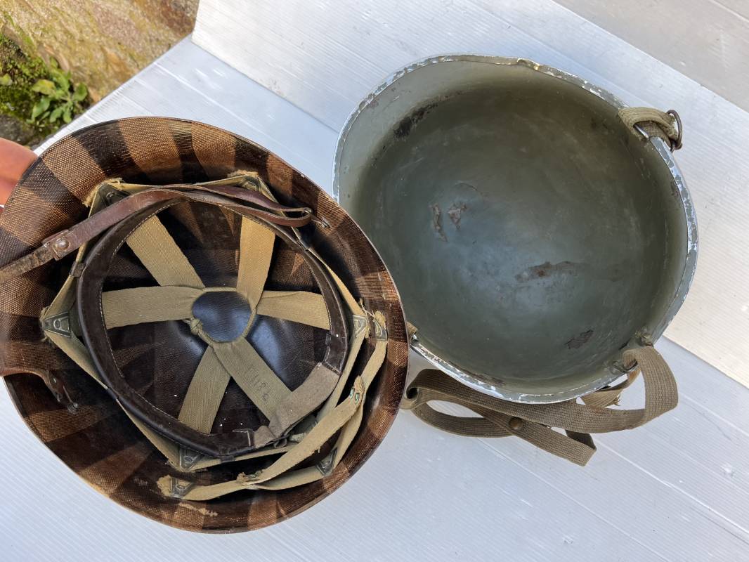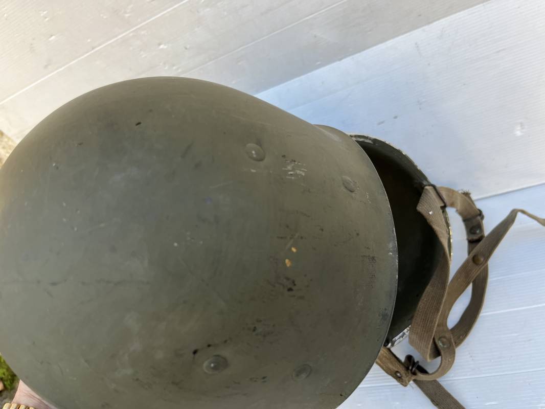 Rare casque US 'modifié Métrople ' par l Armée Francaise pour Parachutiste . Casque US Léger ( liner) , marquage fabricant Westinghouse en fond de bombe . Intérieur avec bandeau cuir , lacet coton , nuquière . Jugulaire du liner en cuir marron avec clapet a boucle plate .Peinture extérieure d usinage de couleur OD . Casque lourd a pontets fixes . Jonc avant Fabricant Mc Cord .Casque lourd modifié 'metro ' par le remplacement de la jugulaire initiale par un système de jugulaire / mentonnière se fixant en trois points sur les pontets d origine de cotés et sur un pontet rajouté a l arrière du casque . Jugulaire croisée en toile kaki et trois paires d anneaux demi ronds metalliques . Peinture verte type 'Armée francaise' sur le casque lourd . . Bon casque porté en trés bel état .100 % dans son jus et intouché . 1950/55 Peu courant Ref 21307