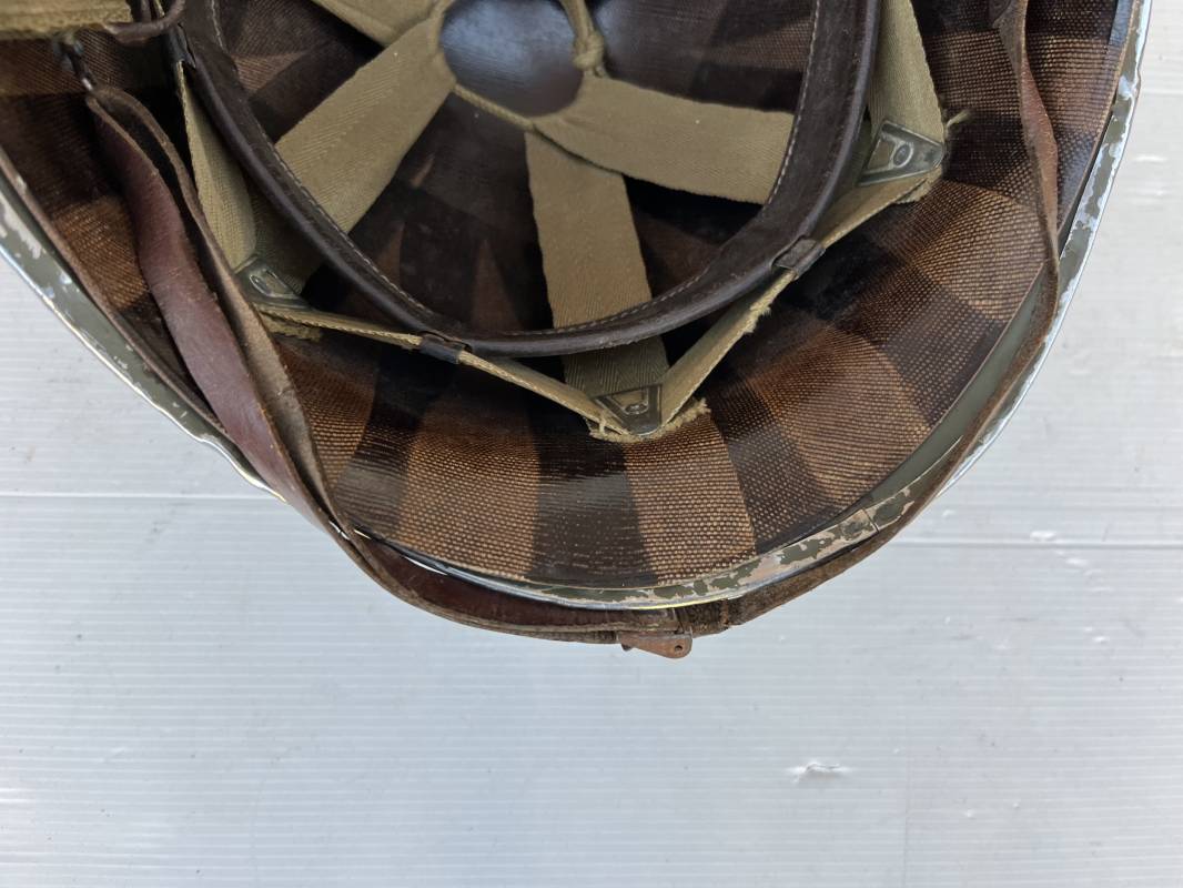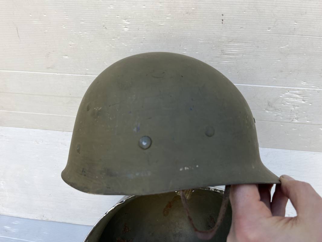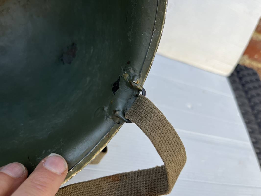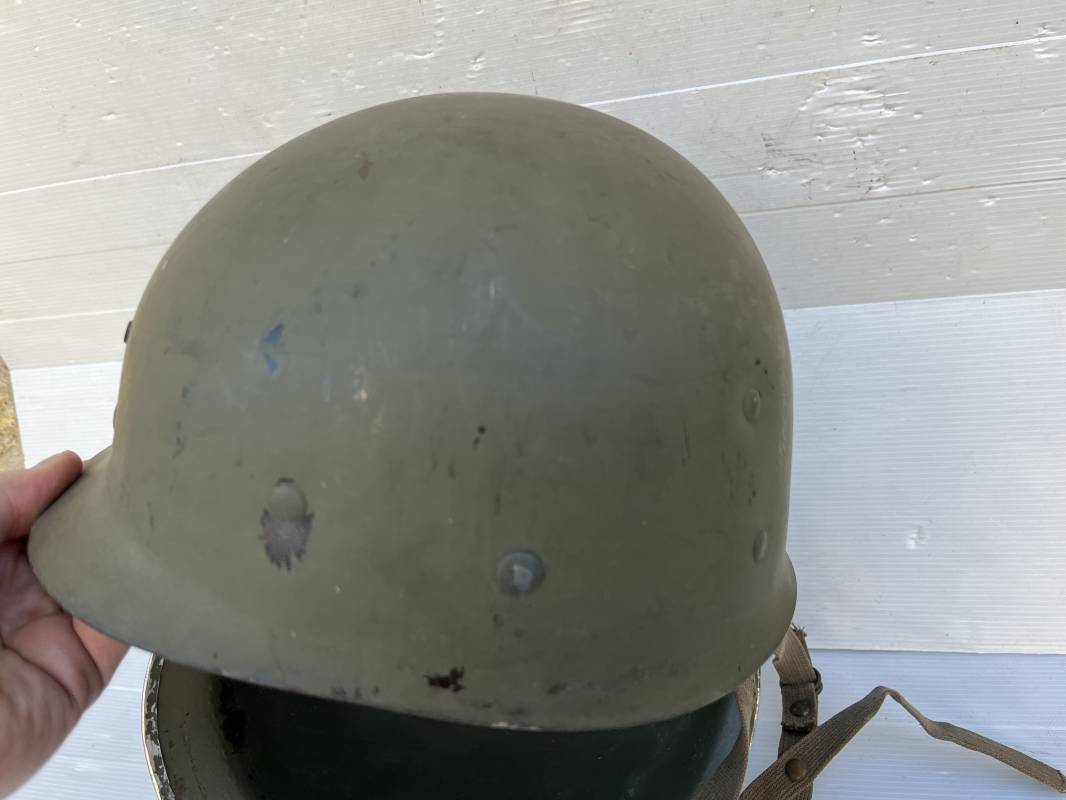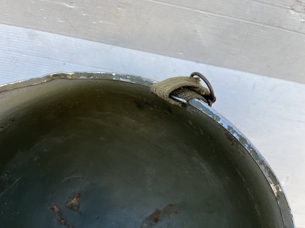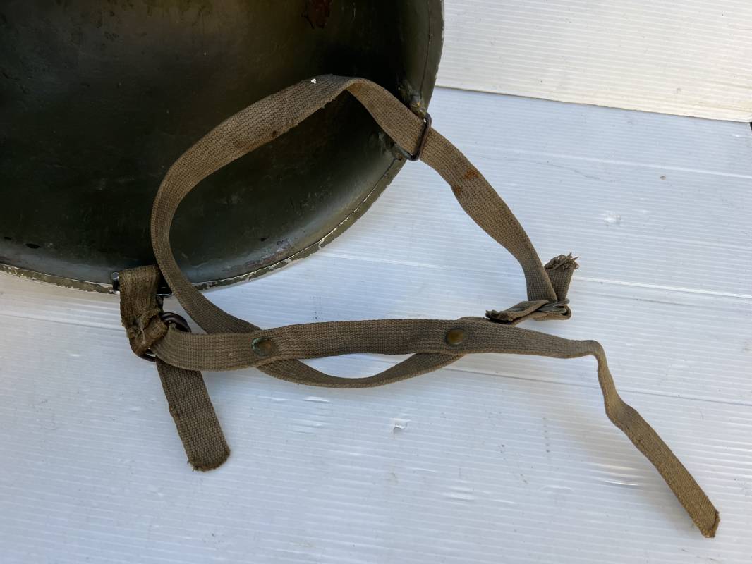 Rare casque US 'modifié Métrople ' par l Armée Francaise pour Parachutiste . Casque US Léger ( liner) , marquage fabricant Westinghouse en fond de bombe . Intérieur avec bandeau cuir , lacet coton , nuquière . Jugulaire du liner en cuir marron avec clapet a boucle plate .Peinture extérieure d usinage de couleur OD . Casque lourd a pontets fixes . Jonc avant Fabricant Mc Cord .Casque lourd modifié 'metro ' par le remplacement de la jugulaire initiale par un système de jugulaire / mentonnière se fixant en trois points sur les pontets d origine de cotés et sur un pontet rajouté a l arrière du casque . Jugulaire croisée en toile kaki et trois paires d anneaux demi ronds metalliques . Peinture verte type 'Armée francaise' sur le casque lourd . . Bon casque porté en trés bel état .100 % dans son jus et intouché . 1950/55 Peu courant Ref 21307