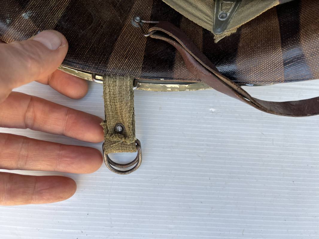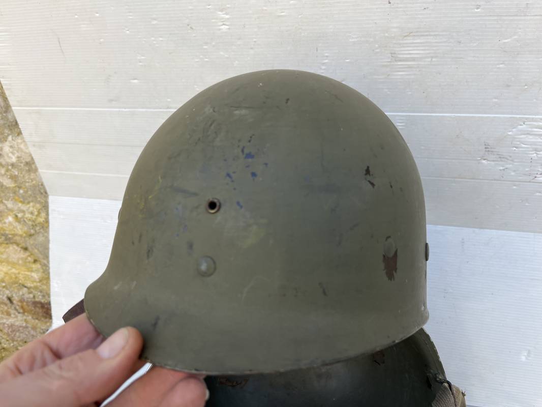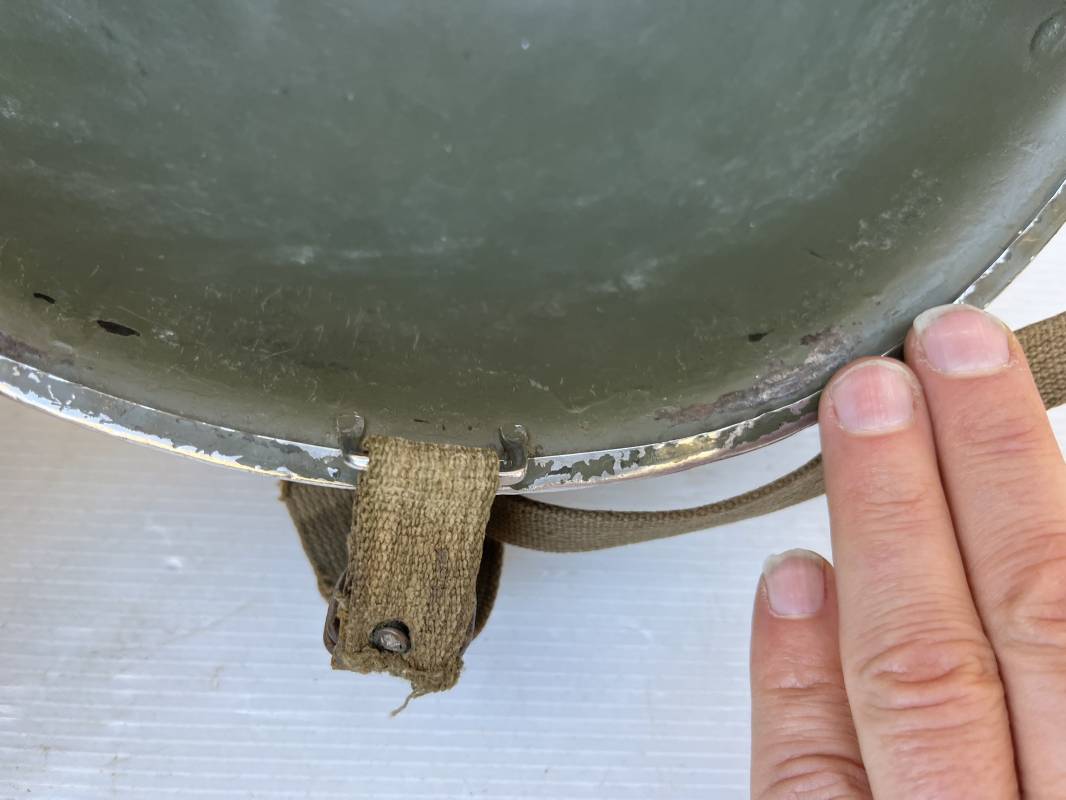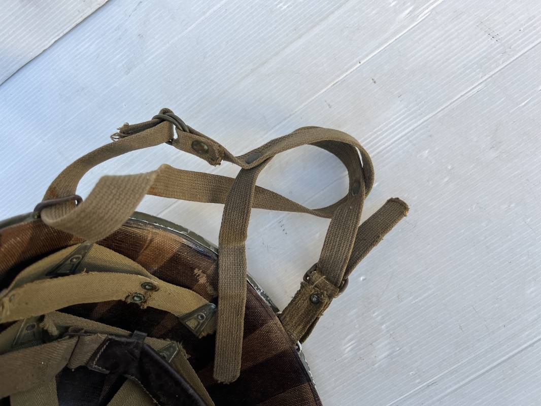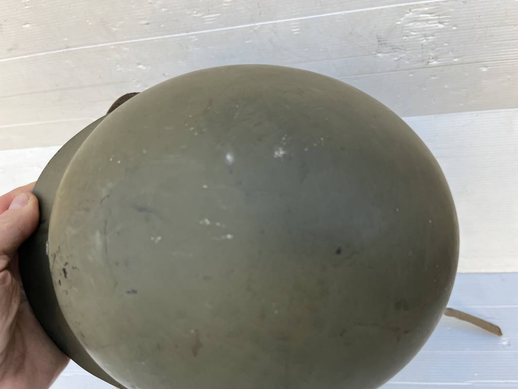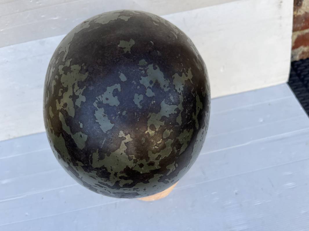 Rare casque US 'modifié Métrople ' par l Armée Francaise pour Parachutiste . Casque US Léger ( liner) , marquage fabricant Westinghouse en fond de bombe . Intérieur avec bandeau cuir , lacet coton , nuquière . Jugulaire du liner en cuir marron avec clapet a boucle plate .Peinture extérieure d usinage de couleur OD . Casque lourd a pontets fixes . Jonc avant Fabricant Mc Cord .Casque lourd modifié 'metro ' par le remplacement de la jugulaire initiale par un système de jugulaire / mentonnière se fixant en trois points sur les pontets d origine de cotés et sur un pontet rajouté a l arrière du casque . Jugulaire croisée en toile kaki et trois paires d anneaux demi ronds metalliques . Peinture verte type 'Armée francaise' sur le casque lourd . . Bon casque porté en trés bel état .100 % dans son jus et intouché . 1950/55 Peu courant Ref 21307