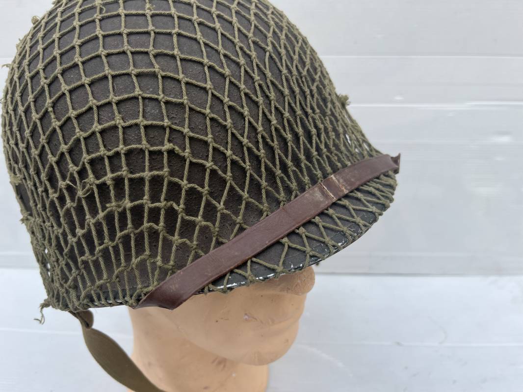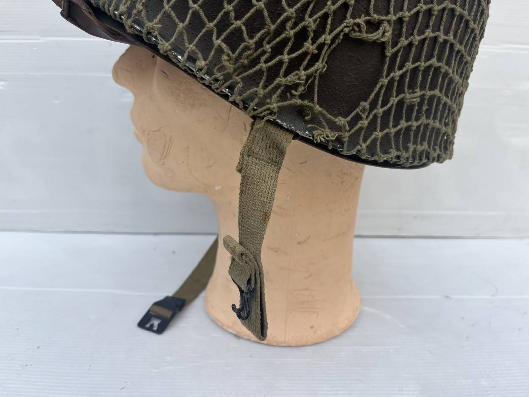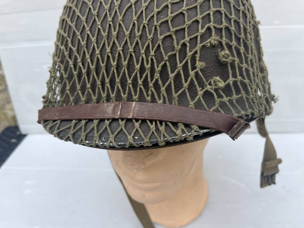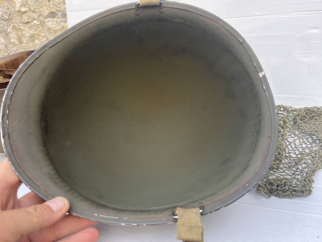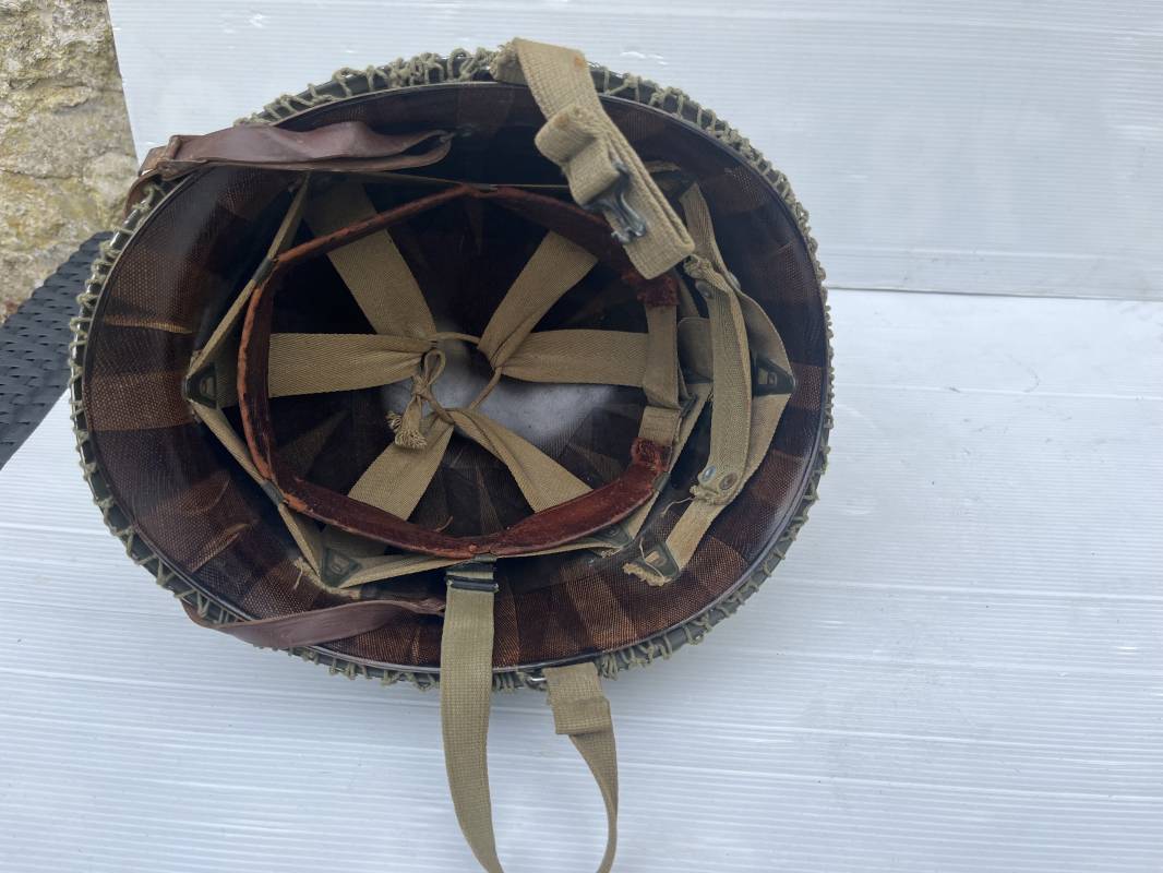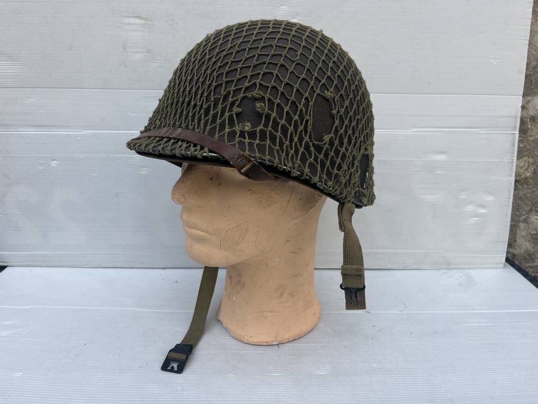 Très beau casque Américain USM1 avec son filet trouvé en Normandie à Cherbourg (50) il y a 40 ans. 100 % nature et totalement intouché . . Casque léger (Liner) en fibre compressée. Peinture OD d'usinage. Marquage fabricant en fond de bombe Westinghouse . Intèrieur en toile OD, lacet en coton, nuquière. Bandeau de coiffe en cuir marron . Jugulaire d'origine en cuir marron foncé. Boucle plate en fer Rivets en fer , cuir souple. Casque lourd avec jonc avant fabricant Mc Cord. Chiffres sur le devant intèrieur illisibles. Peinture semi granuleuse OD d'usinage. Pontets fixes "Fix Bale". Jugulaire en toile OD cousues d'origines. Boucle et crochet en métal noirci. Filet americain en coton vert avec cordon de serrage . Ce filet a été trouvé avec ce casque , la peinture exterieur du casque porte les traces du port de ce filet laissant apparaitre les traces des mailles . ( voir photos ) . Bon casque légèrement porté en parfait état. Bon casque de la Bataille de Normandie 1942/44.Coiffure définitive en collection Ref 21509