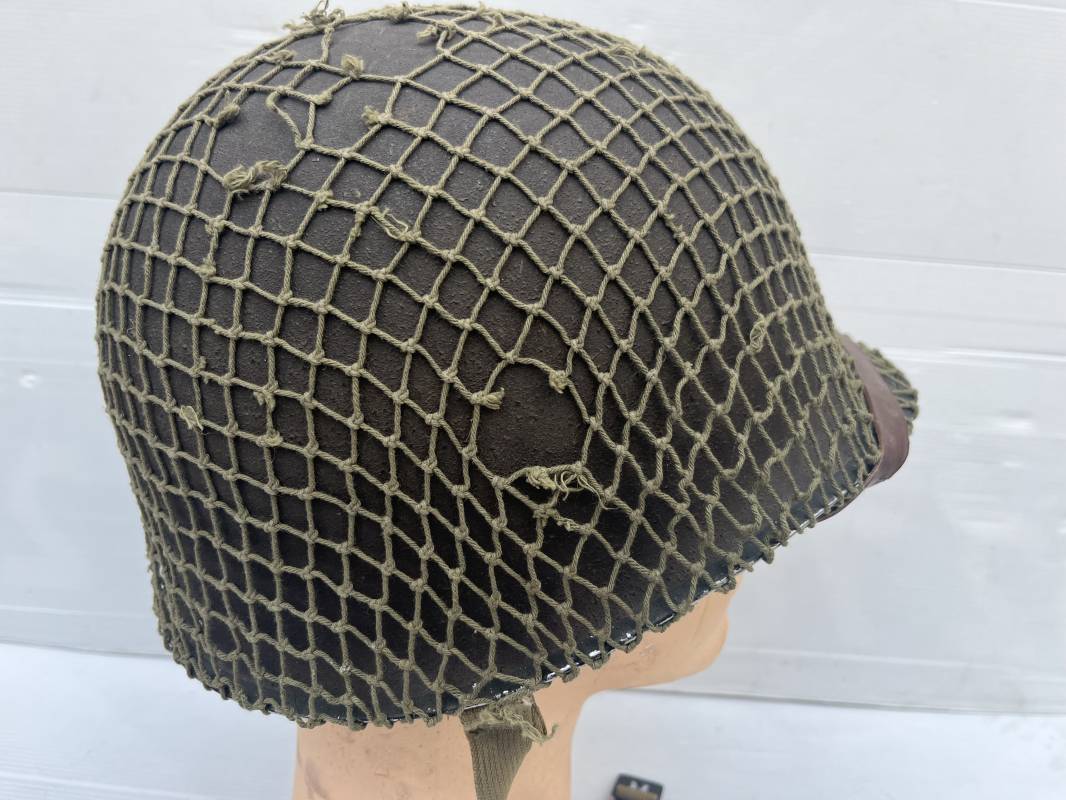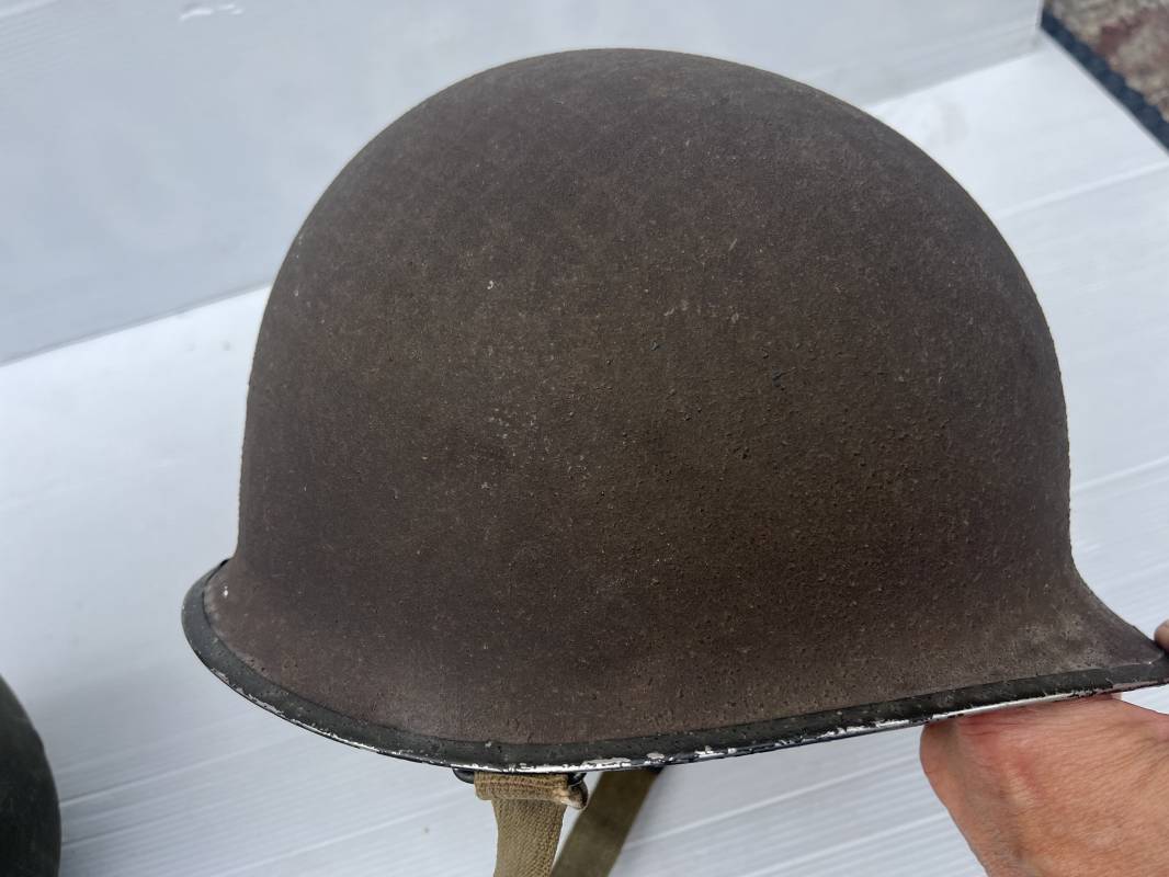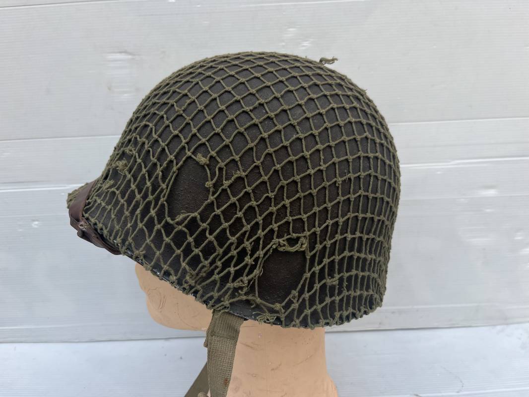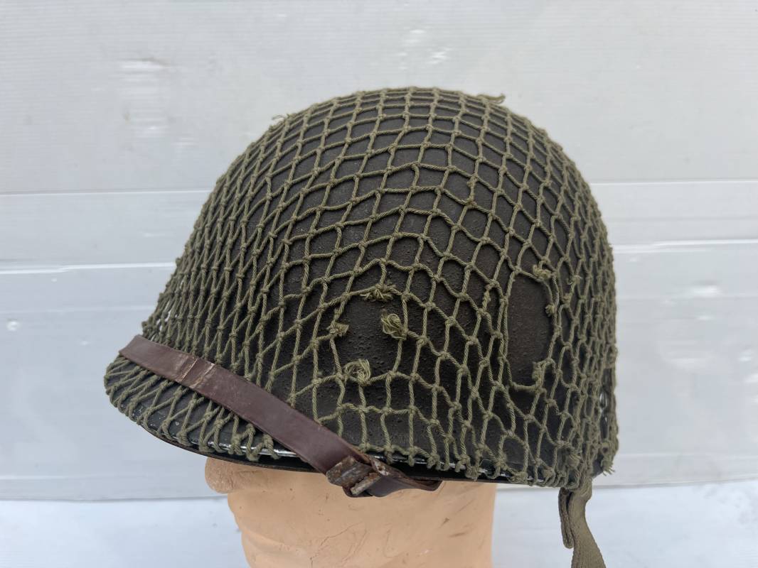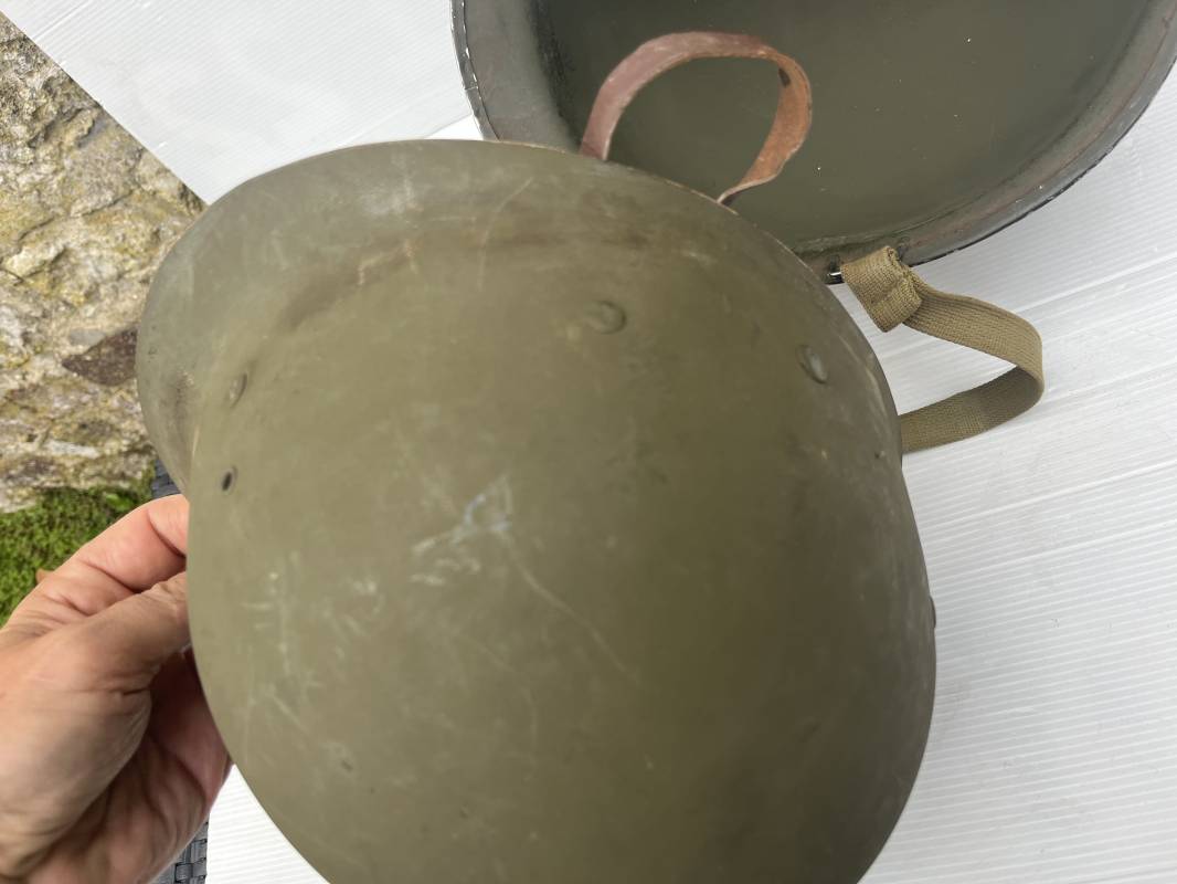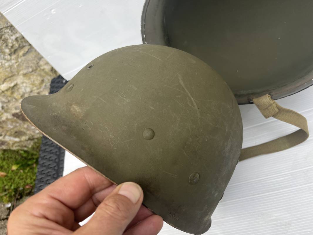 Très beau casque Américain USM1 avec son filet trouvé en Normandie à Cherbourg (50) il y a 40 ans. 100 % nature et totalement intouché . . Casque léger (Liner) en fibre compressée. Peinture OD d'usinage. Marquage fabricant en fond de bombe Westinghouse . Intèrieur en toile OD, lacet en coton, nuquière. Bandeau de coiffe en cuir marron . Jugulaire d'origine en cuir marron foncé. Boucle plate en fer Rivets en fer , cuir souple. Casque lourd avec jonc avant fabricant Mc Cord. Chiffres sur le devant intèrieur illisibles. Peinture semi granuleuse OD d'usinage. Pontets fixes "Fix Bale". Jugulaire en toile OD cousues d'origines. Boucle et crochet en métal noirci. Filet americain en coton vert avec cordon de serrage . Ce filet a été trouvé avec ce casque , la peinture exterieur du casque porte les traces du port de ce filet laissant apparaitre les traces des mailles . ( voir photos ) . Bon casque légèrement porté en parfait état. Bon casque de la Bataille de Normandie 1942/44.Coiffure définitive en collection Ref 21509