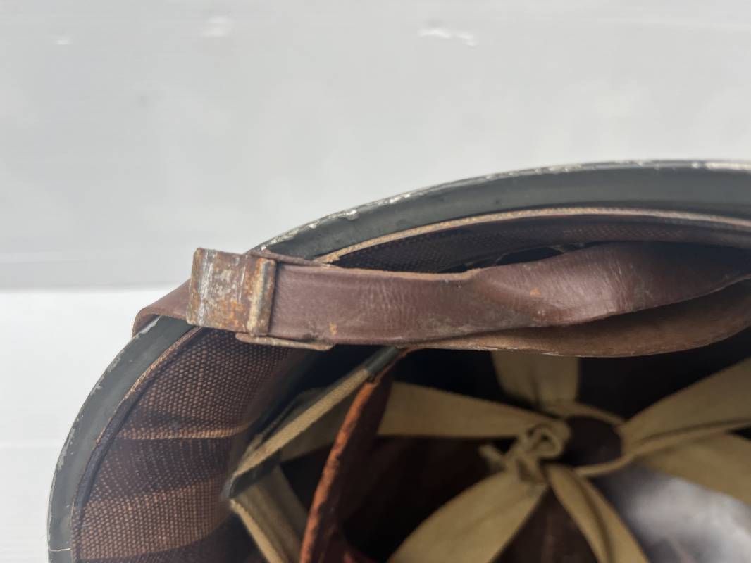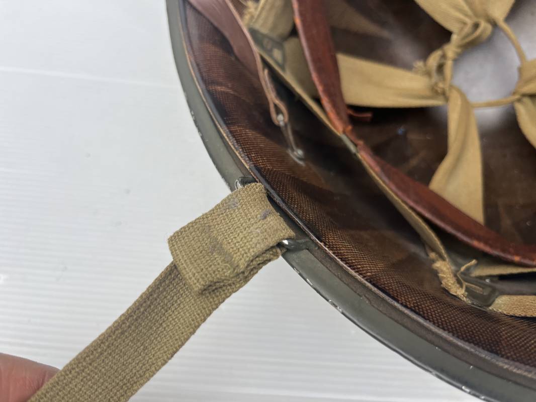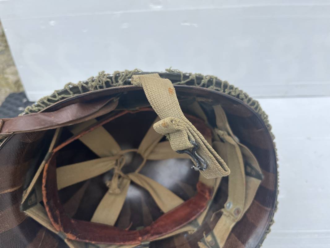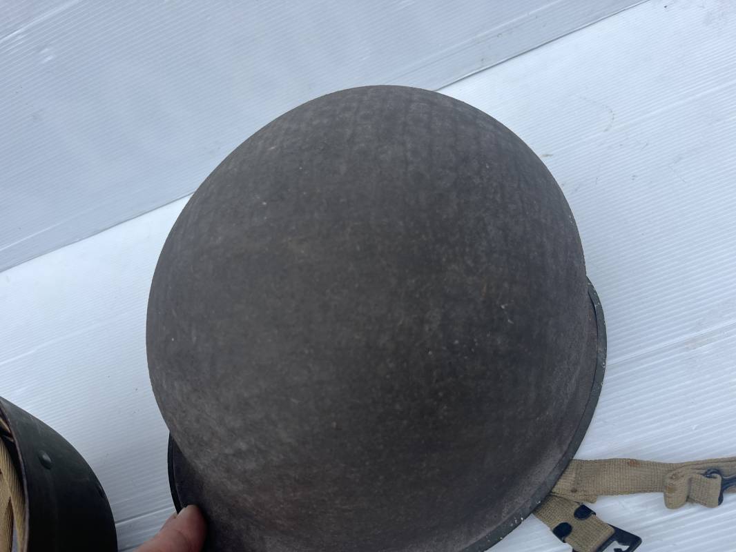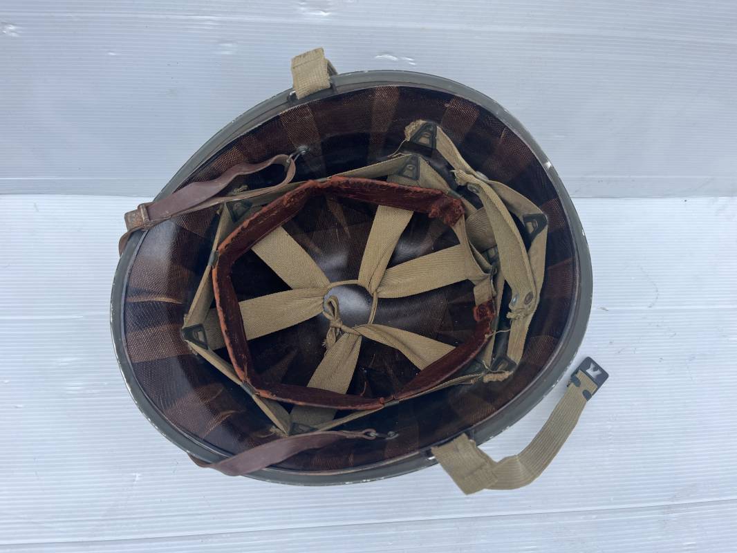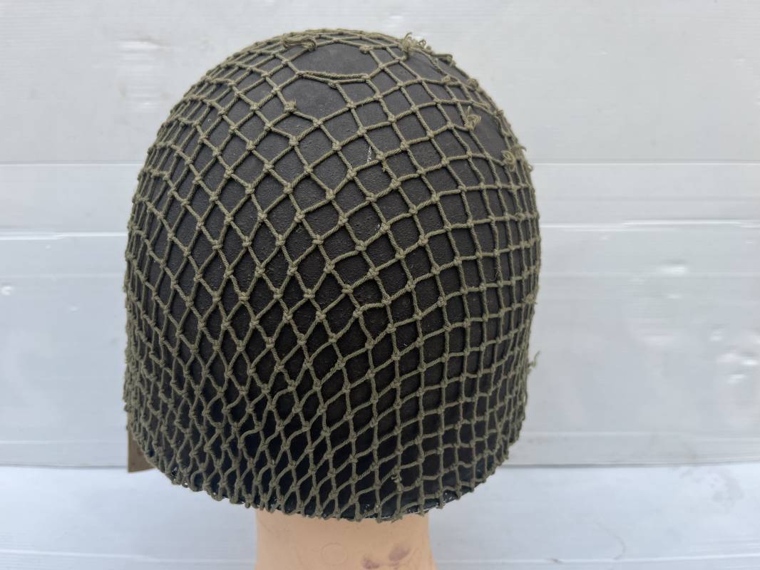 Très beau casque Américain USM1 avec son filet trouvé en Normandie à Cherbourg (50) il y a 40 ans. 100 % nature et totalement intouché . . Casque léger (Liner) en fibre compressée. Peinture OD d'usinage. Marquage fabricant en fond de bombe Westinghouse . Intèrieur en toile OD, lacet en coton, nuquière. Bandeau de coiffe en cuir marron . Jugulaire d'origine en cuir marron foncé. Boucle plate en fer Rivets en fer , cuir souple. Casque lourd avec jonc avant fabricant Mc Cord. Chiffres sur le devant intèrieur illisibles. Peinture semi granuleuse OD d'usinage. Pontets fixes "Fix Bale". Jugulaire en toile OD cousues d'origines. Boucle et crochet en métal noirci. Filet americain en coton vert avec cordon de serrage . Ce filet a été trouvé avec ce casque , la peinture exterieur du casque porte les traces du port de ce filet laissant apparaitre les traces des mailles . ( voir photos ) . Bon casque légèrement porté en parfait état. Bon casque de la Bataille de Normandie 1942/44.Coiffure définitive en collection Ref 21509