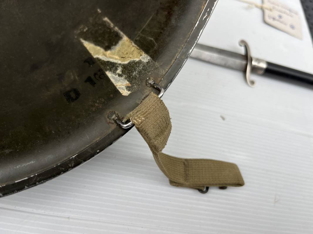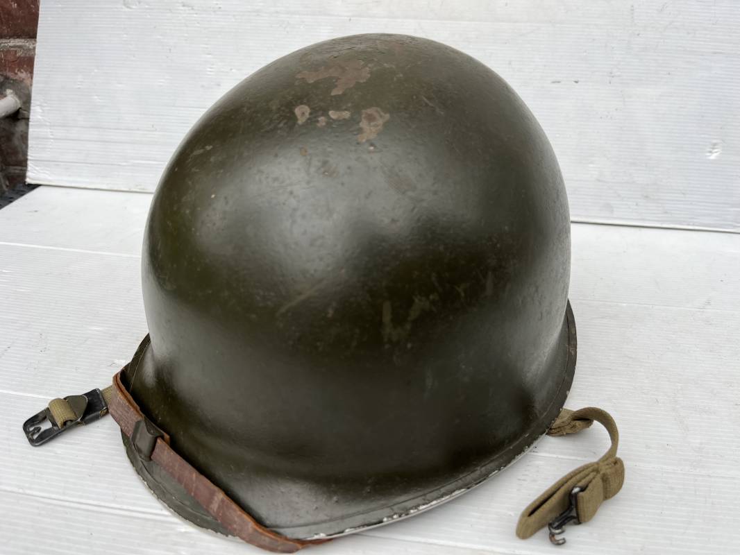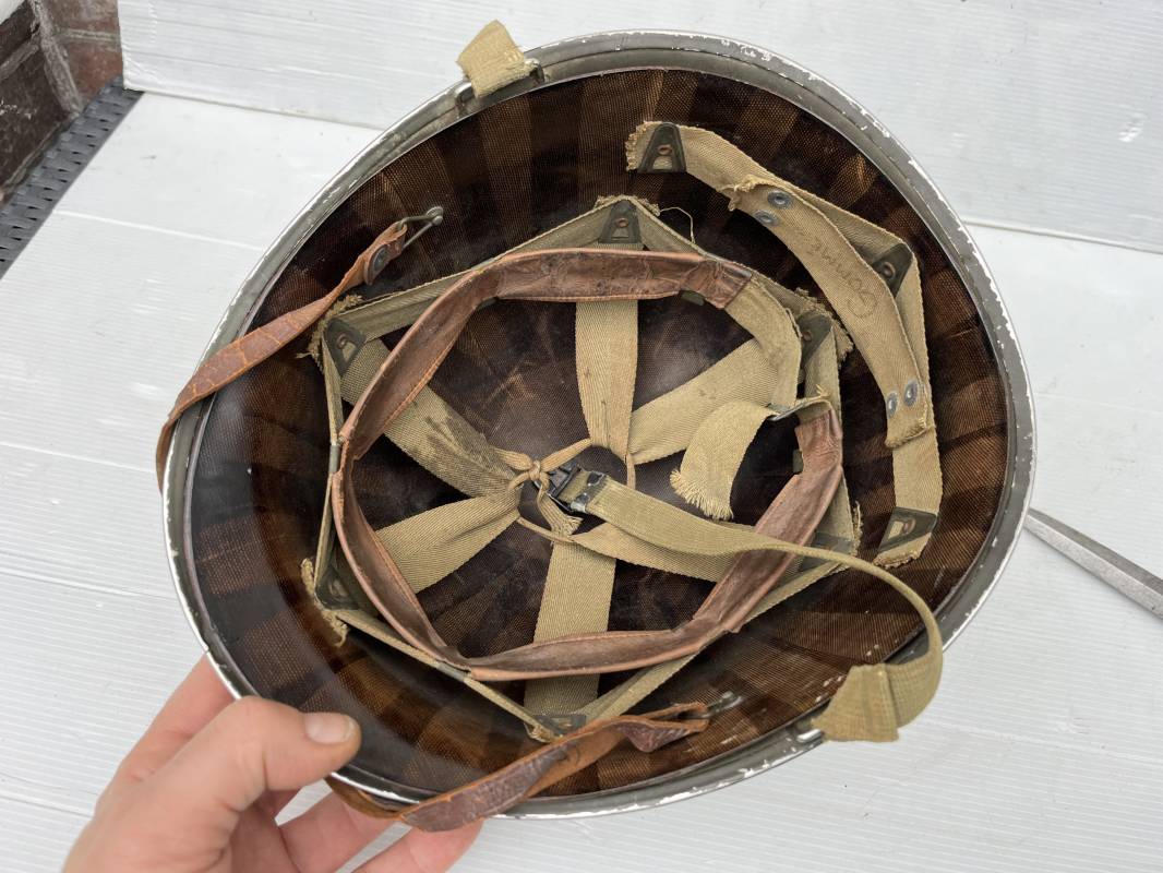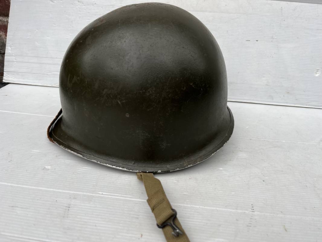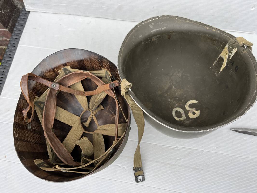 Très beau casque Américain USM1 à pontets de jugulaire fixe ( Fix Bale ) . 100 % nature et totalement intouché . Ce casque a été trouvé a Avranches ( 50 ) dans les années 1985 . Provenance collection normande . . Casque léger (Liner) en fibre compressée. Peinture mate OD d'usinage. Marquage fabricant en fond de bombe Fireston . Intèrieur en toile OD, lacet en coton, nuquière avec nom manucrit GOMME . Bandeau de coiffe en cuir marron . Jugulaire d'origine en cuir marron foncé. Boucle plate en fer Rivets en fer , cuir souple. Casque lourd avec jonc avant fabricant Mc Cord. Chiffres sur le devant intèrieur 781 A . Peinture mate OD d'usinage. Pontets fixes "Fix Bale". Jugulaire en toile OD cousues d'origines. Boucle et crochet en métal noirci.Casque en trés bel état .Trés beau casque trés légèrement porté en parfait état. Bon casque de la Bataille de Normandie 1942/44.Coiffure définitive en collection Ref 19066