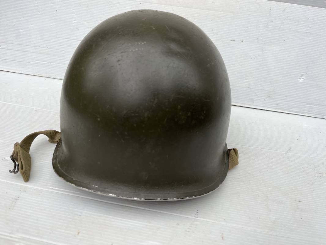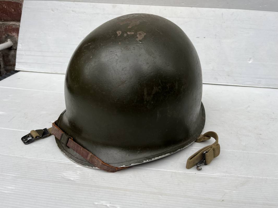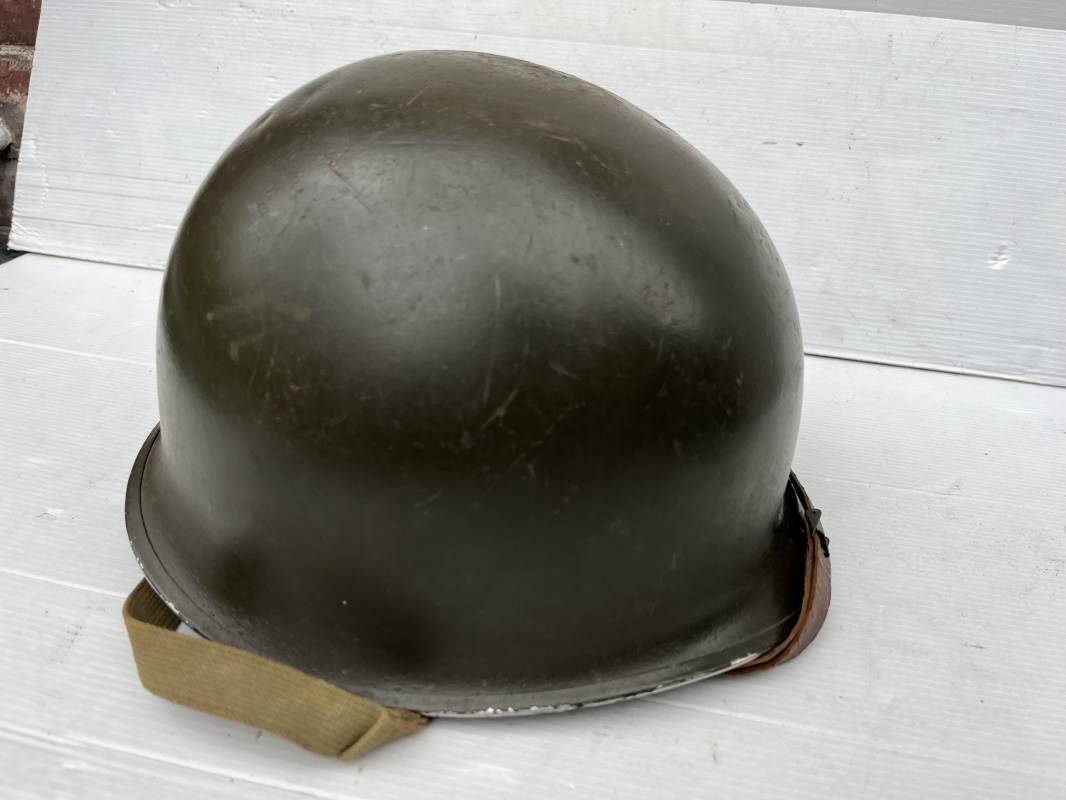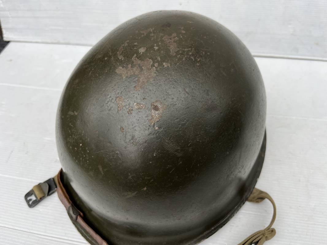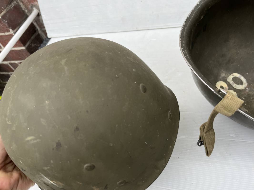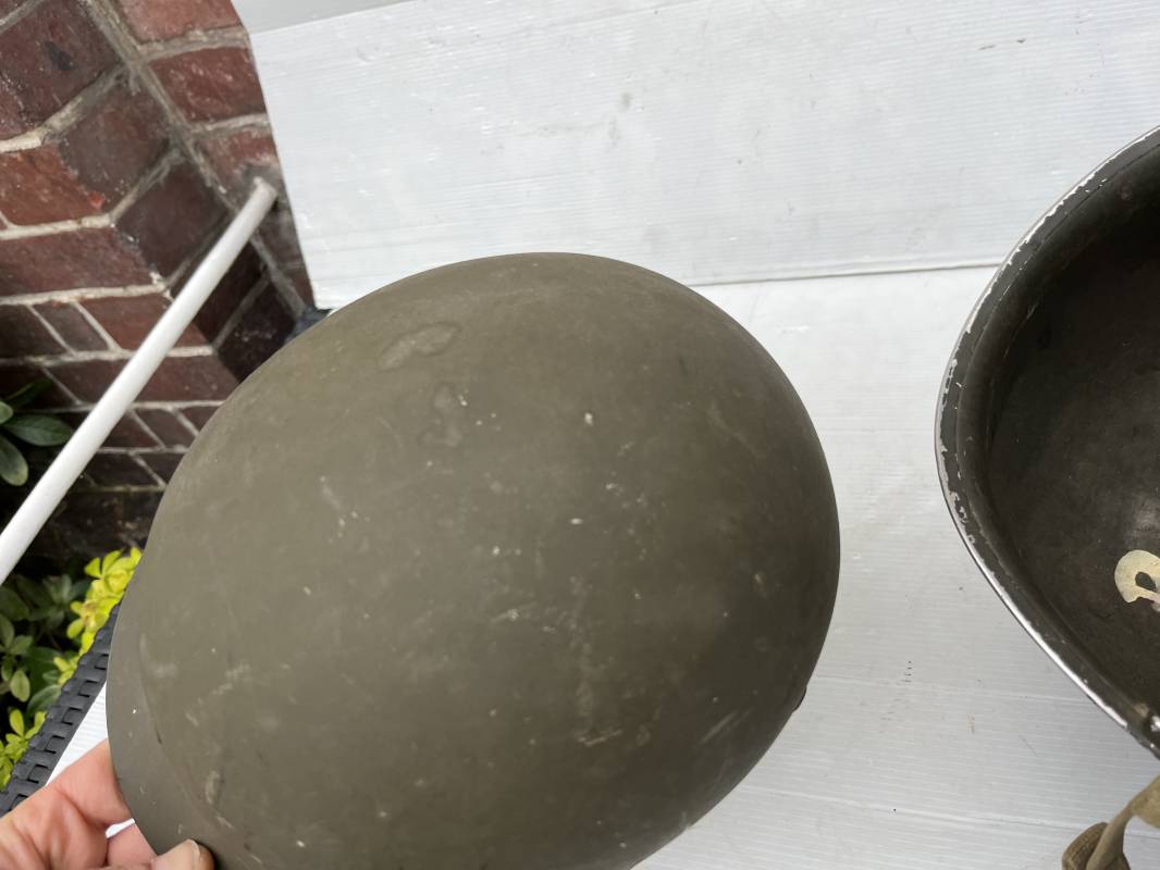 Très beau casque Américain USM1 à pontets de jugulaire fixe ( Fix Bale ) . 100 % nature et totalement intouché . Ce casque a été trouvé a Avranches ( 50 ) dans les années 1985 . Provenance collection normande . . Casque léger (Liner) en fibre compressée. Peinture mate OD d'usinage. Marquage fabricant en fond de bombe Fireston . Intèrieur en toile OD, lacet en coton, nuquière avec nom manucrit GOMME . Bandeau de coiffe en cuir marron . Jugulaire d'origine en cuir marron foncé. Boucle plate en fer Rivets en fer , cuir souple. Casque lourd avec jonc avant fabricant Mc Cord. Chiffres sur le devant intèrieur 781 A . Peinture mate OD d'usinage. Pontets fixes "Fix Bale". Jugulaire en toile OD cousues d'origines. Boucle et crochet en métal noirci.Casque en trés bel état .Trés beau casque trés légèrement porté en parfait état. Bon casque de la Bataille de Normandie 1942/44.Coiffure définitive en collection Ref 19066