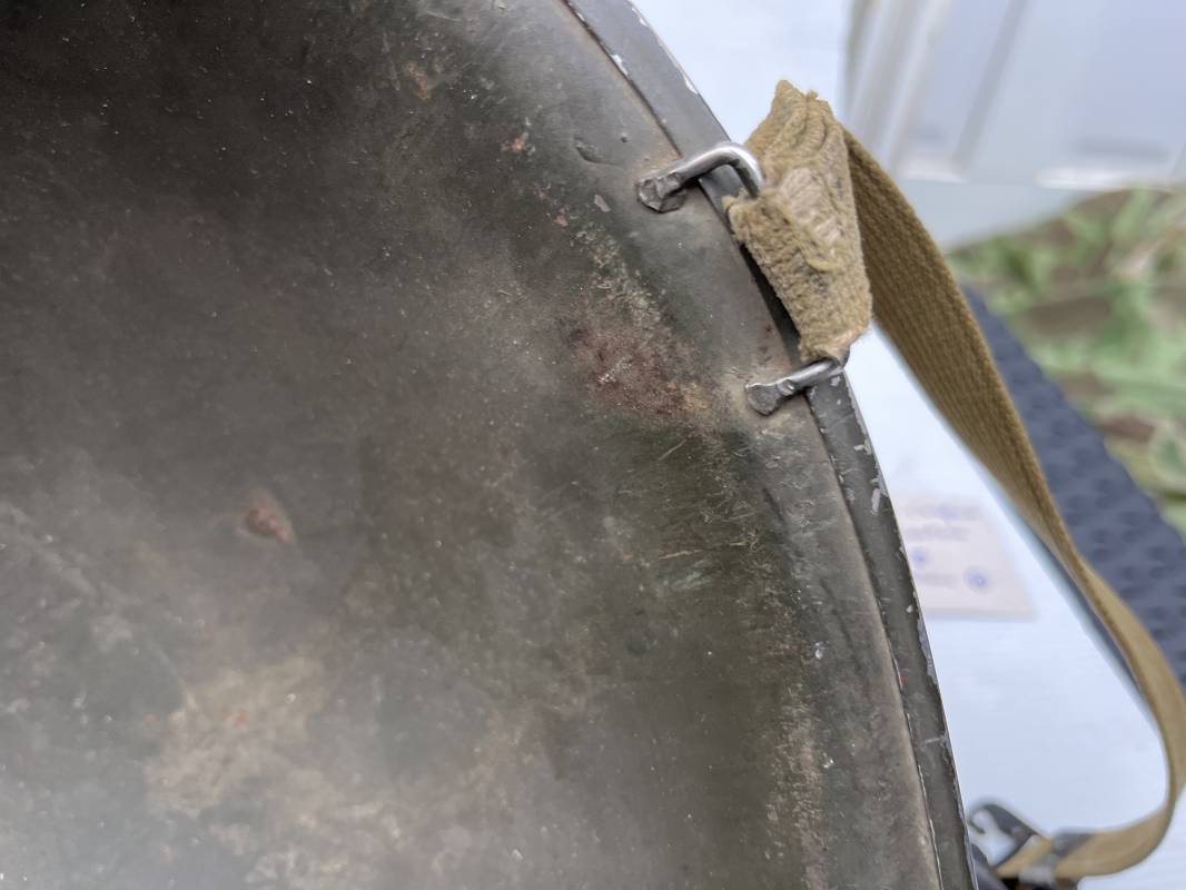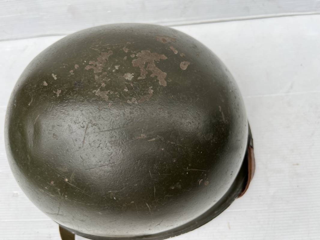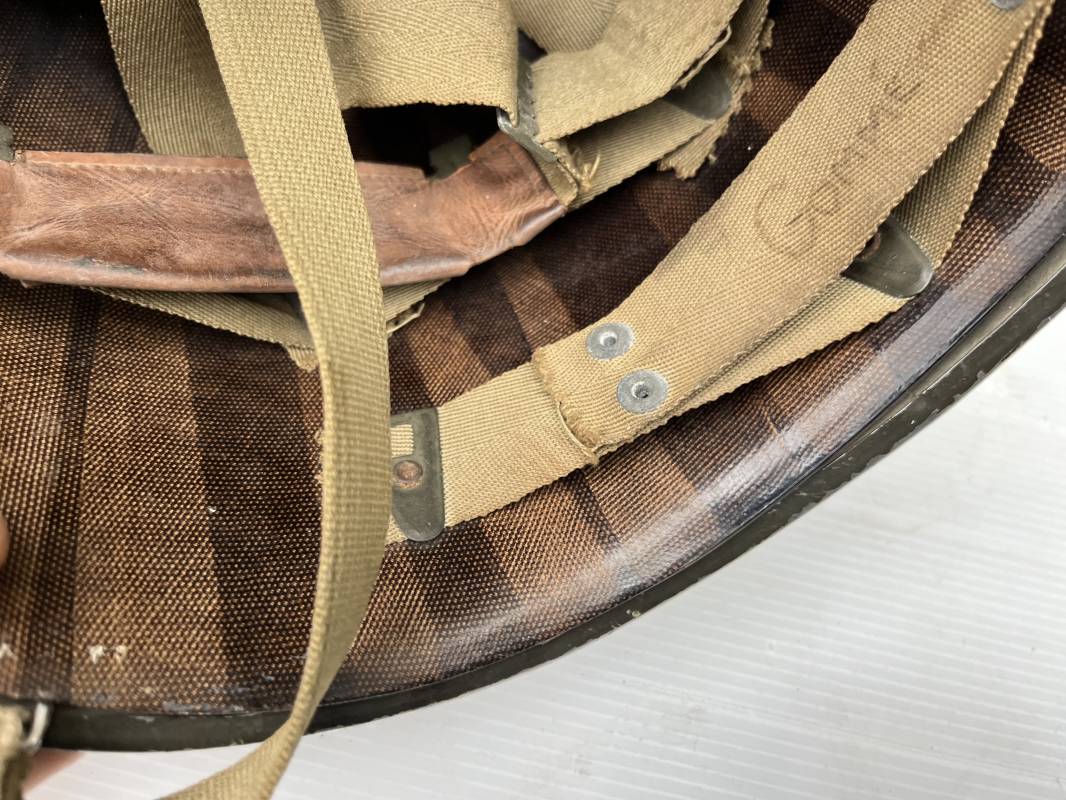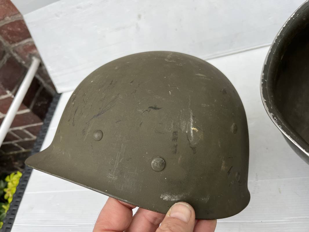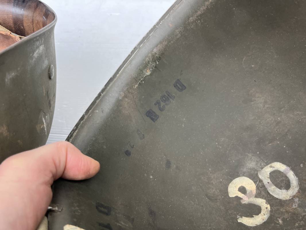 Très beau casque Américain USM1 à pontets de jugulaire fixe ( Fix Bale ) . 100 % nature et totalement intouché . Ce casque a été trouvé a Avranches ( 50 ) dans les années 1985 . Provenance collection normande . . Casque léger (Liner) en fibre compressée. Peinture mate OD d'usinage. Marquage fabricant en fond de bombe Fireston . Intèrieur en toile OD, lacet en coton, nuquière avec nom manucrit GOMME . Bandeau de coiffe en cuir marron . Jugulaire d'origine en cuir marron foncé. Boucle plate en fer Rivets en fer , cuir souple. Casque lourd avec jonc avant fabricant Mc Cord. Chiffres sur le devant intèrieur 781 A . Peinture mate OD d'usinage. Pontets fixes "Fix Bale". Jugulaire en toile OD cousues d'origines. Boucle et crochet en métal noirci.Casque en trés bel état .Trés beau casque trés légèrement porté en parfait état. Bon casque de la Bataille de Normandie 1942/44.Coiffure définitive en collection Ref 19066