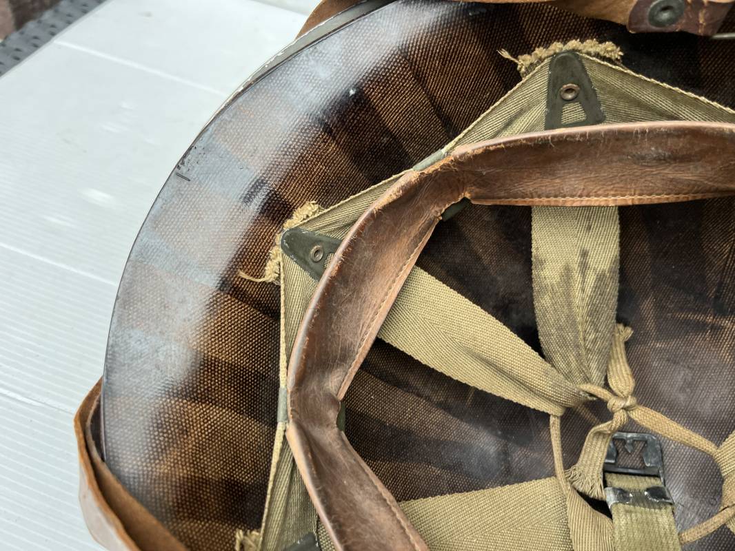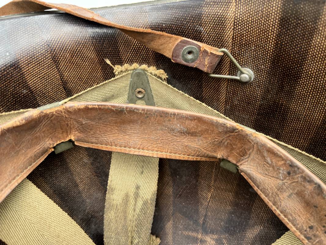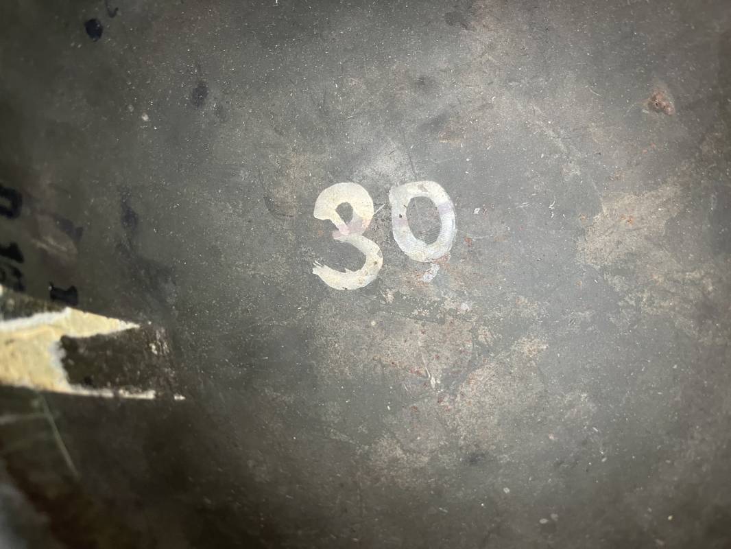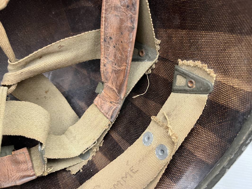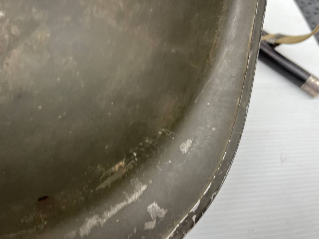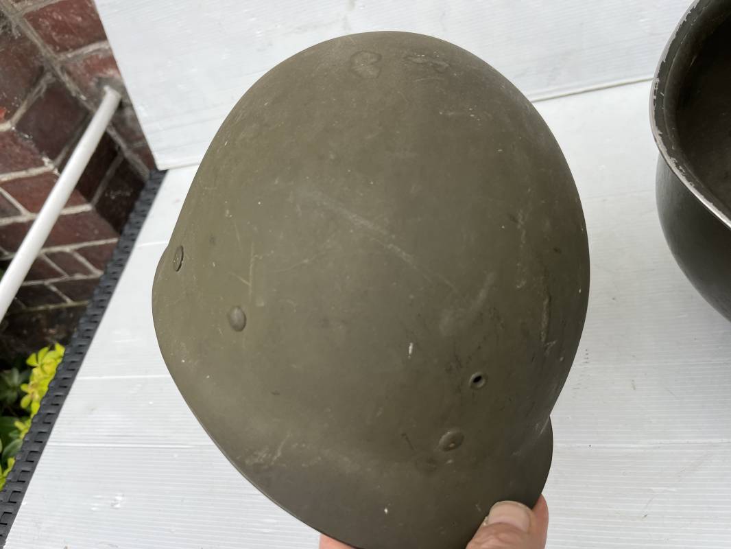 Très beau casque Américain USM1 à pontets de jugulaire fixe ( Fix Bale ) . 100 % nature et totalement intouché . Ce casque a été trouvé a Avranches ( 50 ) dans les années 1985 . Provenance collection normande . . Casque léger (Liner) en fibre compressée. Peinture mate OD d'usinage. Marquage fabricant en fond de bombe Fireston . Intèrieur en toile OD, lacet en coton, nuquière avec nom manucrit GOMME . Bandeau de coiffe en cuir marron . Jugulaire d'origine en cuir marron foncé. Boucle plate en fer Rivets en fer , cuir souple. Casque lourd avec jonc avant fabricant Mc Cord. Chiffres sur le devant intèrieur 781 A . Peinture mate OD d'usinage. Pontets fixes "Fix Bale". Jugulaire en toile OD cousues d'origines. Boucle et crochet en métal noirci.Casque en trés bel état .Trés beau casque trés légèrement porté en parfait état. Bon casque de la Bataille de Normandie 1942/44.Coiffure définitive en collection Ref 19066