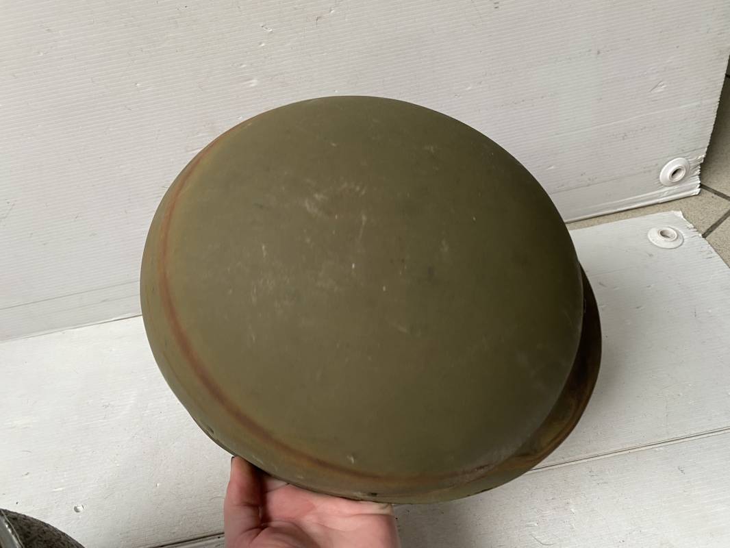 Très beau casque Américain USM1, jugulaire à pontets mobiles. Casque léger (Liner) en fibre compressée. Peinture olive drap d'origine. Marquage fabricant Westinghouse en fond de bombe. Intérieur en toile. Bandeau de coiffe en cuir. Lacet coton. Nuquière en toile. Jugulaire en cuir marron foncé d'origine , passants et boucle à clapet en laiton noirci , cuir souple , rivets marqués 'United Carr' . Casque lourd ; Coque avec jonc arrière. Chiffres sur le devant 975B. Peinture semi granuleuse OD d'origine. Pontets de jugulaires mobiles. Jugulaires en toile OD avec boucles en laiton noirci. A noter jugulaire cuir fragilisée a un endroit mais non cassante. Bon casque légèrement porté en bon état 100% nature et utilisé. Ce casque a été trouvé en Brocante dans l'Est de la France 1944/45. Ref 19032