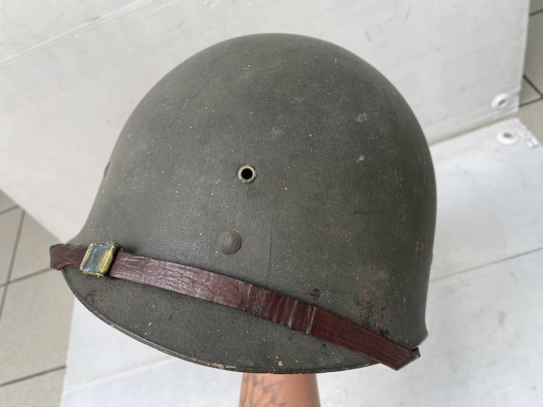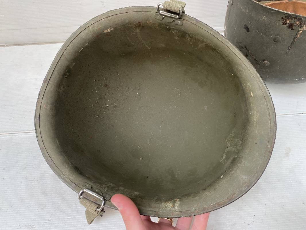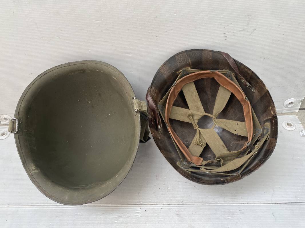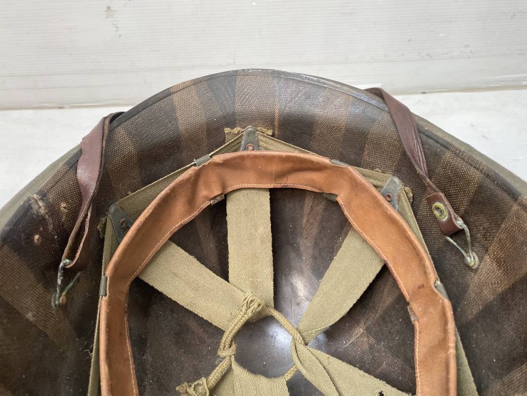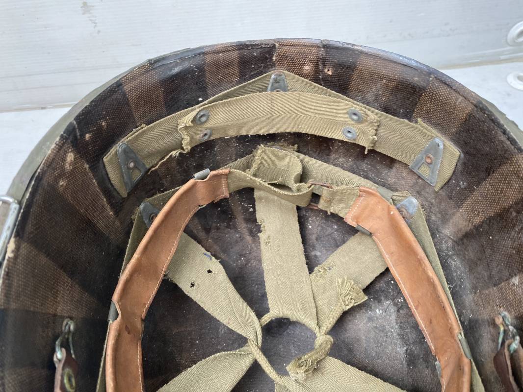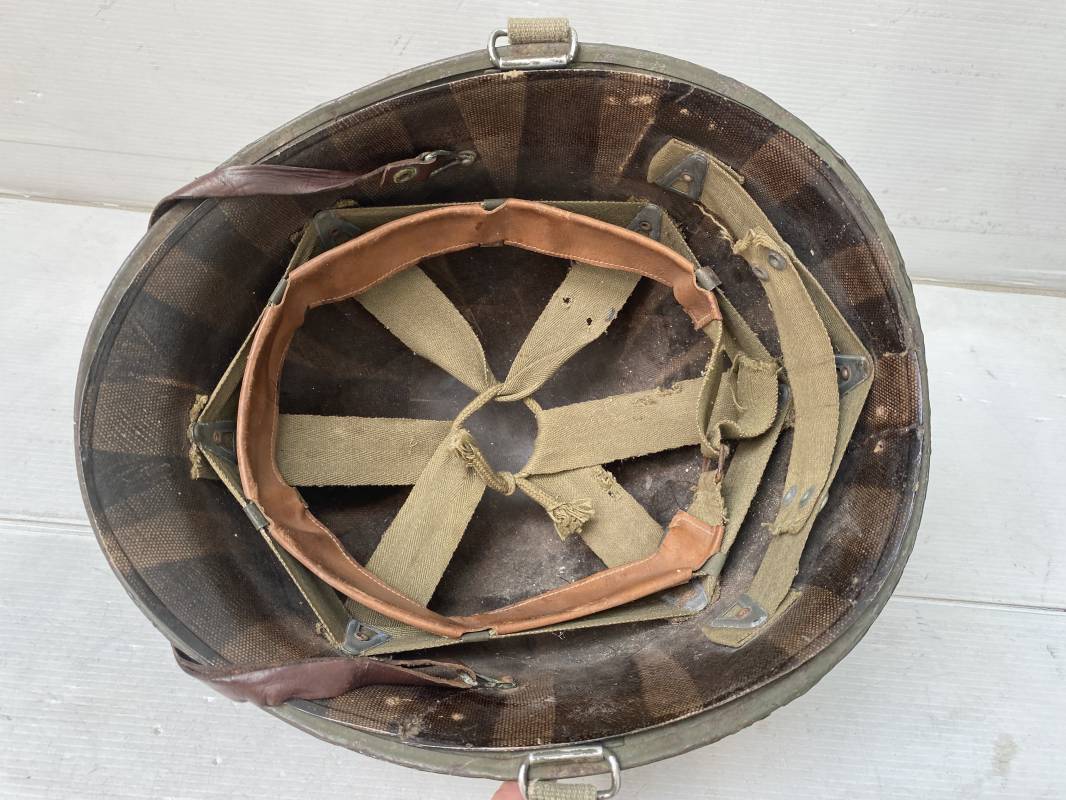 Très beau casque Américain USM1 trouvé à Saint Valéry en Caux (76) Camp 'Lucky Strike'. Ce casque n'a jamais été en collection. Jamais nettoyé avec poussière d'origine. Casque léger (Liner) en fibre compressée. Peinture olive drab d'usinage. Marquage fabricant en fond de bombe Westinghouse. Fibre endommagée et réparations d'origines par colle (voir photos). Intèrieur en toile, lacet coton. Nuquière, bandeau de coiffe en cuir fauve. Jugulaire d'origine en cuir marron foncé. Boucle plate en laiton noirci. Rivet laiton noirci marqué United Carr, cuir souple. Casque lourd avec jonc avant fabricant 'Mc Cord'. Chiffres sur le devant '316B'. Peinture semi granuleuse OD d'usinage. Pontets mobiles et jugulaires toile OD. Boucle et crochets en fer noirci. Bon casque porté 100% terrain et intouché 1944/45. Ref 17941
