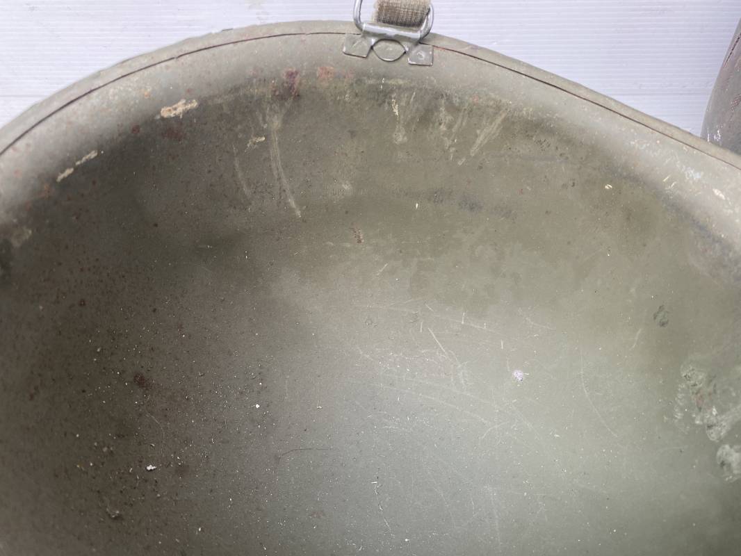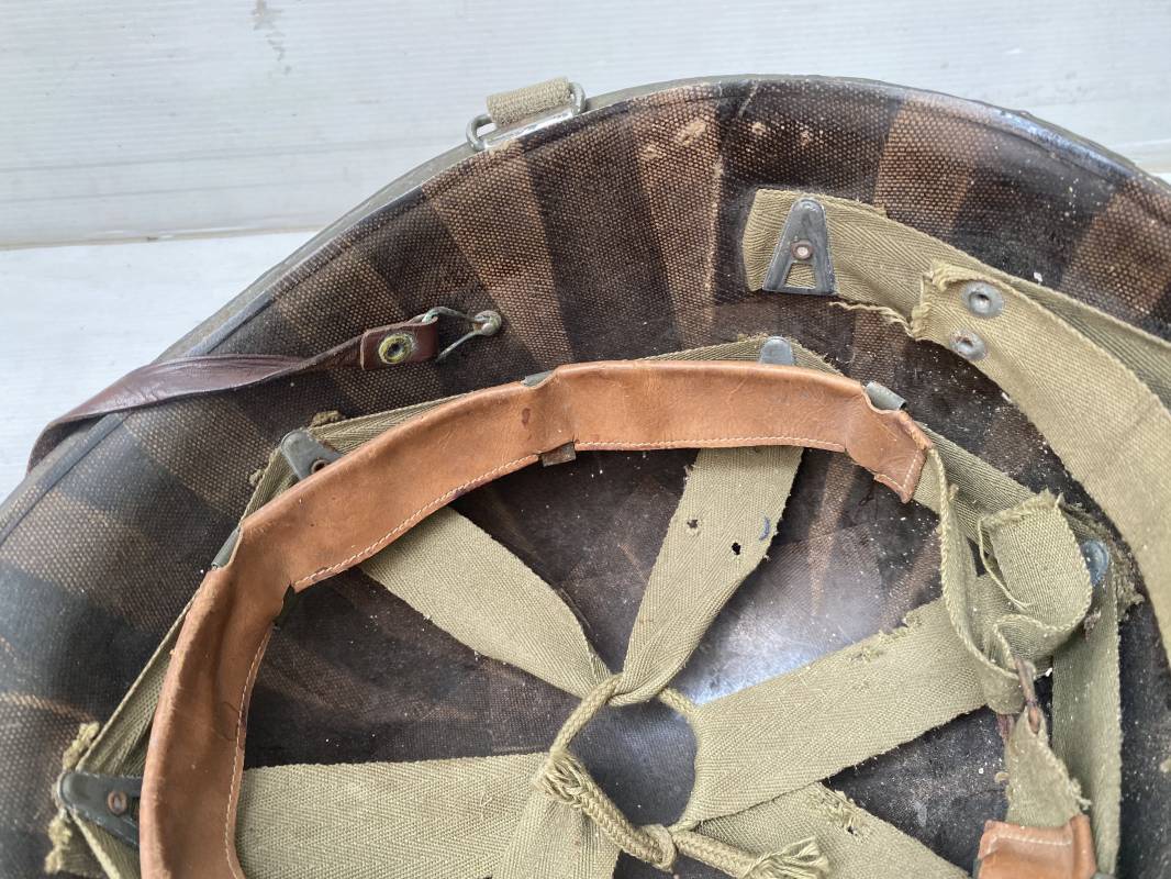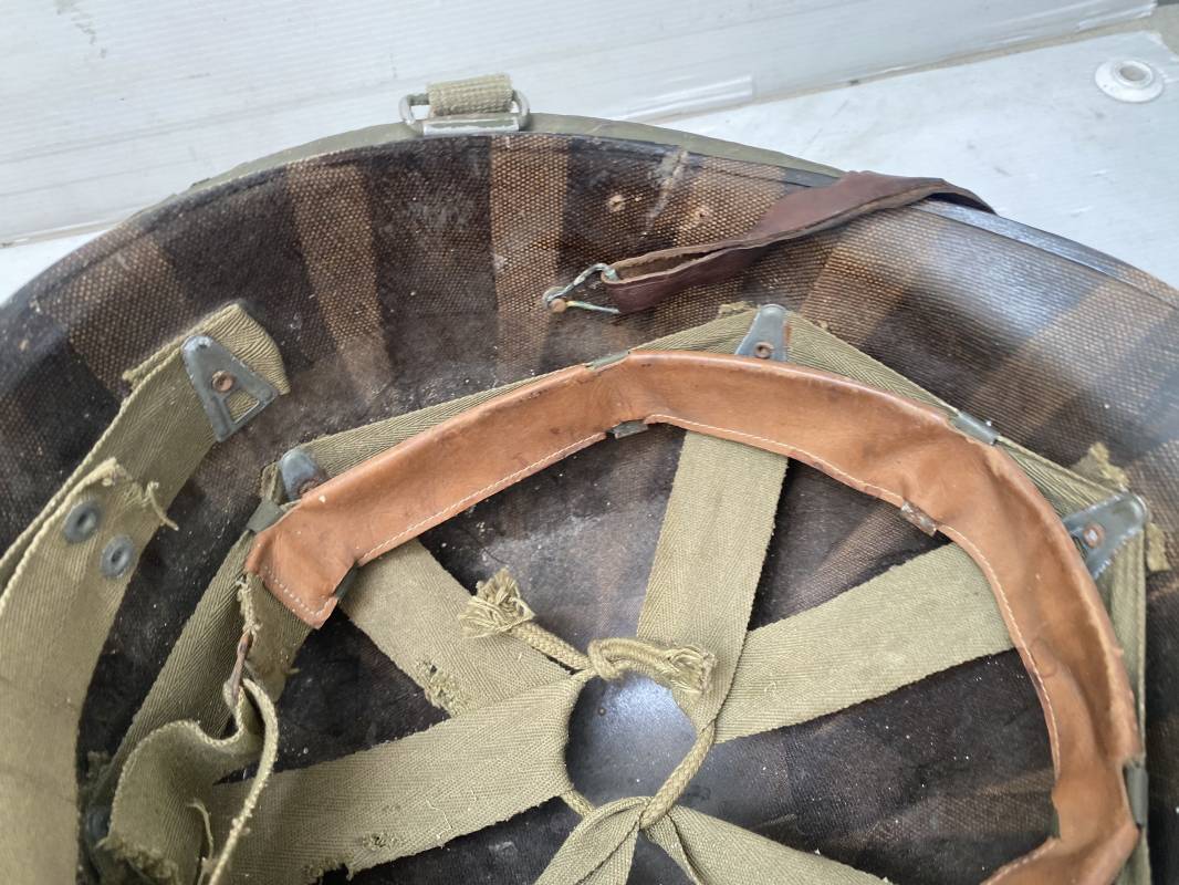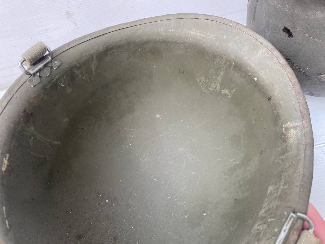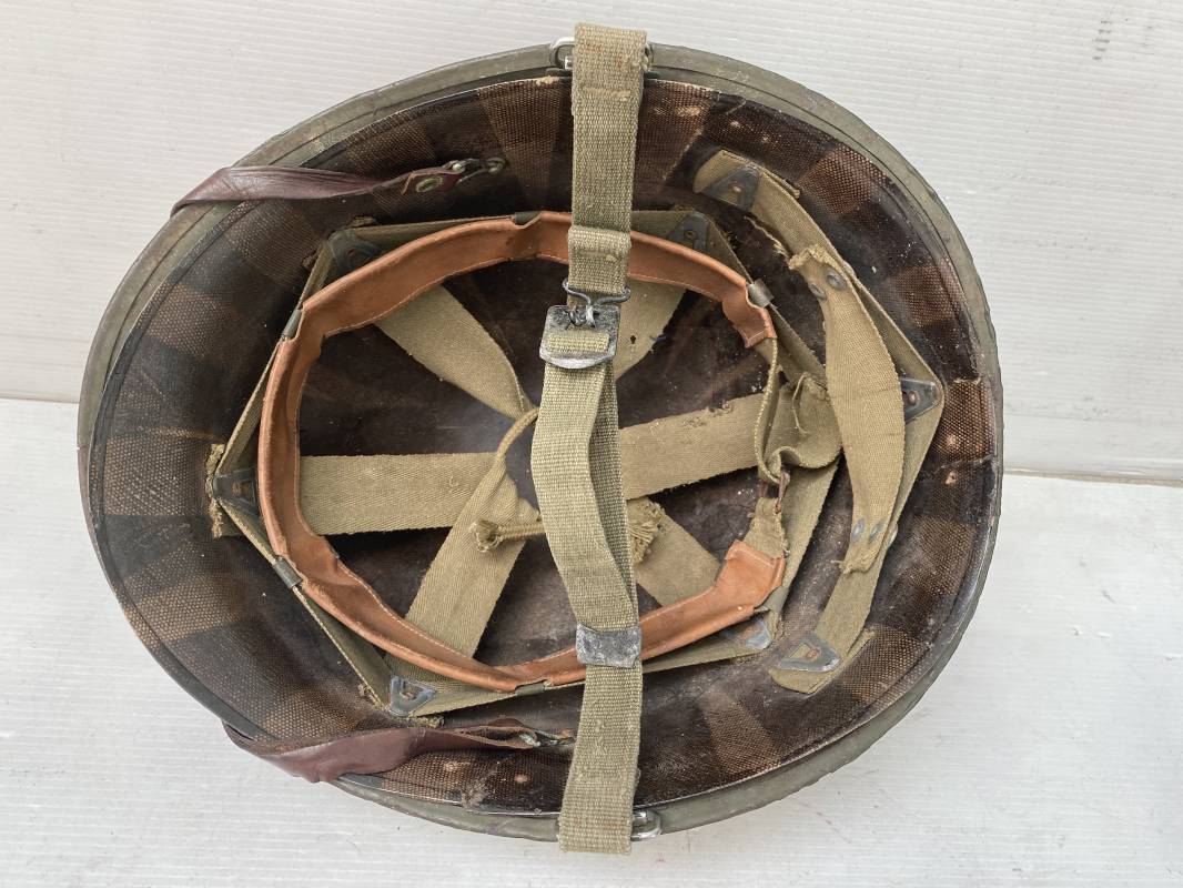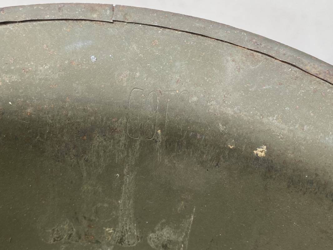 Très beau casque Américain USM1 trouvé à Saint Valéry en Caux (76) Camp 'Lucky Strike'. Ce casque n'a jamais été en collection. Jamais nettoyé avec poussière d'origine. Casque léger (Liner) en fibre compressée. Peinture olive drab d'usinage. Marquage fabricant en fond de bombe Westinghouse. Fibre endommagée et réparations d'origines par colle (voir photos). Intèrieur en toile, lacet coton. Nuquière, bandeau de coiffe en cuir fauve. Jugulaire d'origine en cuir marron foncé. Boucle plate en laiton noirci. Rivet laiton noirci marqué United Carr, cuir souple. Casque lourd avec jonc avant fabricant 'Mc Cord'. Chiffres sur le devant '316B'. Peinture semi granuleuse OD d'usinage. Pontets mobiles et jugulaires toile OD. Boucle et crochets en fer noirci. Bon casque porté 100% terrain et intouché 1944/45. Ref 17941