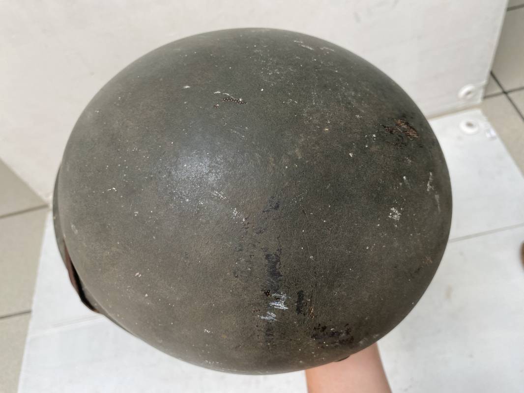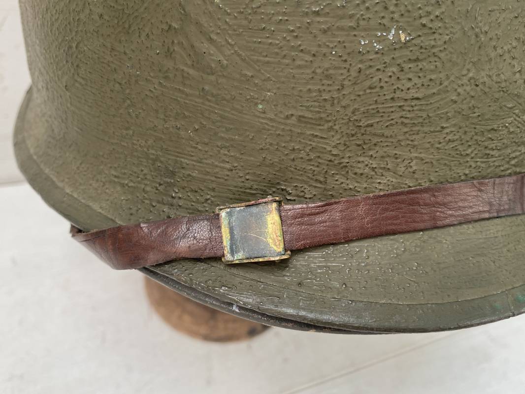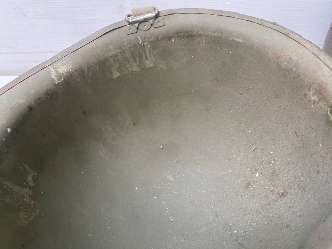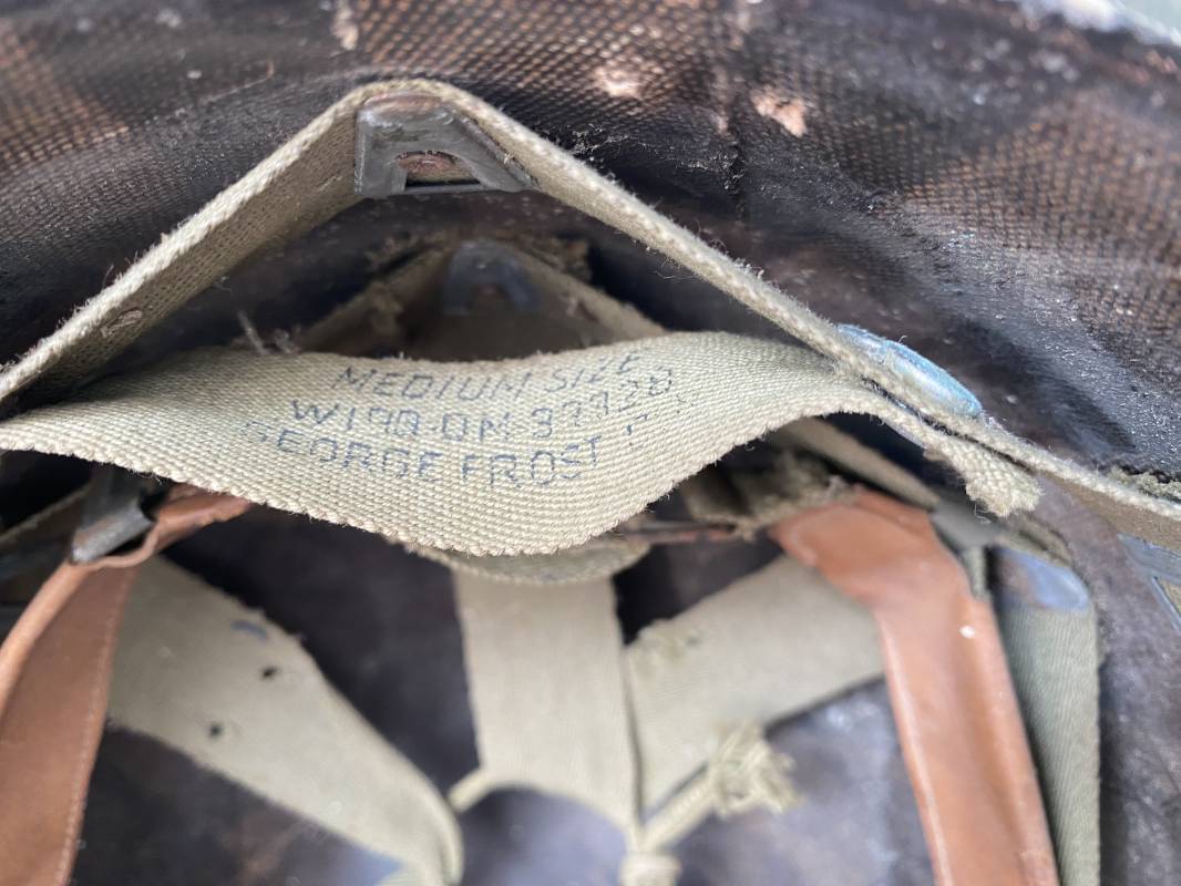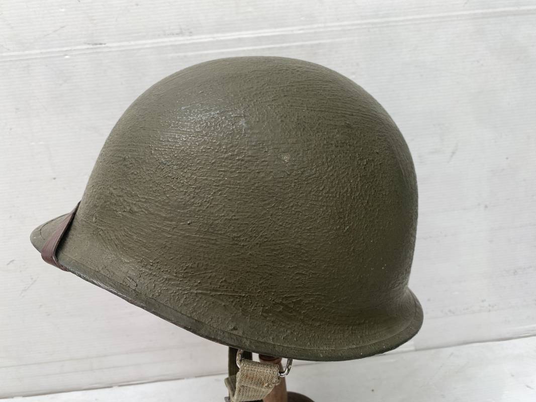 Très beau casque Américain USM1 trouvé à Saint Valéry en Caux (76) Camp 'Lucky Strike'. Ce casque n'a jamais été en collection. Jamais nettoyé avec poussière d'origine. Casque léger (Liner) en fibre compressée. Peinture olive drab d'usinage. Marquage fabricant en fond de bombe Westinghouse. Fibre endommagée et réparations d'origines par colle (voir photos). Intèrieur en toile, lacet coton. Nuquière, bandeau de coiffe en cuir fauve. Jugulaire d'origine en cuir marron foncé. Boucle plate en laiton noirci. Rivet laiton noirci marqué United Carr, cuir souple. Casque lourd avec jonc avant fabricant 'Mc Cord'. Chiffres sur le devant '316B'. Peinture semi granuleuse OD d'usinage. Pontets mobiles et jugulaires toile OD. Boucle et crochets en fer noirci. Bon casque porté 100% terrain et intouché 1944/45. Ref 17941