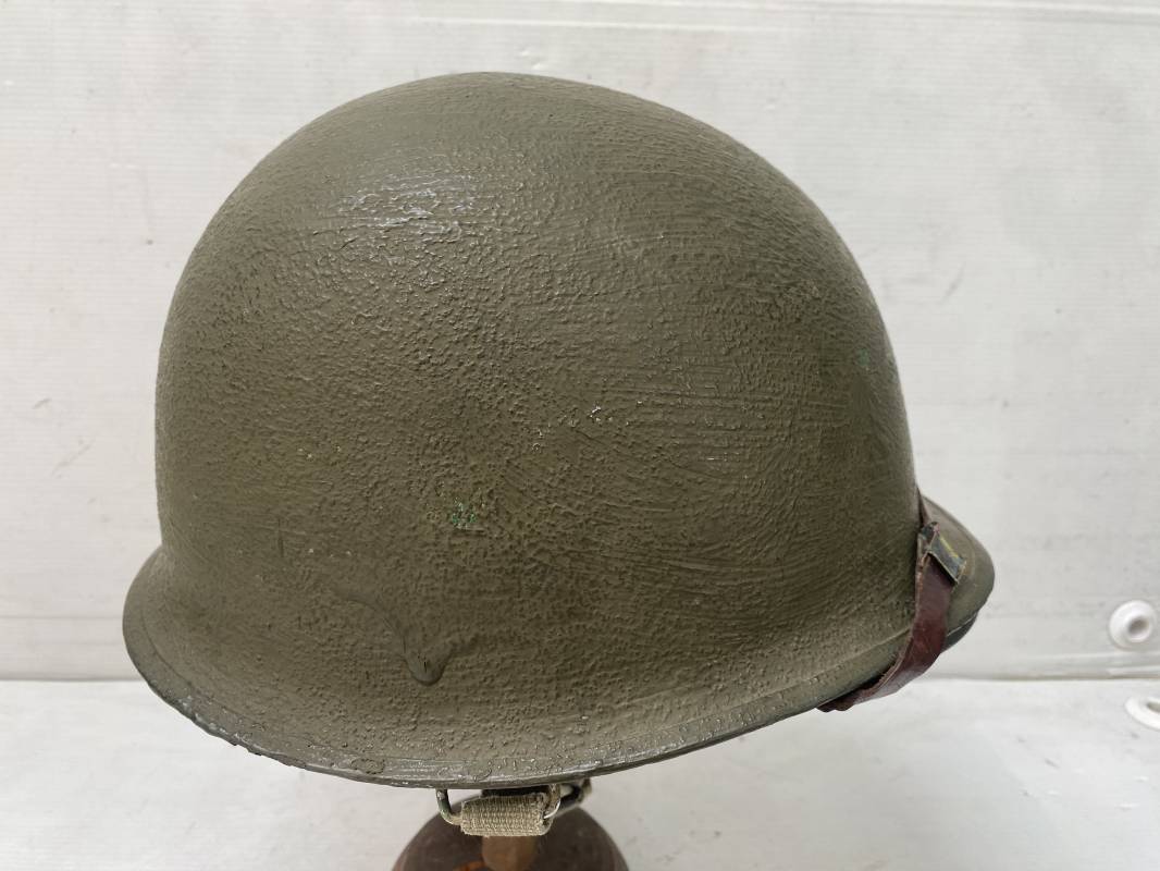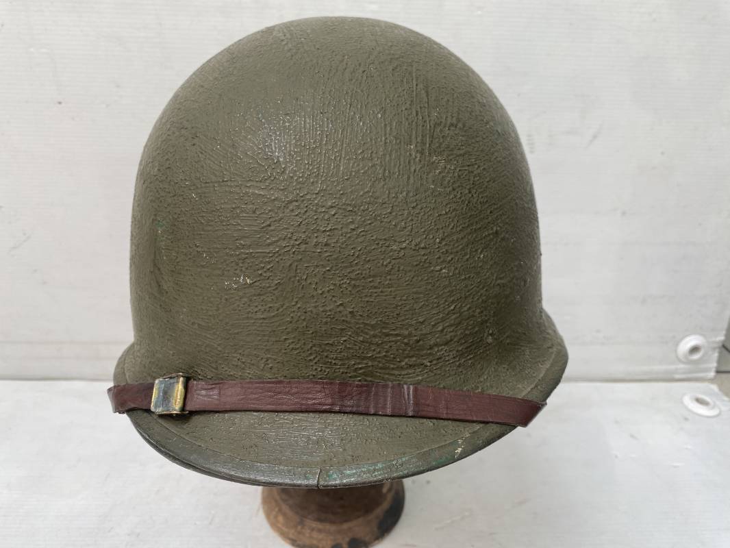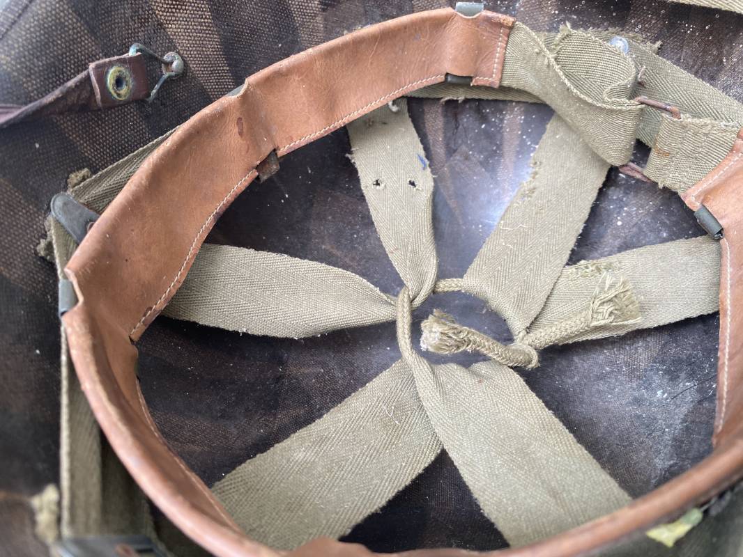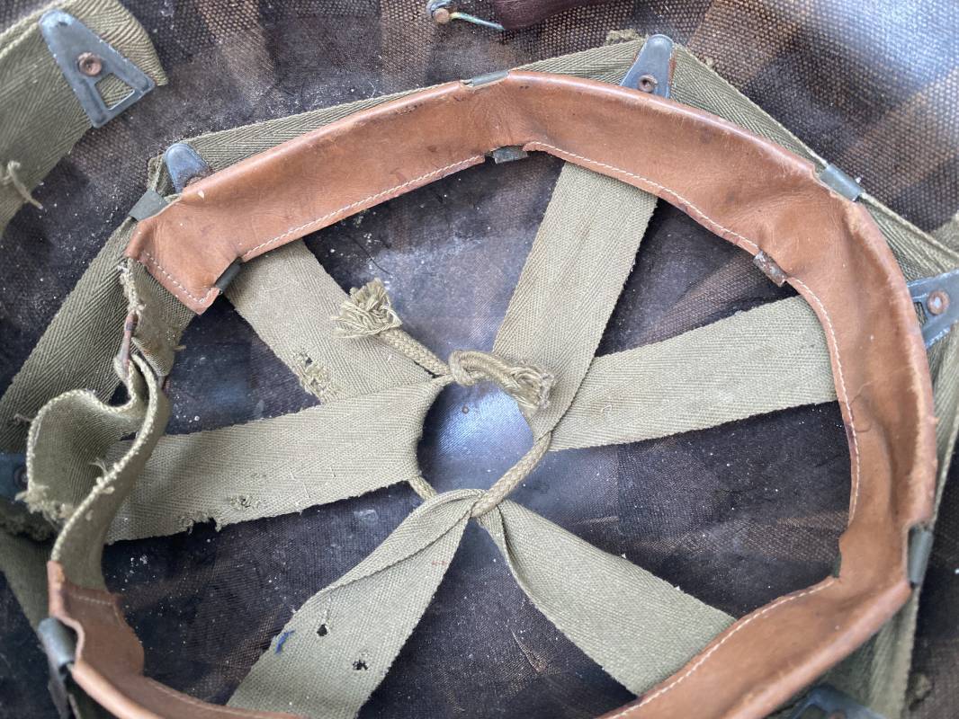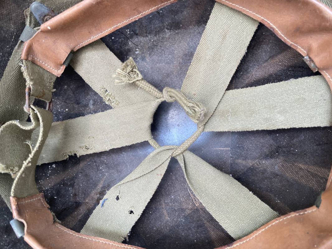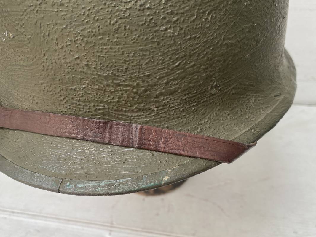 Très beau casque Américain USM1 trouvé à Saint Valéry en Caux (76) Camp 'Lucky Strike'. Ce casque n'a jamais été en collection. Jamais nettoyé avec poussière d'origine. Casque léger (Liner) en fibre compressée. Peinture olive drab d'usinage. Marquage fabricant en fond de bombe Westinghouse. Fibre endommagée et réparations d'origines par colle (voir photos). Intèrieur en toile, lacet coton. Nuquière, bandeau de coiffe en cuir fauve. Jugulaire d'origine en cuir marron foncé. Boucle plate en laiton noirci. Rivet laiton noirci marqué United Carr, cuir souple. Casque lourd avec jonc avant fabricant 'Mc Cord'. Chiffres sur le devant '316B'. Peinture semi granuleuse OD d'usinage. Pontets mobiles et jugulaires toile OD. Boucle et crochets en fer noirci. Bon casque porté 100% terrain et intouché 1944/45. Ref 17941
