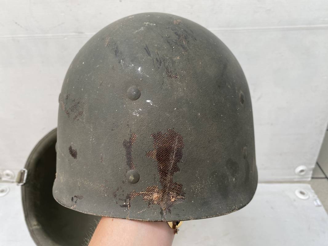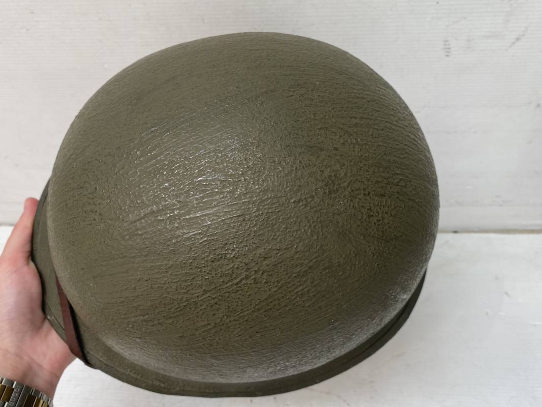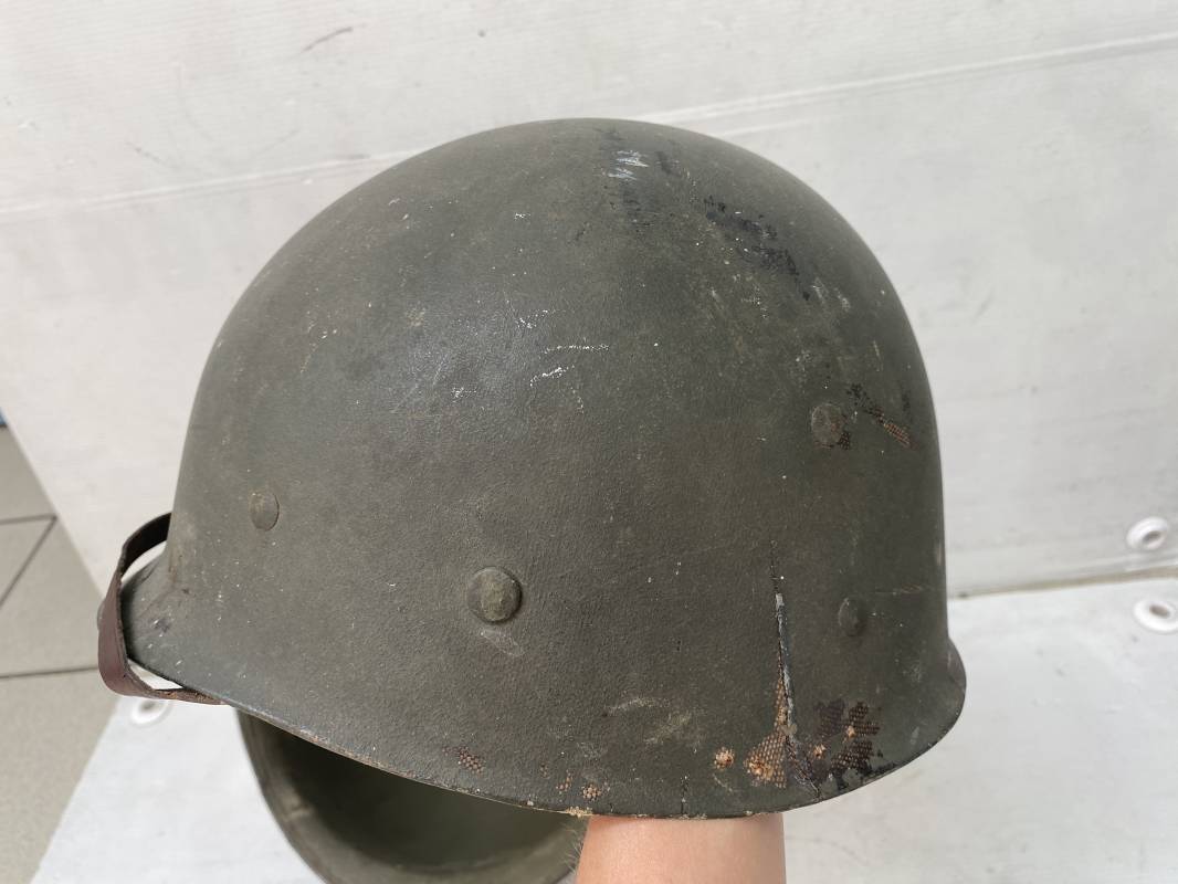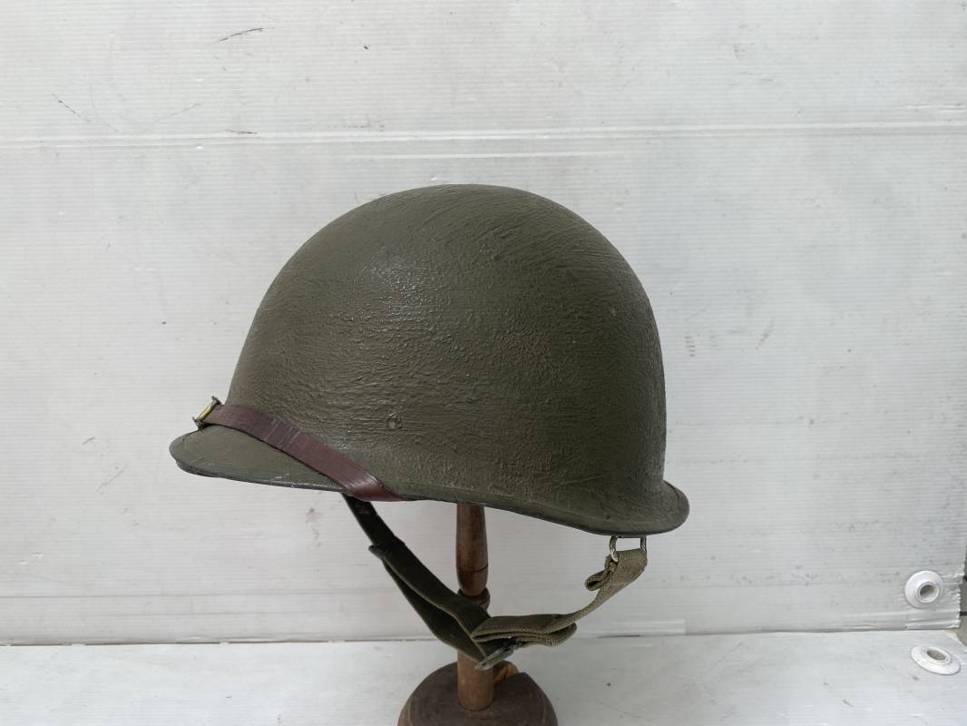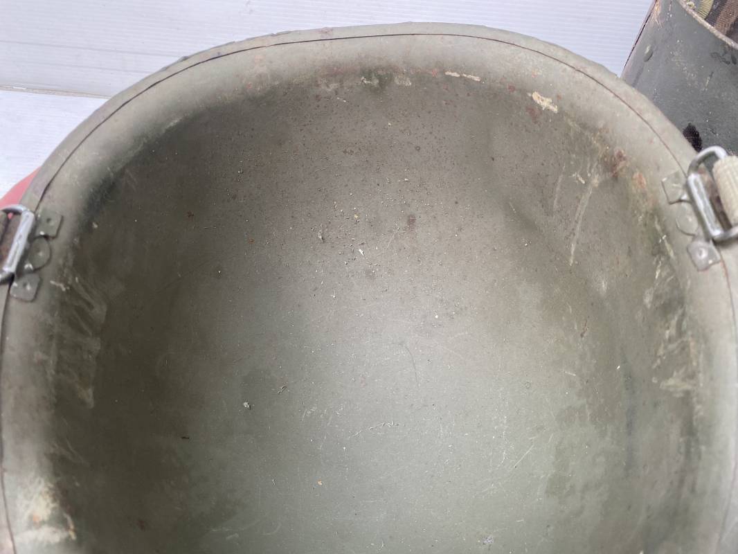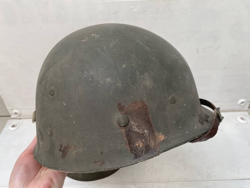 Très beau casque Américain USM1 trouvé à Saint Valéry en Caux (76) Camp 'Lucky Strike'. Ce casque n'a jamais été en collection. Jamais nettoyé avec poussière d'origine. Casque léger (Liner) en fibre compressée. Peinture olive drab d'usinage. Marquage fabricant en fond de bombe Westinghouse. Fibre endommagée et réparations d'origines par colle (voir photos). Intèrieur en toile, lacet coton. Nuquière, bandeau de coiffe en cuir fauve. Jugulaire d'origine en cuir marron foncé. Boucle plate en laiton noirci. Rivet laiton noirci marqué United Carr, cuir souple. Casque lourd avec jonc avant fabricant 'Mc Cord'. Chiffres sur le devant '316B'. Peinture semi granuleuse OD d'usinage. Pontets mobiles et jugulaires toile OD. Boucle et crochets en fer noirci. Bon casque porté 100% terrain et intouché 1944/45. Ref 17941