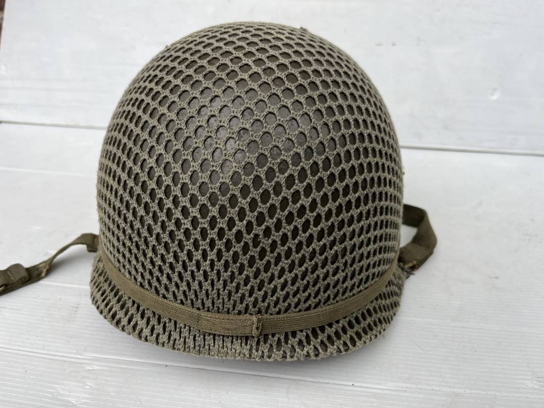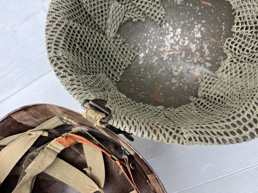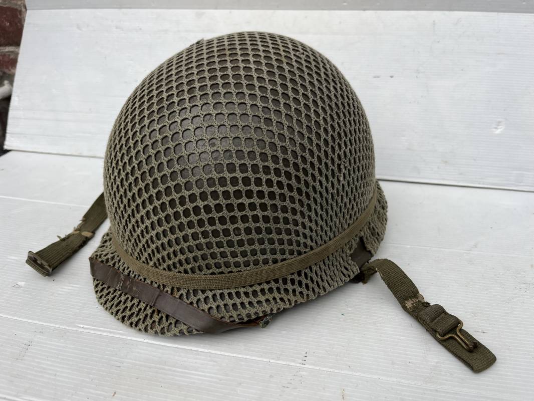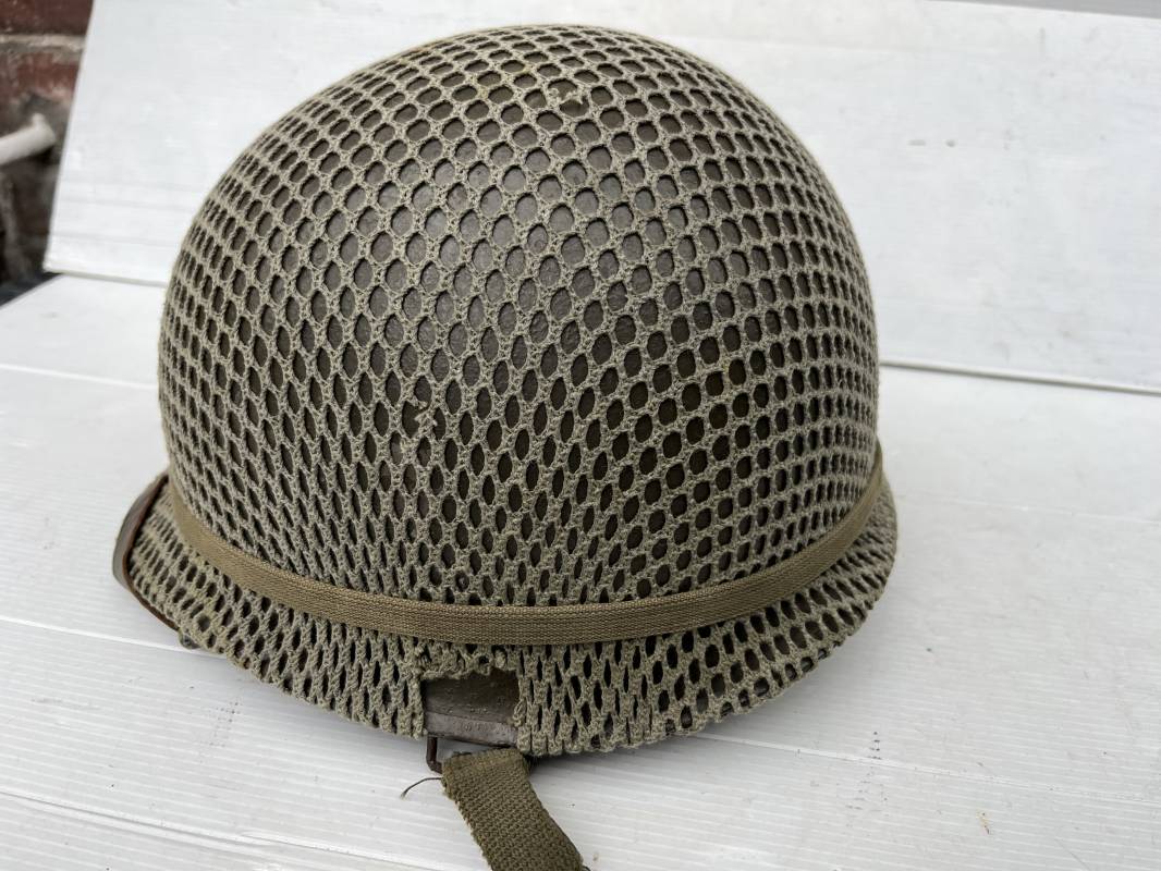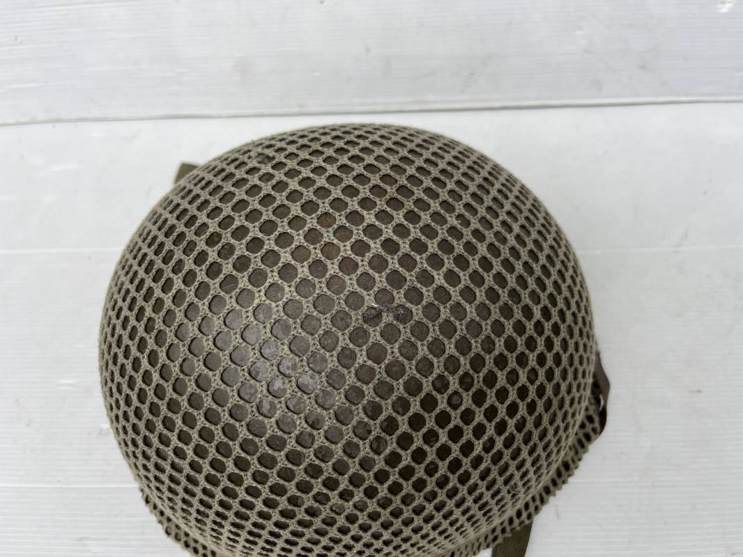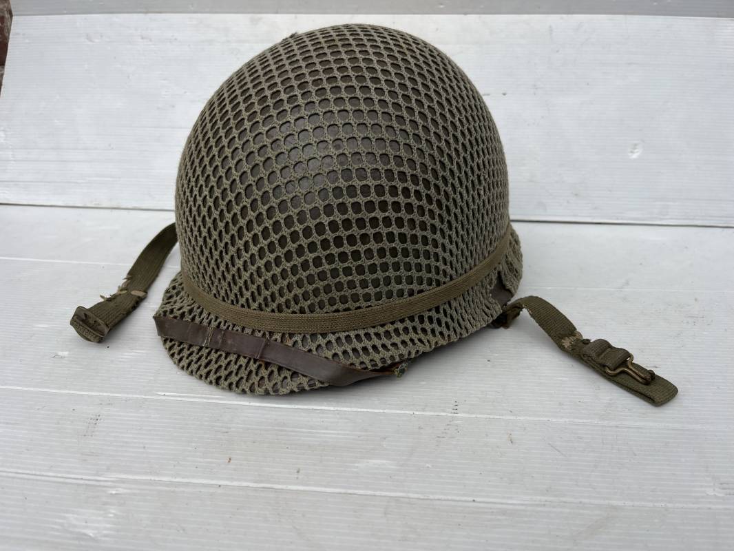 Très beau casque Américain USM1, jugulaire à pontet mobile et son filet Mdle 1943 monté d origine . Casque léger (Liner) en fibre compressée. Peinture olive drap d'origine. Marquage fabricant Westinghouse en fond de bombe. Intérieur en toile. Bandeau de coiffe en cuir. Lacet coton. Nuquière en toile. Jugulaire en cuir marron foncé d'origine , passants et boucle à clapet en laiton noirci , cuir souple , rivets marqués 'United Carr' . Casque lourd ; Coque avec jonc avant Fabricant Mc Cord . Chiffres sur le devant 2 B . Peinture mate OD d'origine. Pontets de jugulaires mobiles. Jugulaires en toile OD avec boucles en laiton noirci. Filet modéle 1943 monté d origine . Petites mailles en coton vert , bande en coton verte sur le pourtour Bon casque légèrement porté en parfait état . Fin 1944 , début 45. Ref 19837
