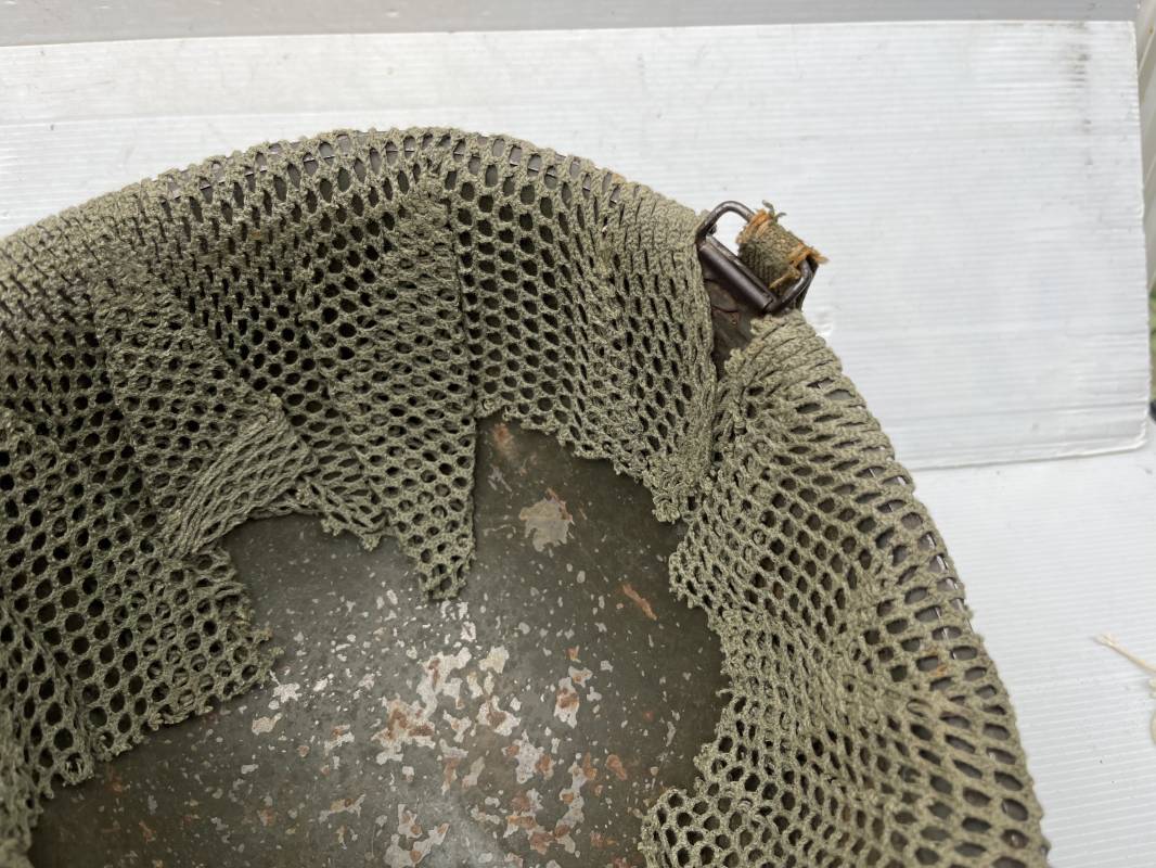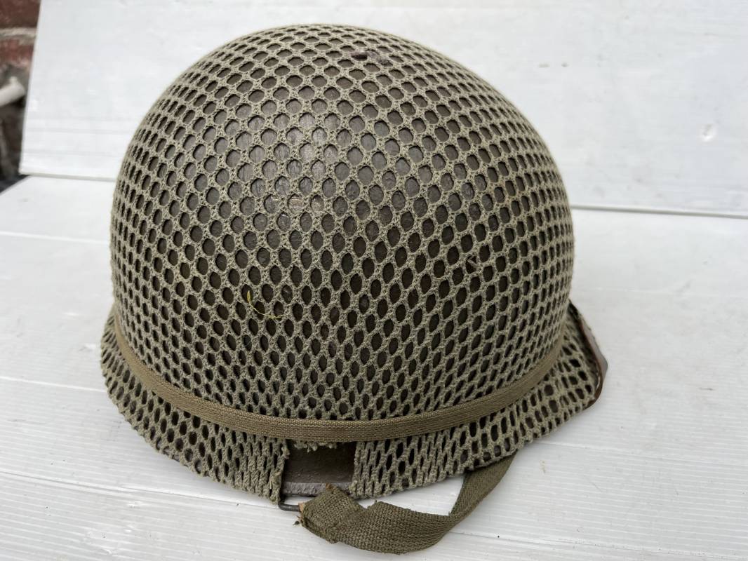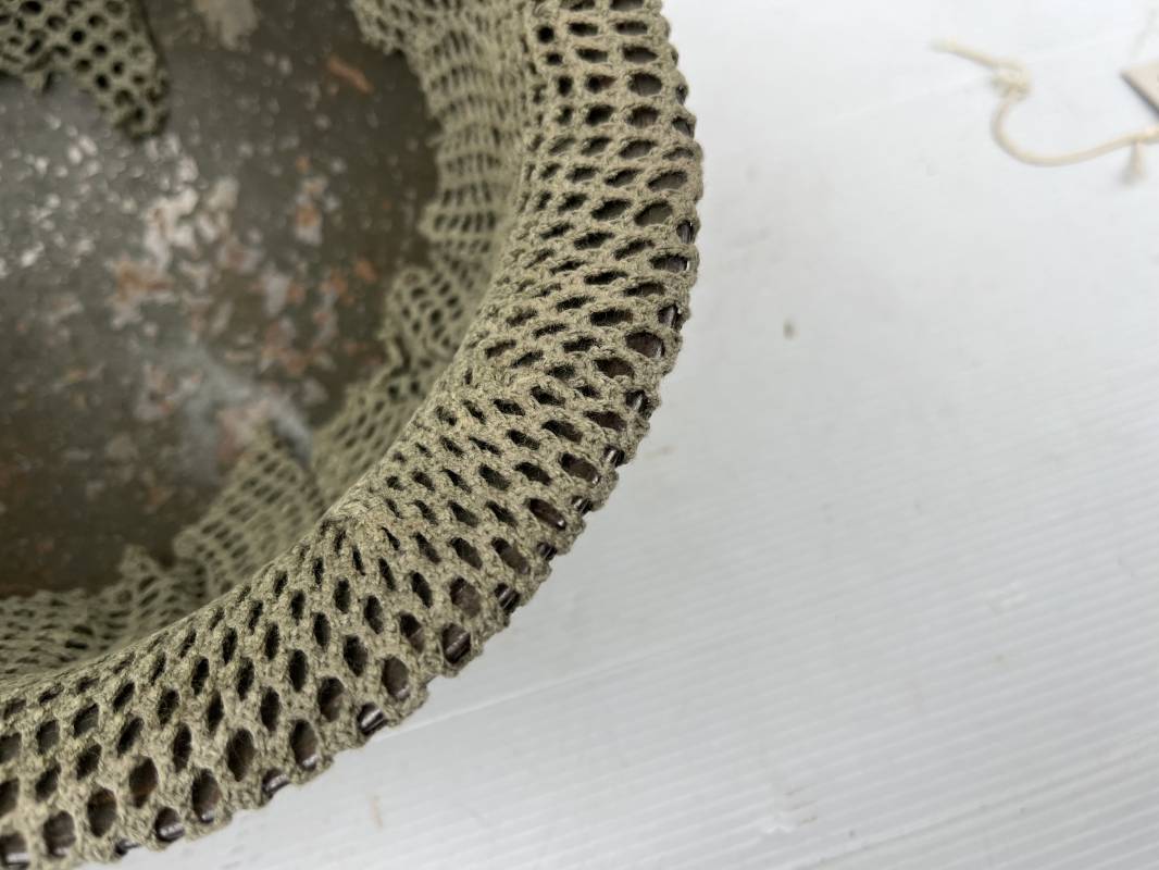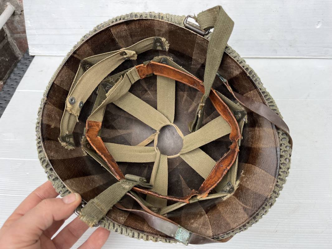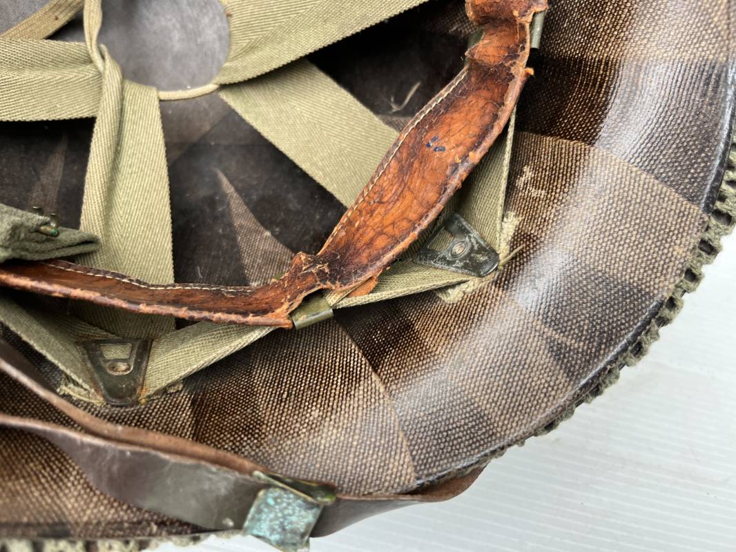 Très beau casque Américain USM1, jugulaire à pontet mobile et son filet Mdle 1943 monté d origine . Casque léger (Liner) en fibre compressée. Peinture olive drap d'origine. Marquage fabricant Westinghouse en fond de bombe. Intérieur en toile. Bandeau de coiffe en cuir. Lacet coton. Nuquière en toile. Jugulaire en cuir marron foncé d'origine , passants et boucle à clapet en laiton noirci , cuir souple , rivets marqués 'United Carr' . Casque lourd ; Coque avec jonc avant Fabricant Mc Cord . Chiffres sur le devant 2 B . Peinture mate OD d'origine. Pontets de jugulaires mobiles. Jugulaires en toile OD avec boucles en laiton noirci. Filet modéle 1943 monté d origine . Petites mailles en coton vert , bande en coton verte sur le pourtour Bon casque légèrement porté en parfait état . Fin 1944 , début 45. Ref 19837