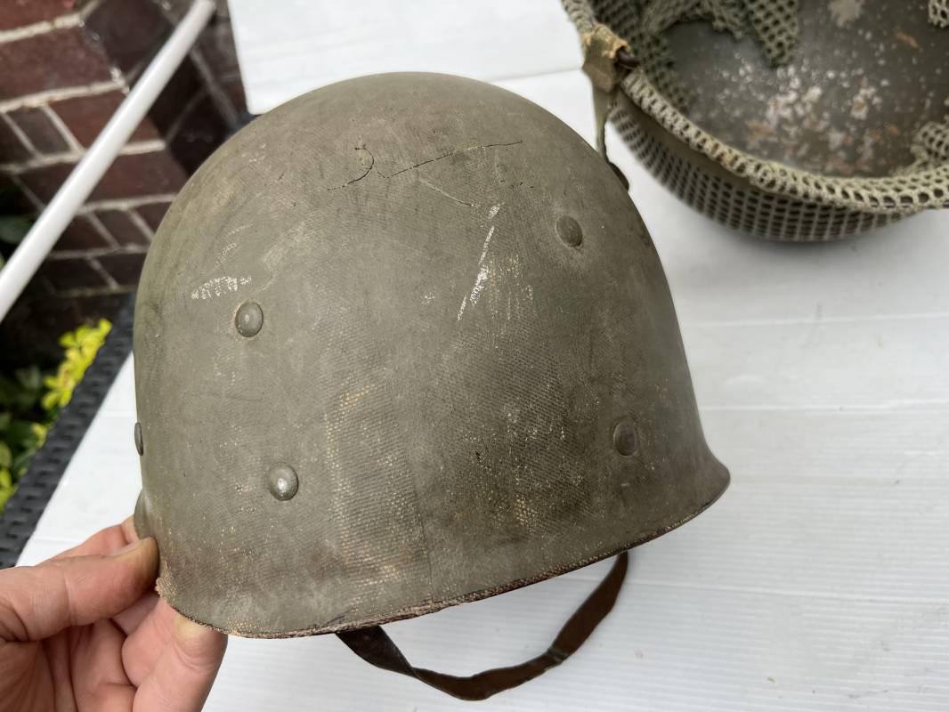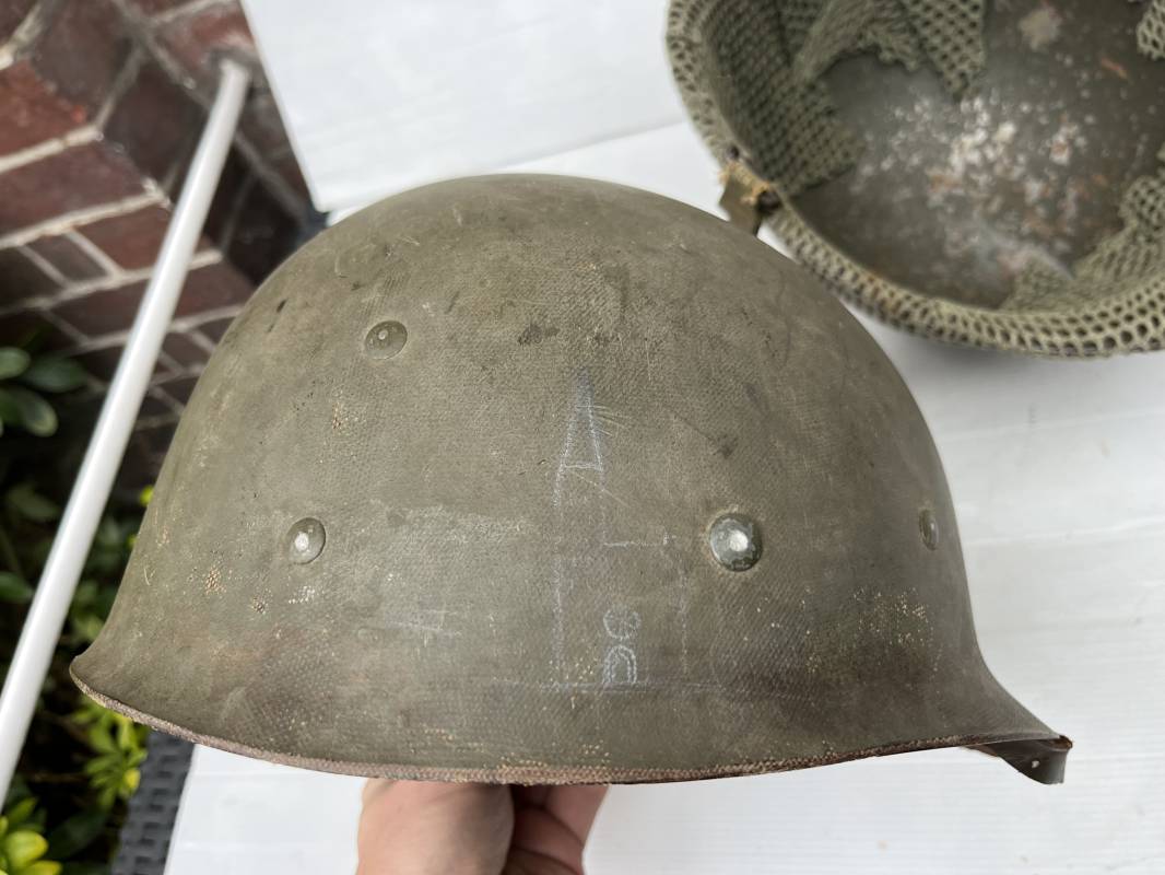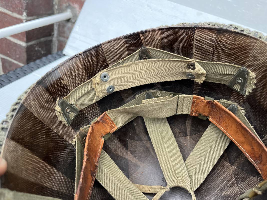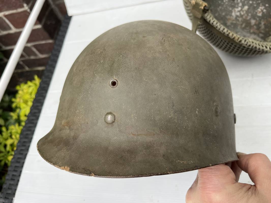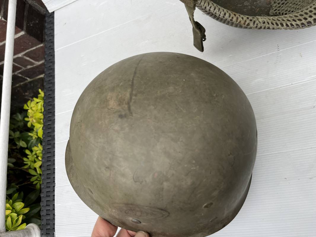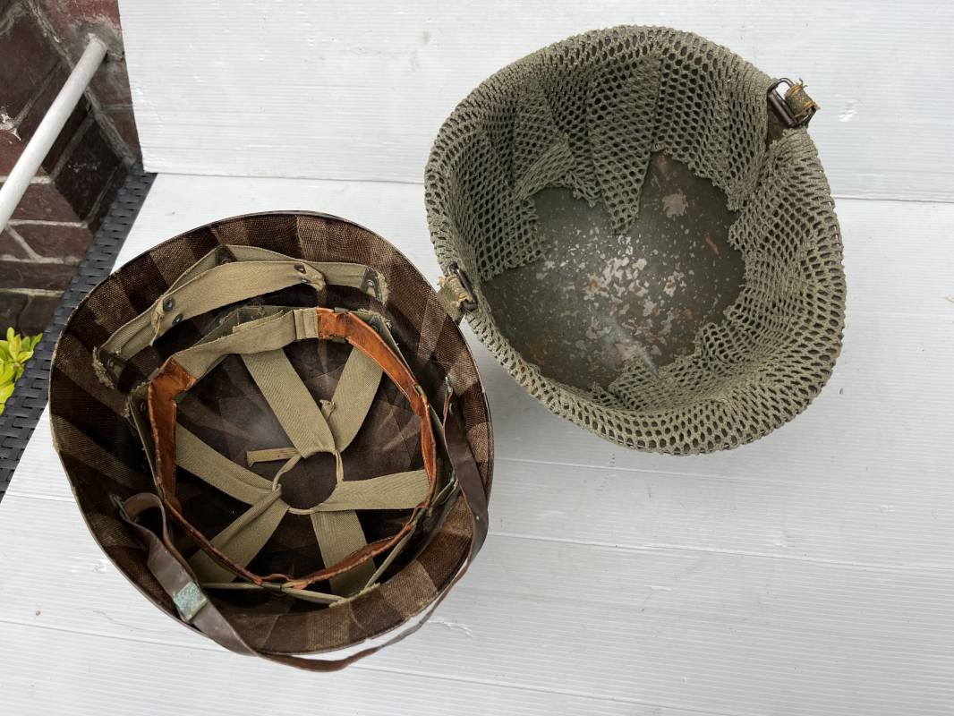 Très beau casque Américain USM1, jugulaire à pontet mobile et son filet Mdle 1943 monté d origine . Casque léger (Liner) en fibre compressée. Peinture olive drap d'origine. Marquage fabricant Westinghouse en fond de bombe. Intérieur en toile. Bandeau de coiffe en cuir. Lacet coton. Nuquière en toile. Jugulaire en cuir marron foncé d'origine , passants et boucle à clapet en laiton noirci , cuir souple , rivets marqués 'United Carr' . Casque lourd ; Coque avec jonc avant Fabricant Mc Cord . Chiffres sur le devant 2 B . Peinture mate OD d'origine. Pontets de jugulaires mobiles. Jugulaires en toile OD avec boucles en laiton noirci. Filet modéle 1943 monté d origine . Petites mailles en coton vert , bande en coton verte sur le pourtour Bon casque légèrement porté en parfait état . Fin 1944 , début 45. Ref 19837