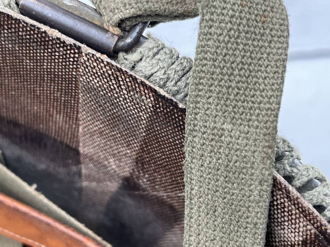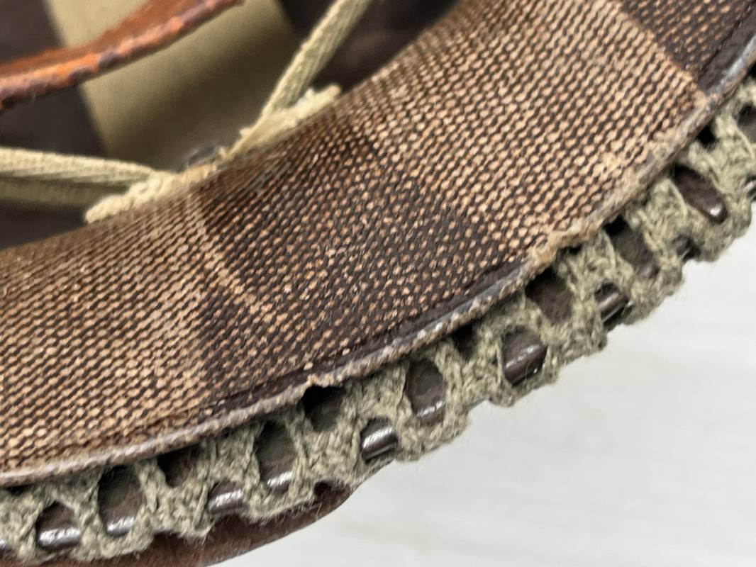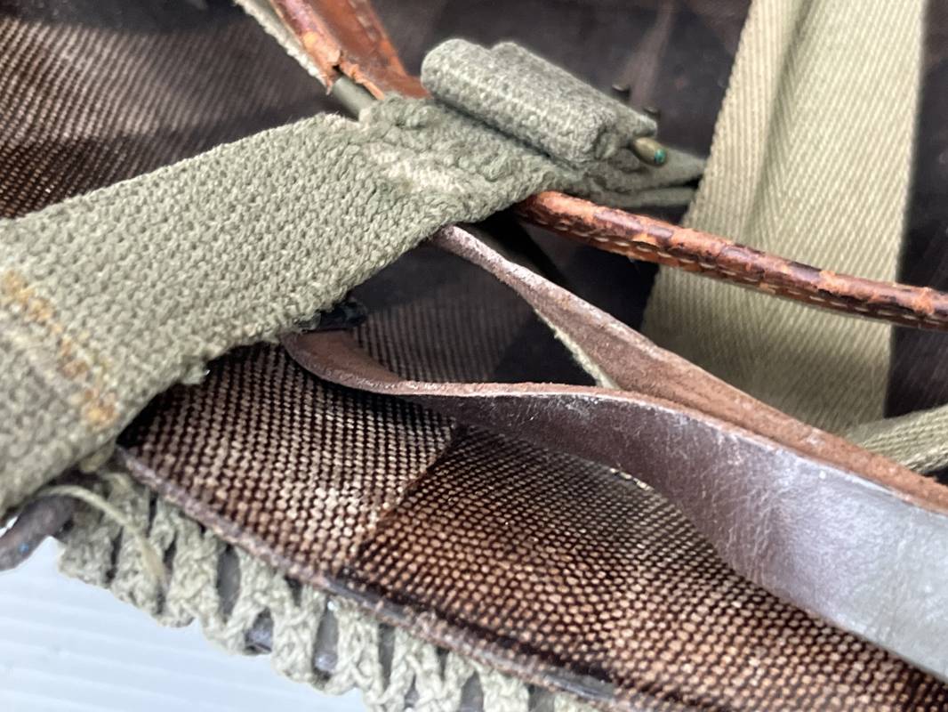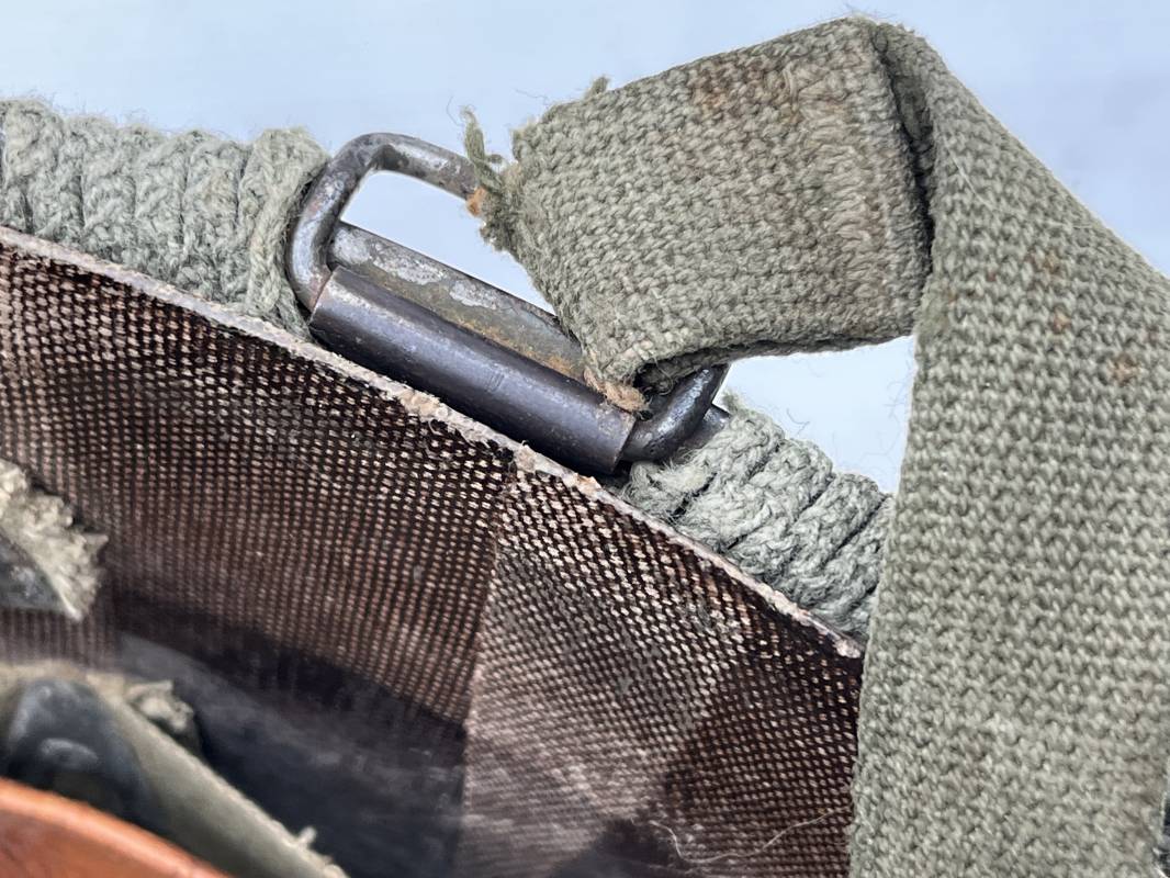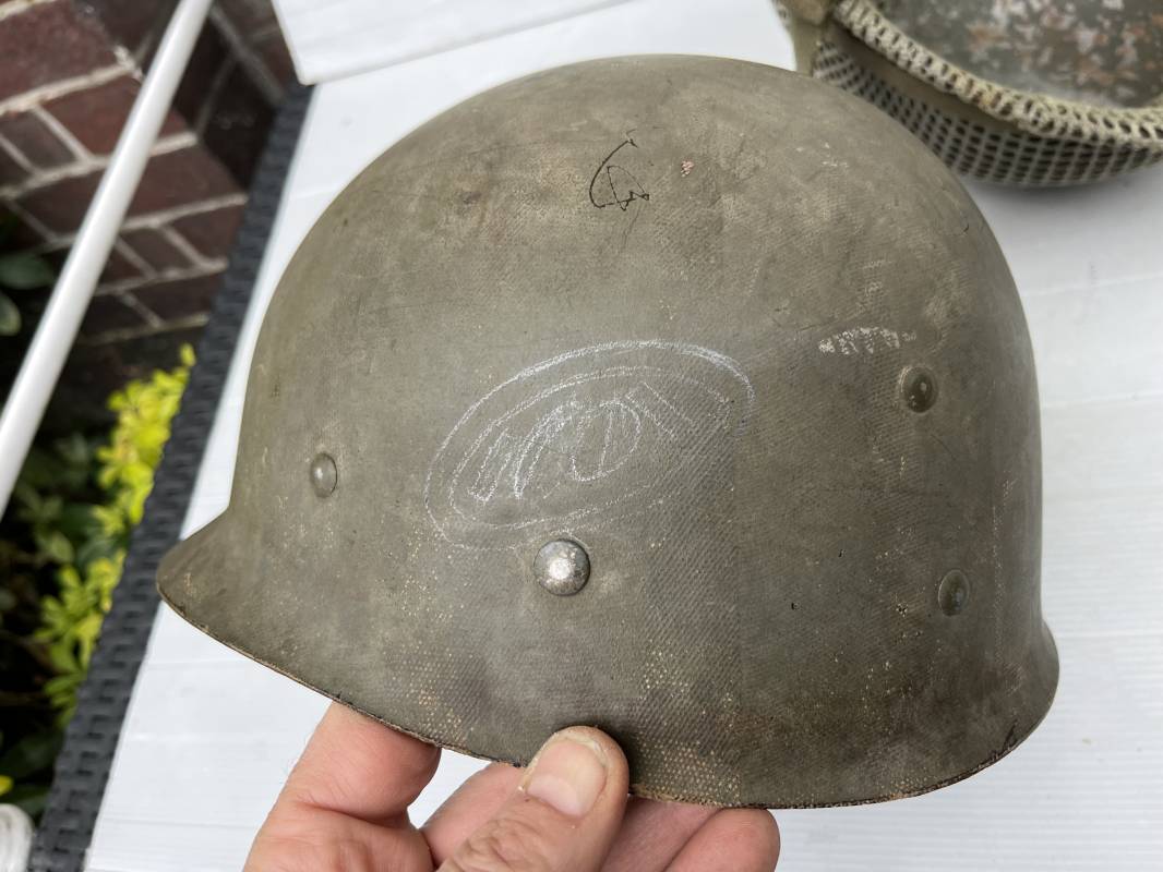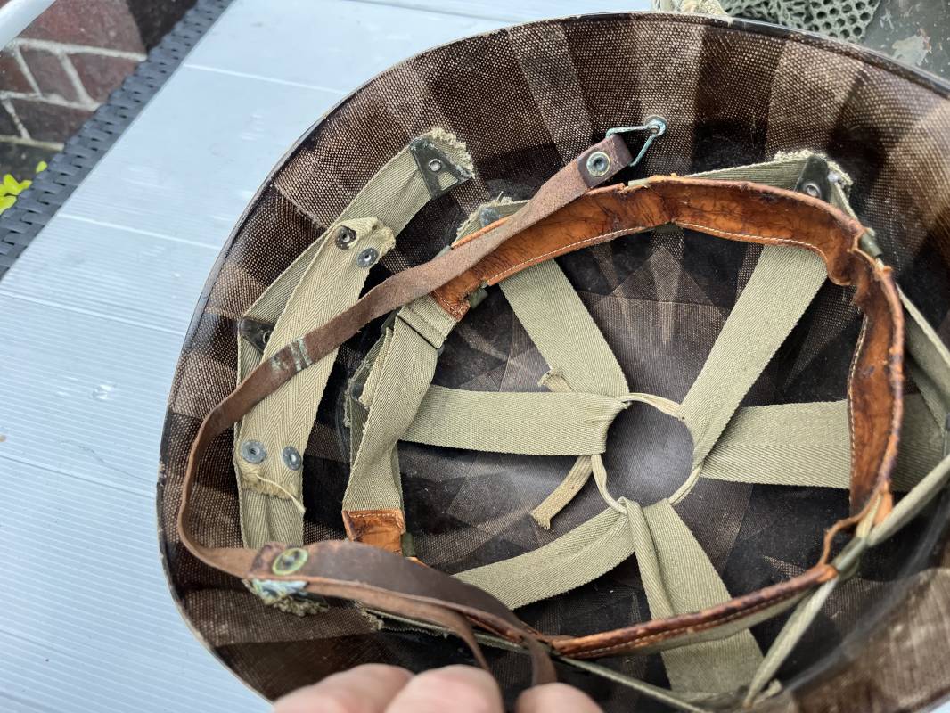 Très beau casque Américain USM1, jugulaire à pontet mobile et son filet Mdle 1943 monté d origine . Casque léger (Liner) en fibre compressée. Peinture olive drap d'origine. Marquage fabricant Westinghouse en fond de bombe. Intérieur en toile. Bandeau de coiffe en cuir. Lacet coton. Nuquière en toile. Jugulaire en cuir marron foncé d'origine , passants et boucle à clapet en laiton noirci , cuir souple , rivets marqués 'United Carr' . Casque lourd ; Coque avec jonc avant Fabricant Mc Cord . Chiffres sur le devant 2 B . Peinture mate OD d'origine. Pontets de jugulaires mobiles. Jugulaires en toile OD avec boucles en laiton noirci. Filet modéle 1943 monté d origine . Petites mailles en coton vert , bande en coton verte sur le pourtour Bon casque légèrement porté en parfait état . Fin 1944 , début 45. Ref 19837