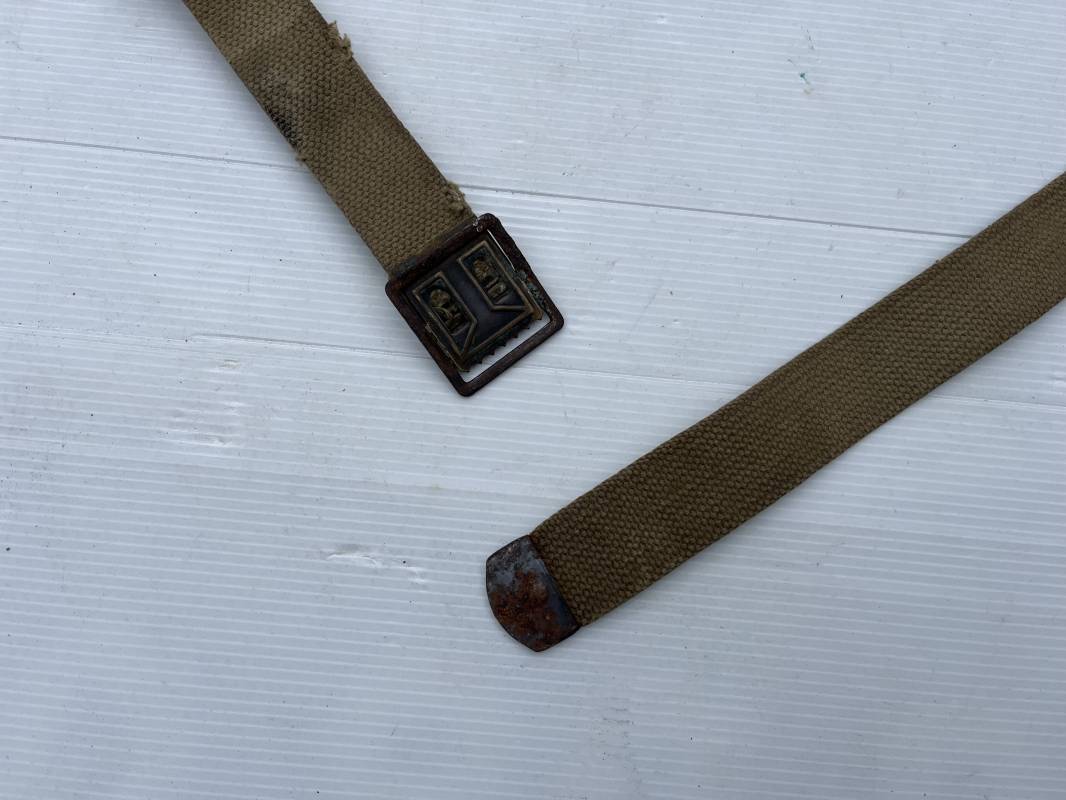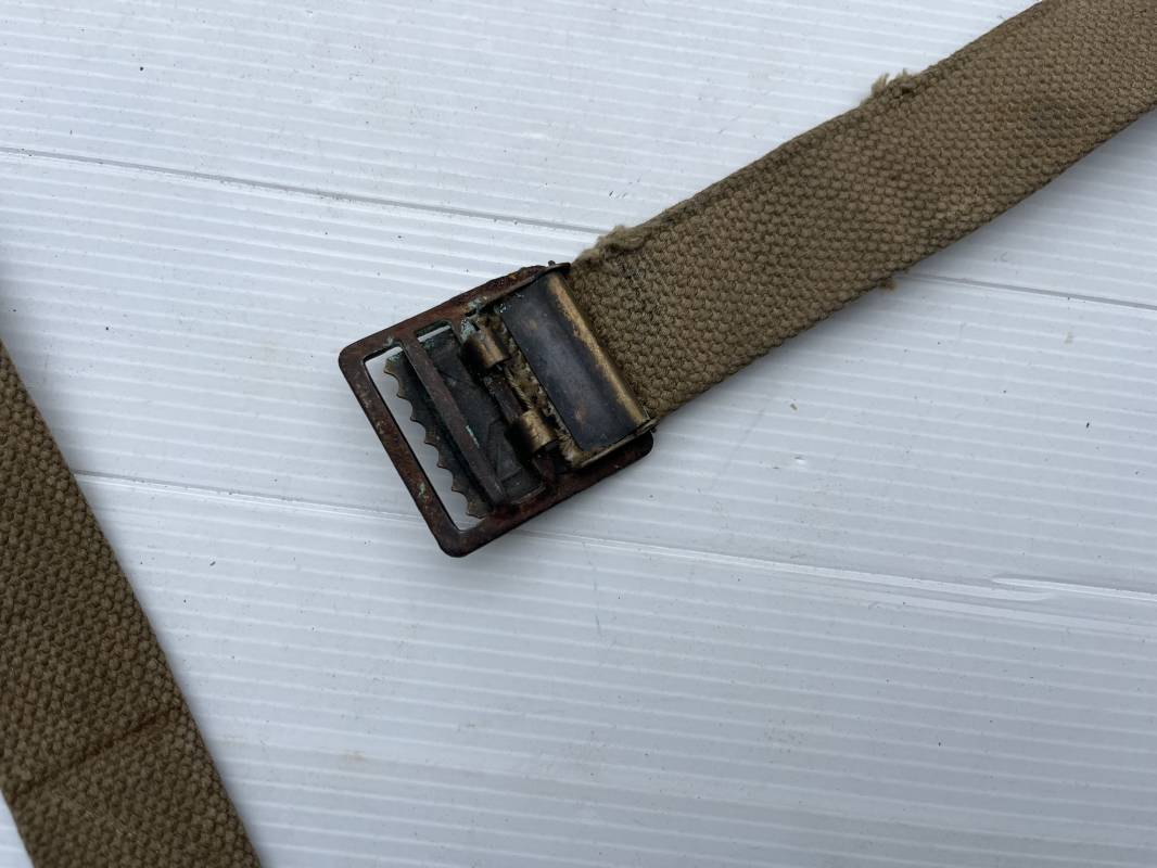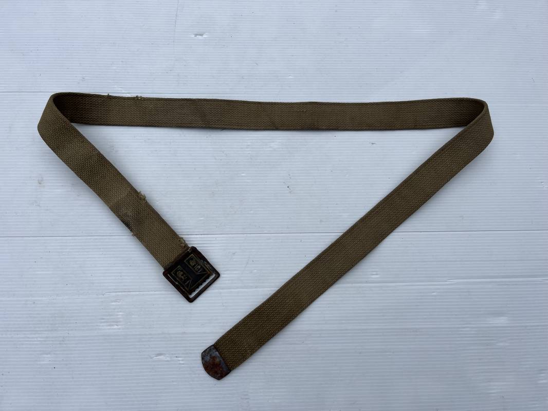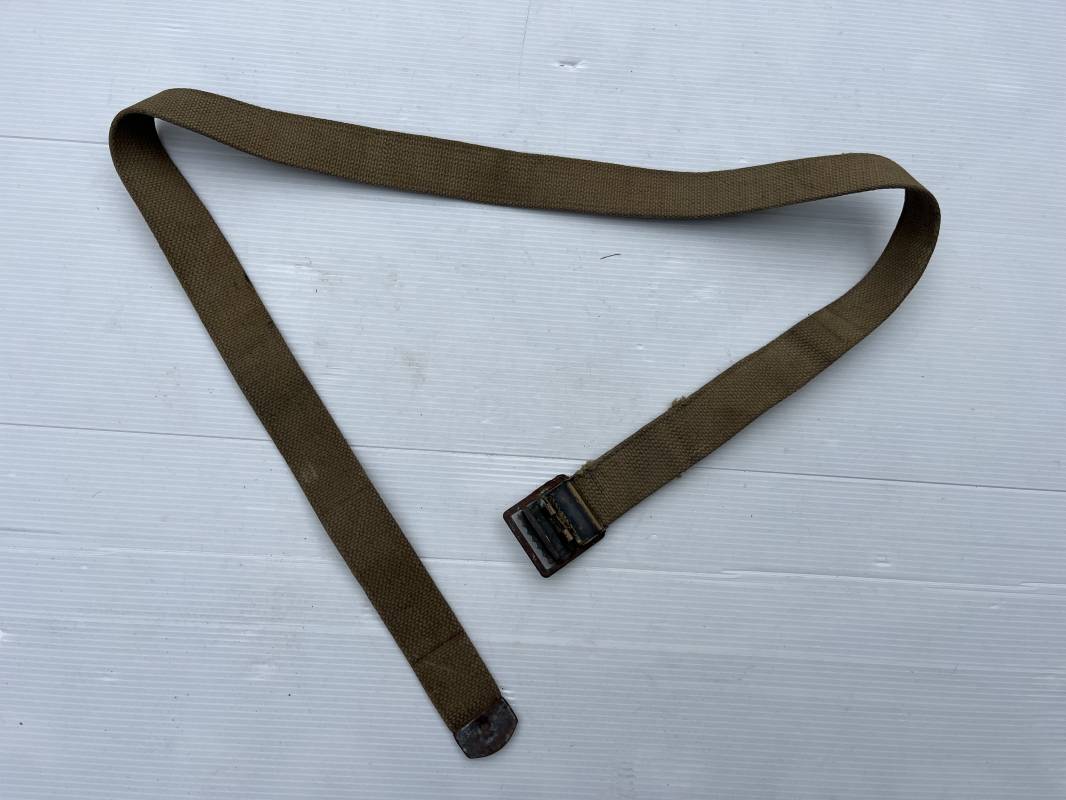 Ceinture de pantalon modéle 1937 Belt Web M1937 . Pantalon du modéle troupe de couleur kaki . Boucle sans ardillon en laiton et fer noirci . Embout métallique . Longueur 113 cm . Ceinturon porté , trouvé en brocante Avranches ( 50 ) Ref 21318