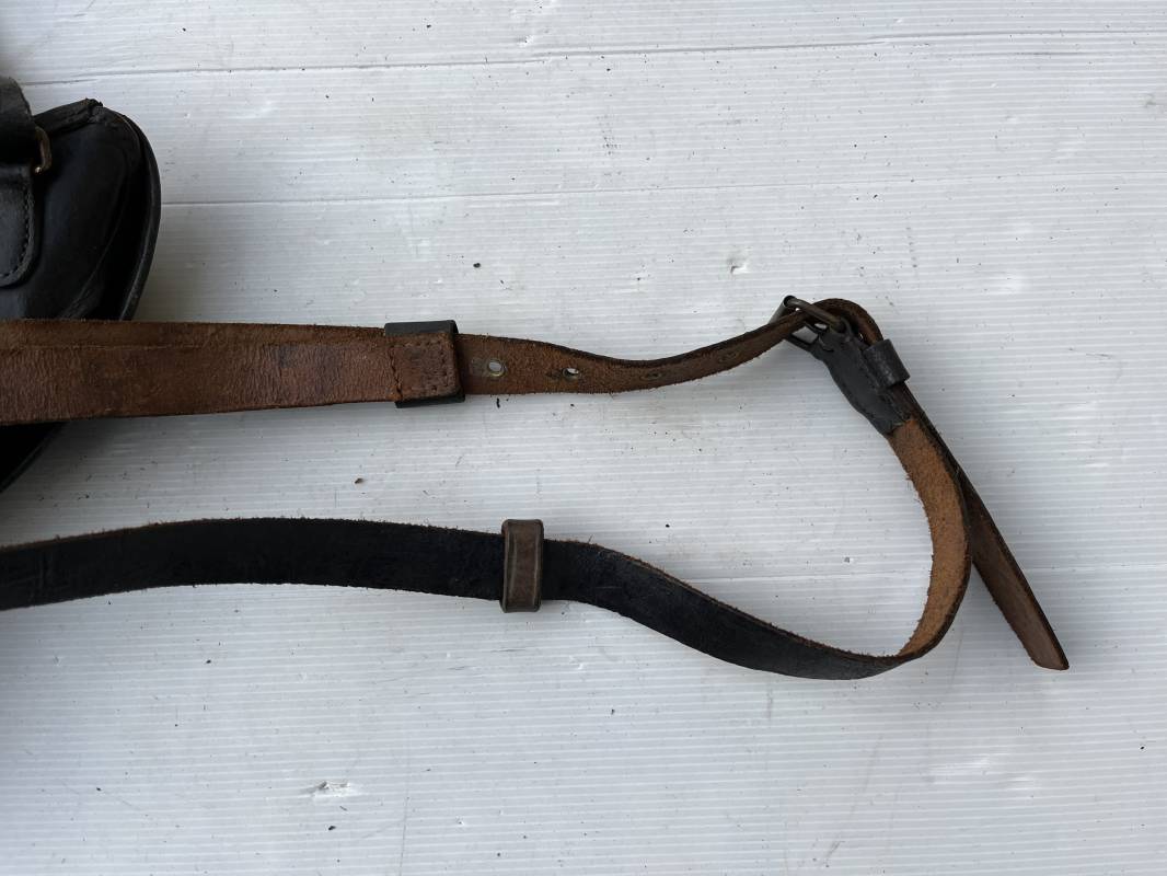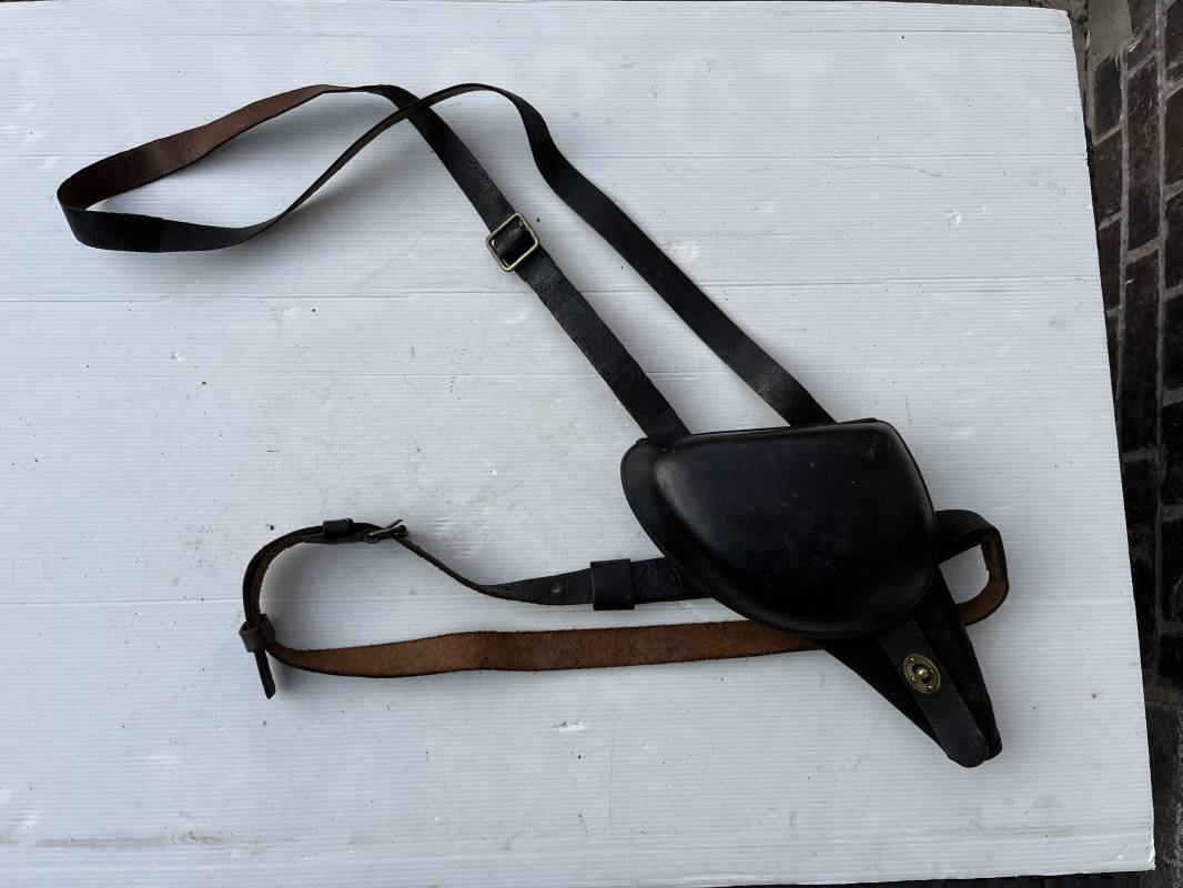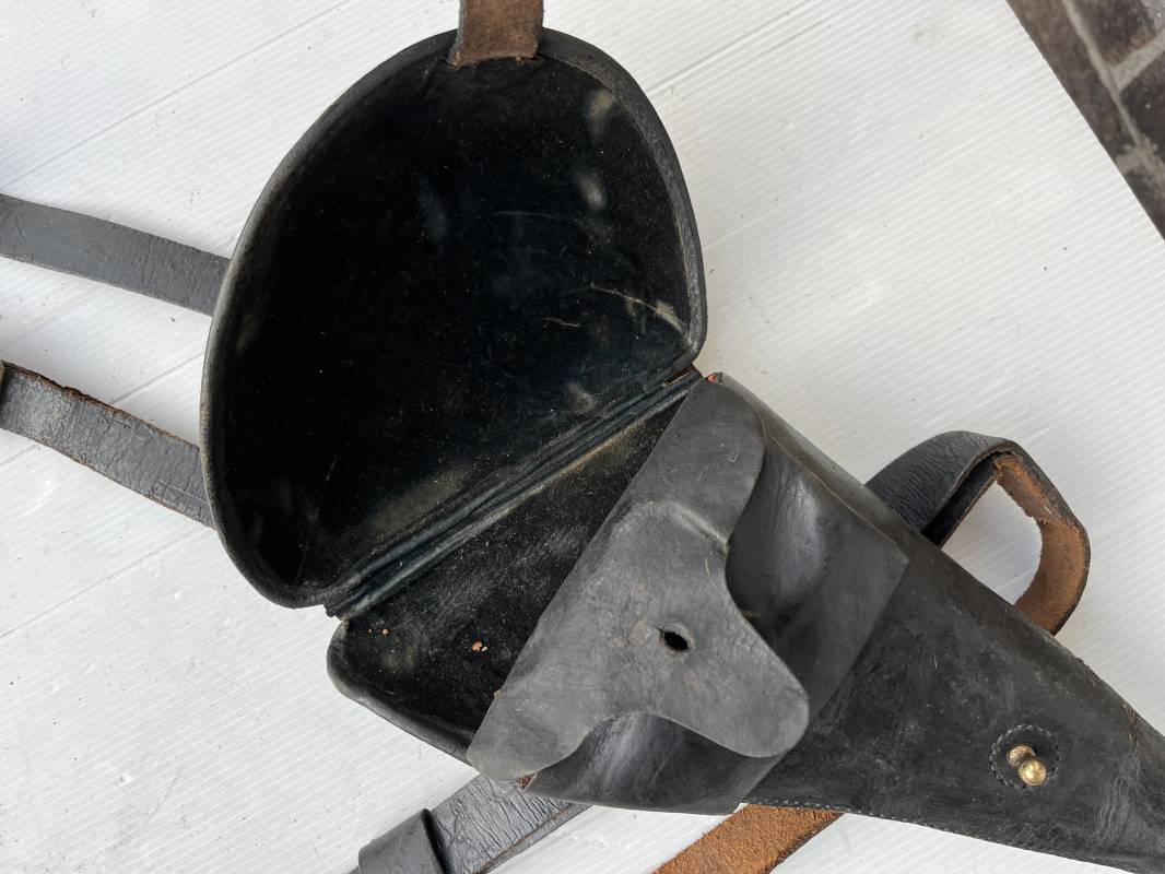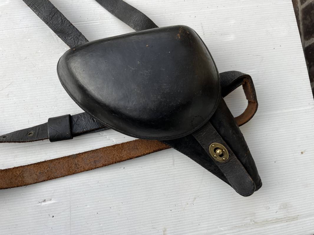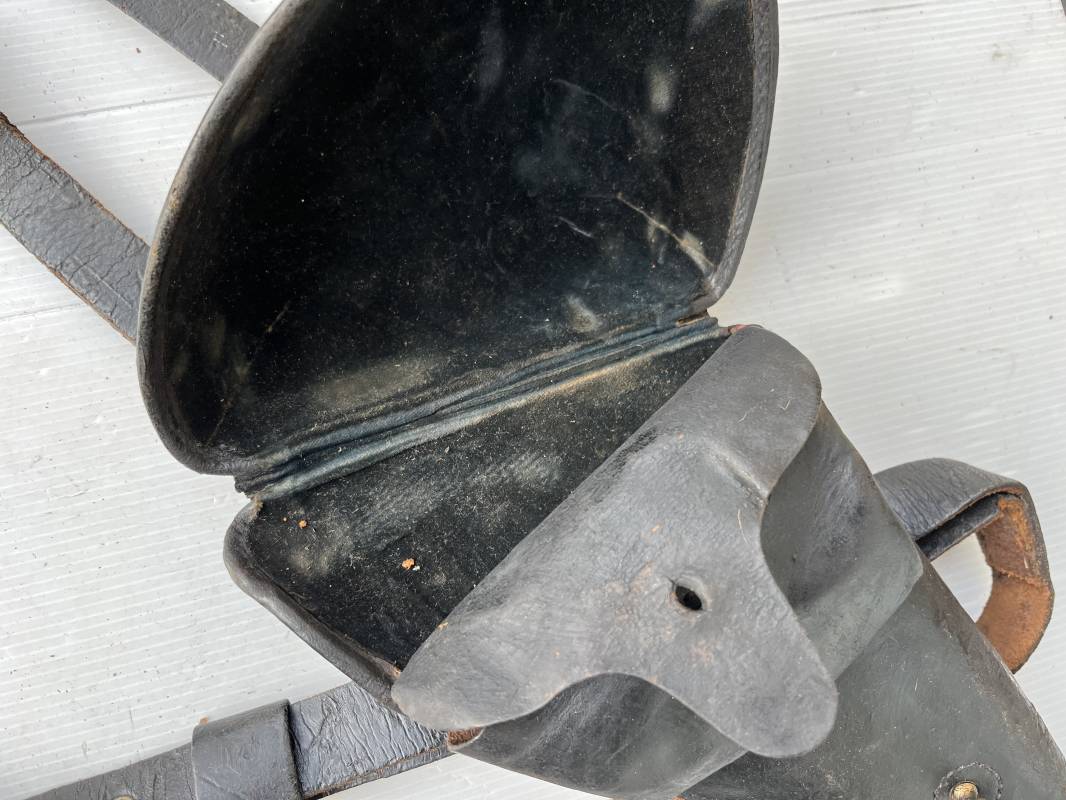 Rare brelage d'un officier en cuir noir typique mobilisation en Aout 1914 . Ceinturon officier modèle 1893 en cuir noir avec boucle en laiton à un ardillon. Passant cuir mobile et double ceinture à coulisse . Longueur totale 110cm, cuir souple. Étui révolver modèle 1892 dit "étui jambon" avec passant de ceinturon. Baudrier et boucle et rivets laiton. Rabat avec téton de fermeture. Pochette à munitions et alvéoles intèrieures. L etui revolver est un modele dit de luxe doublé en velours noir Belle forme jambon .Bon brelage légèrement porté en bon état 1914/15 Ref 21121